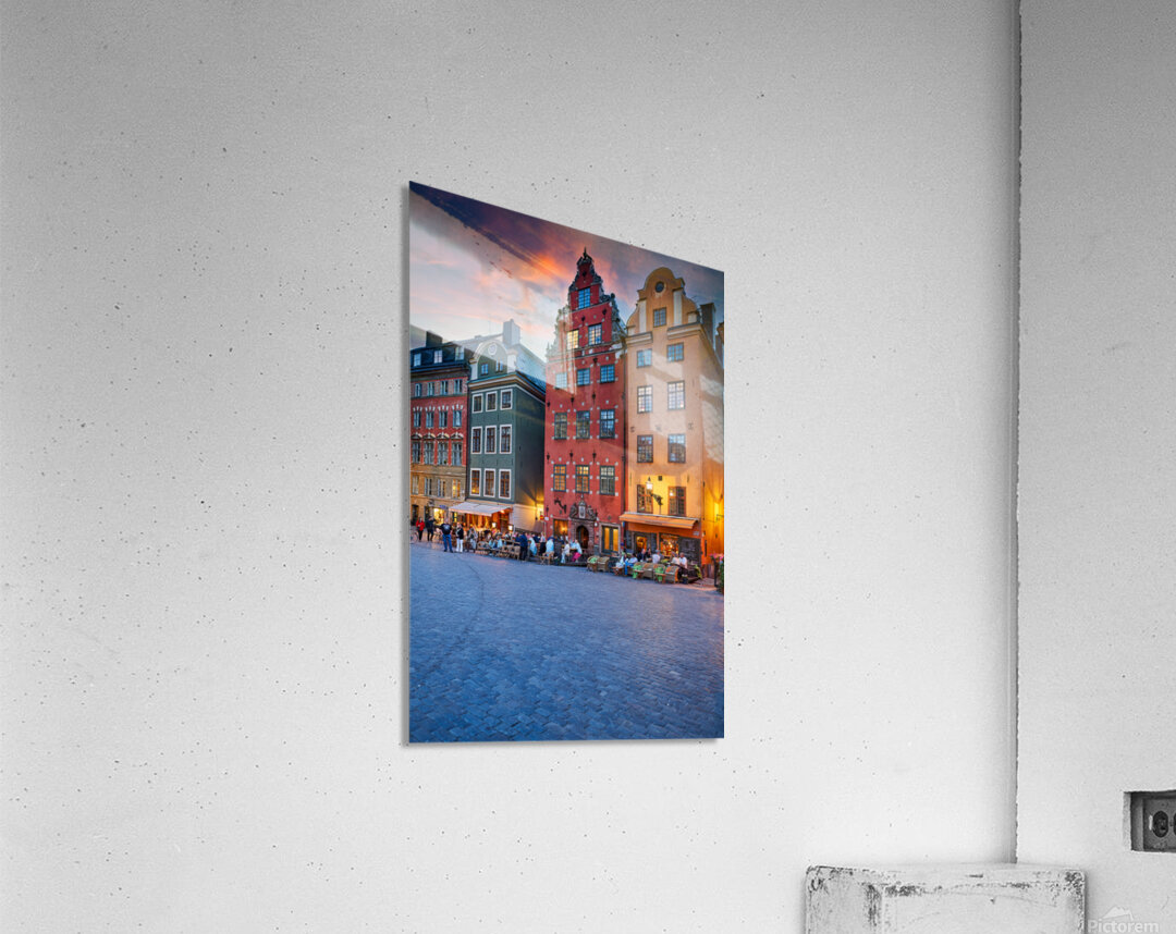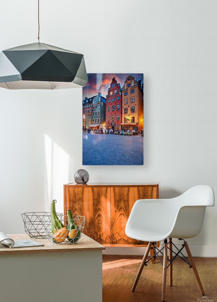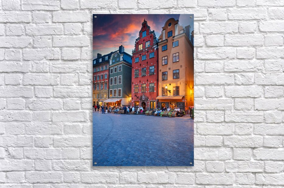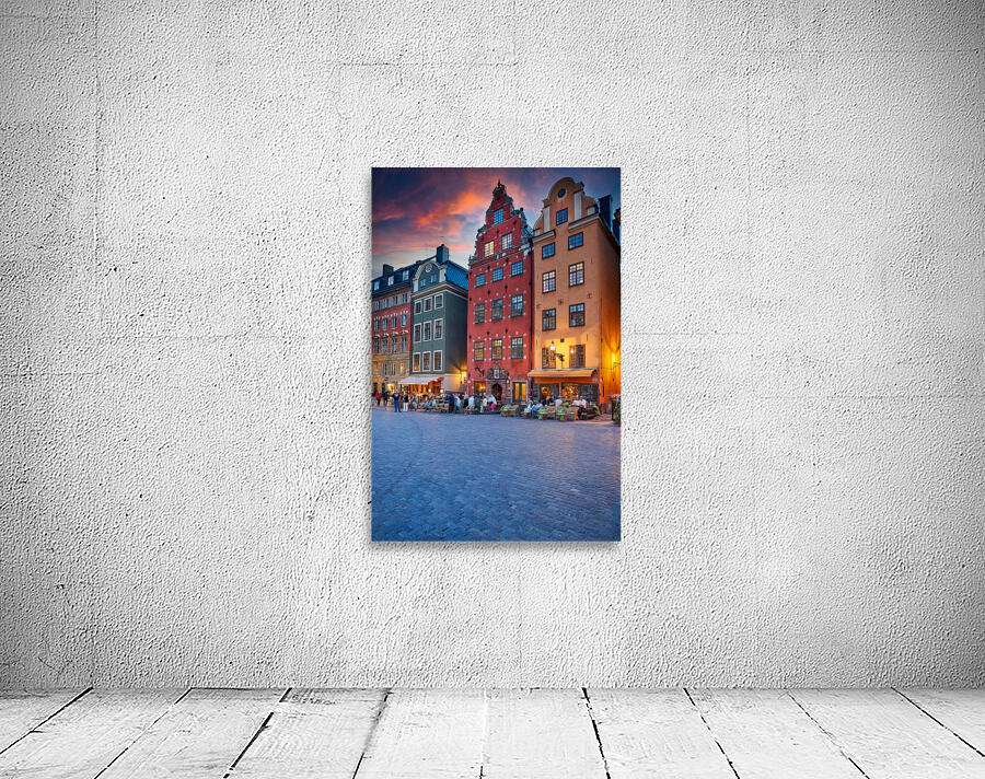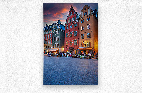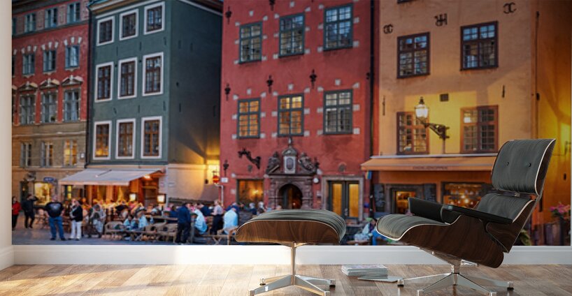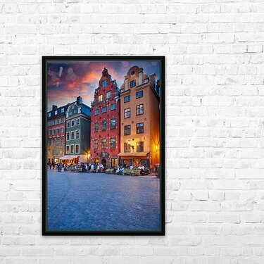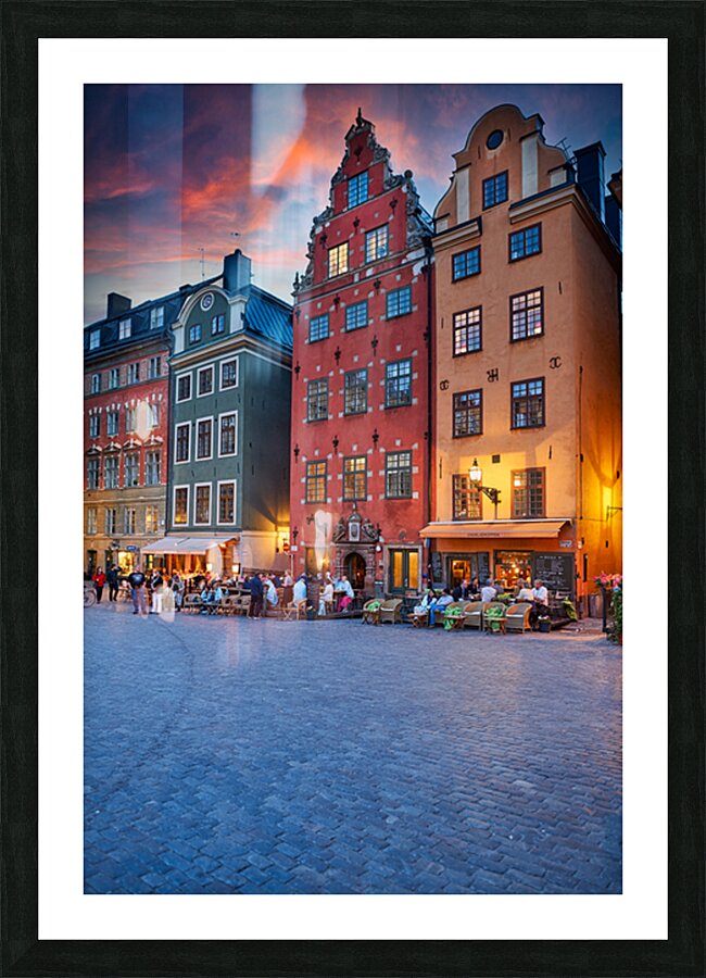 "Stortorget square buzzing with people in Gamla Stan" in a framed print.