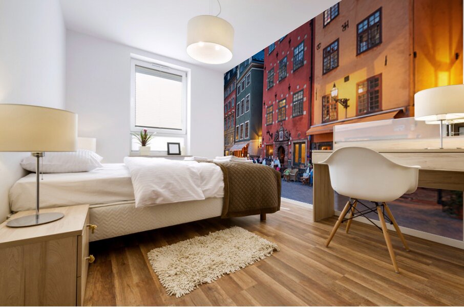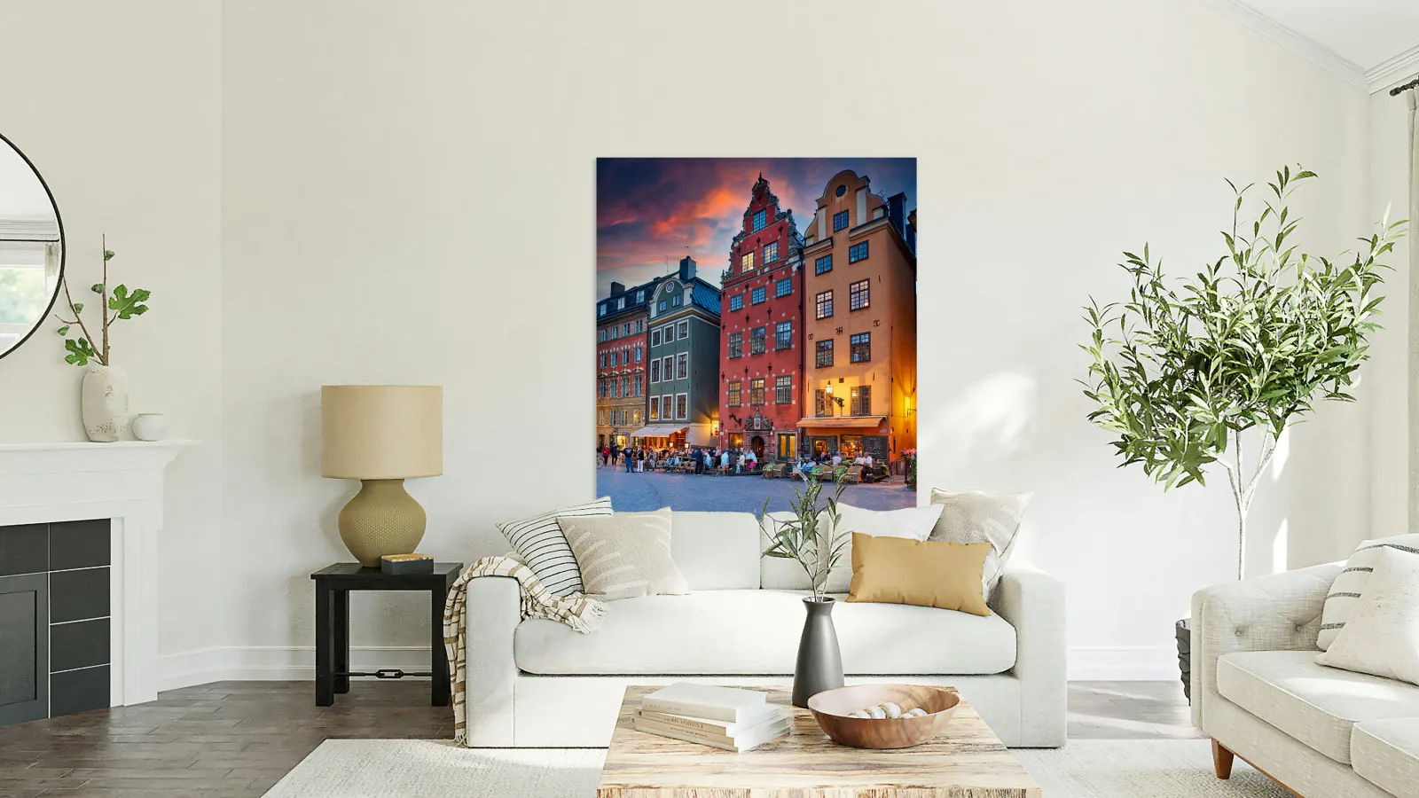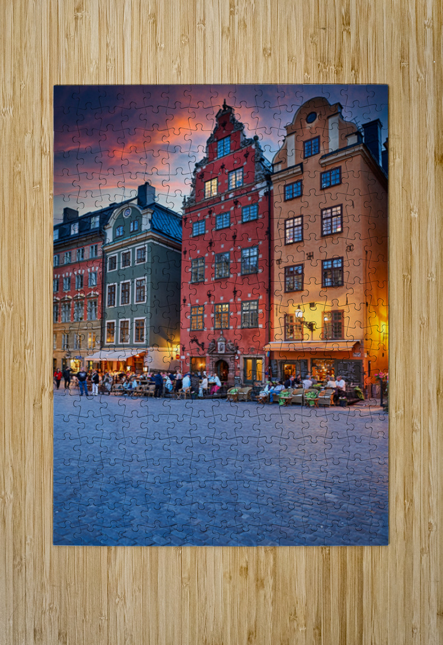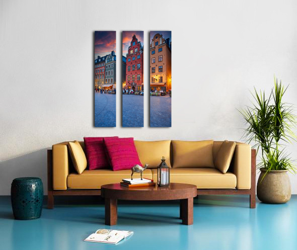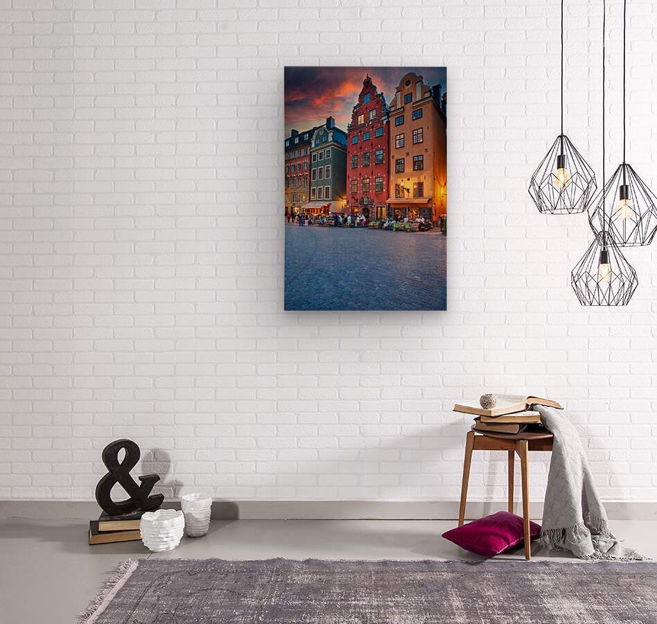 "Stortorget square buzzing with people in Gamla Stan" in a framed print.