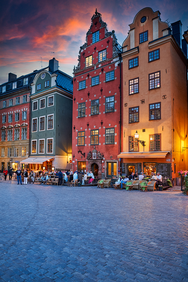 Visitors gather at Stortorget square in Gamla Stan as the sun sets. Cafes and buildings create a lively atmosphere in the old town.
