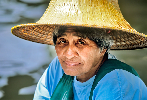 Vendors at Bangkok floating market sell vegetables and food from their boats to visitors on the water during a busy market day.