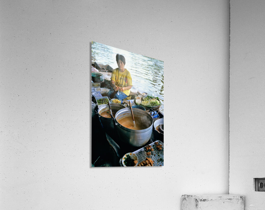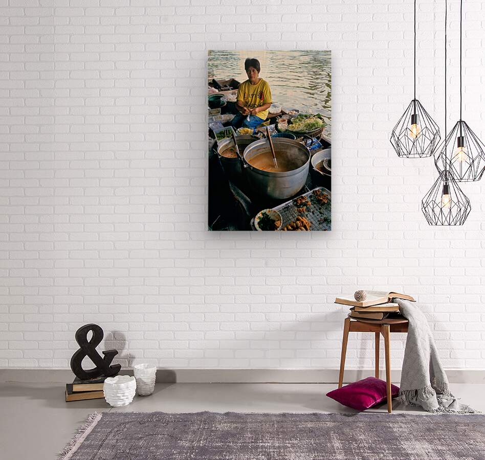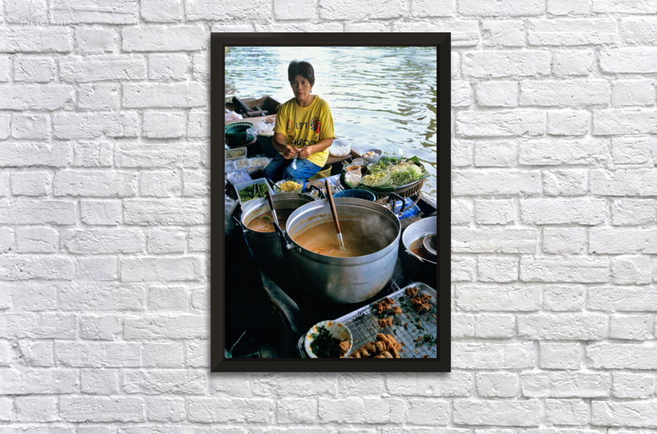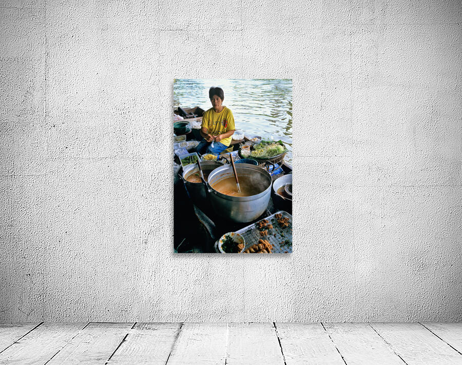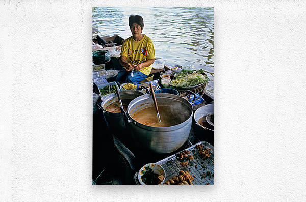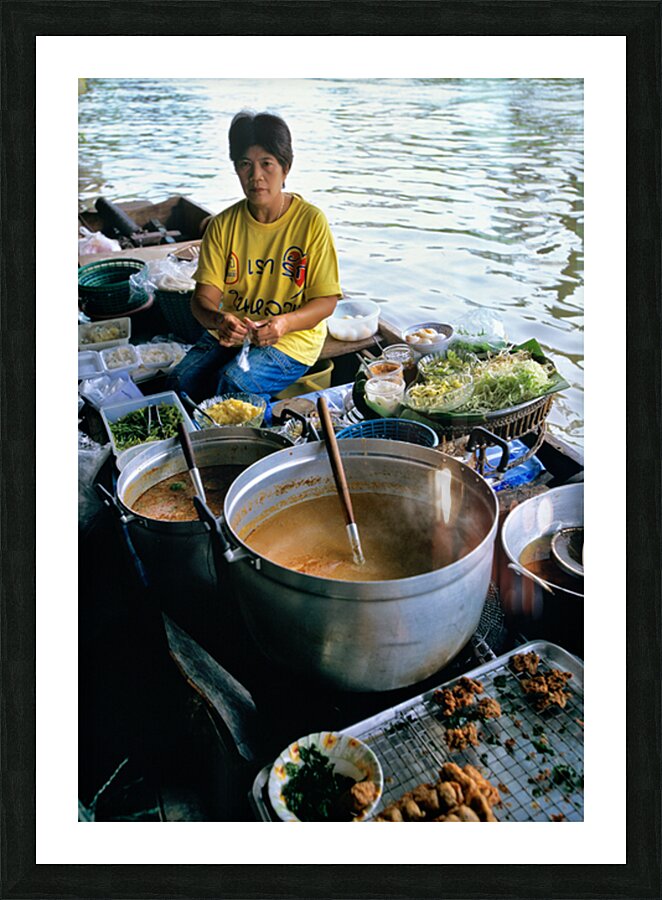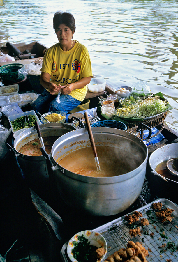 Vendors prepare meals on boats in Bangkoks floating market. Customers browse food options on the water. The market is busy with activity.