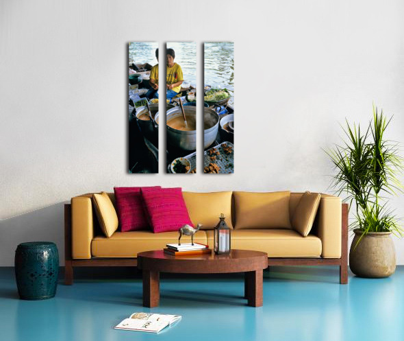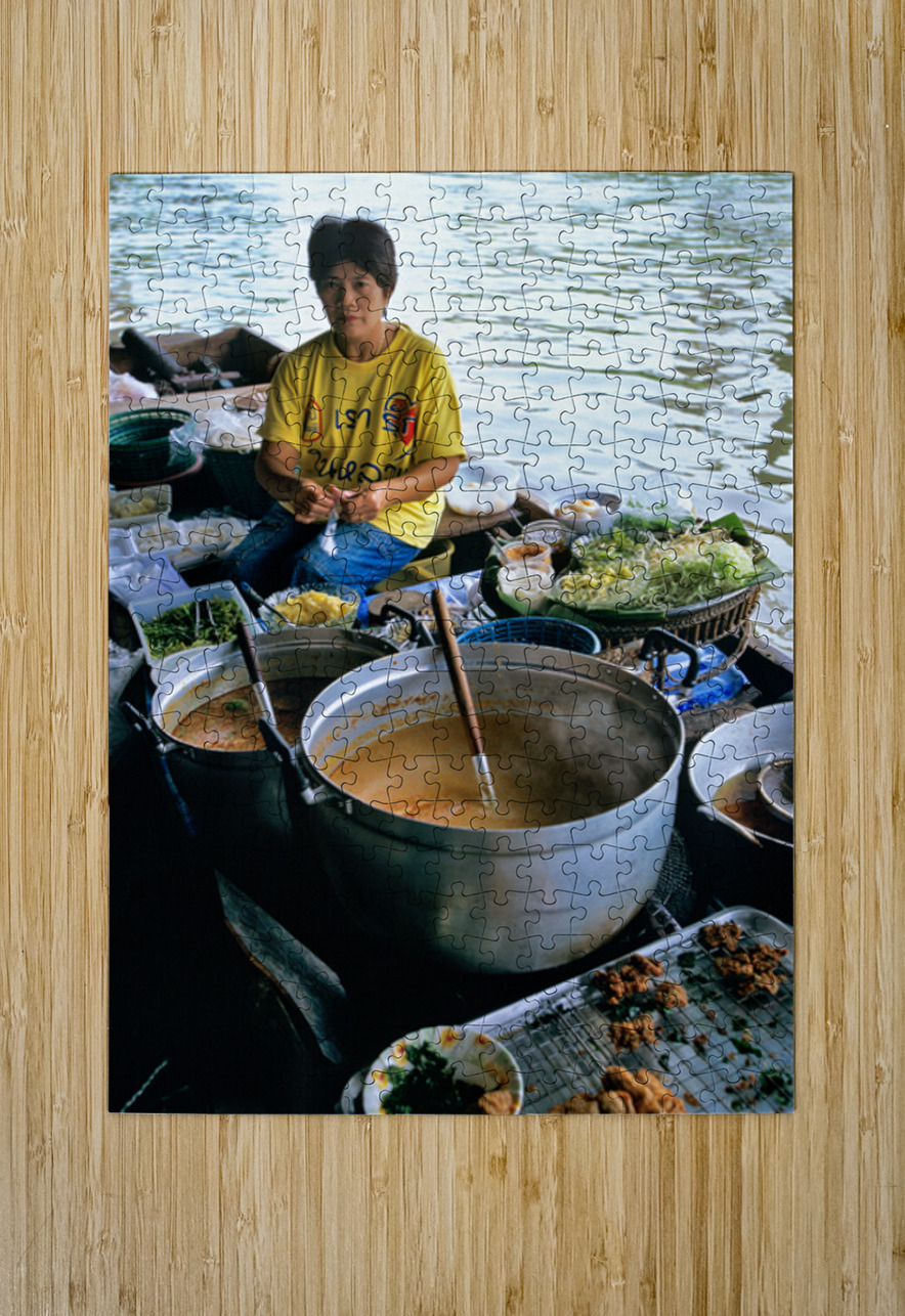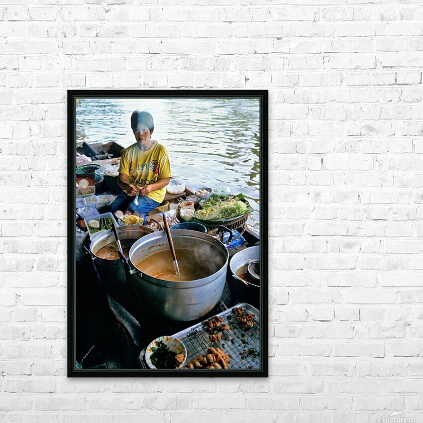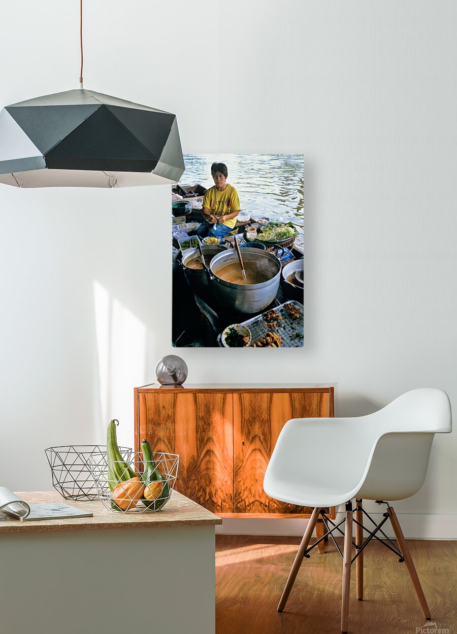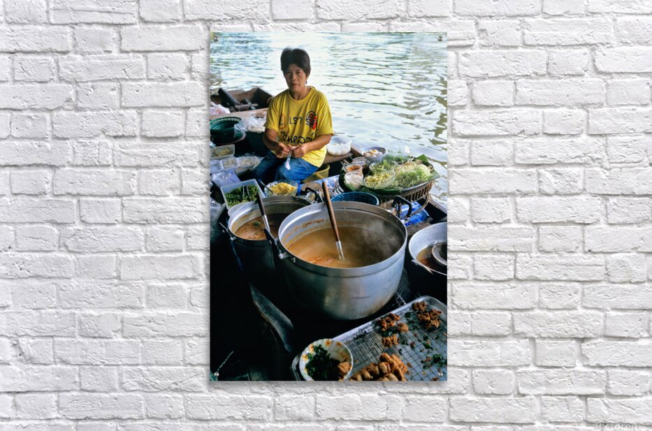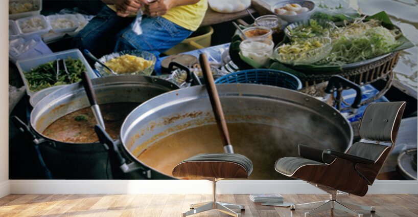 Vendors prepare meals on boats in Bangkoks floating market. Customers browse food options on the water. The market is busy with activity.