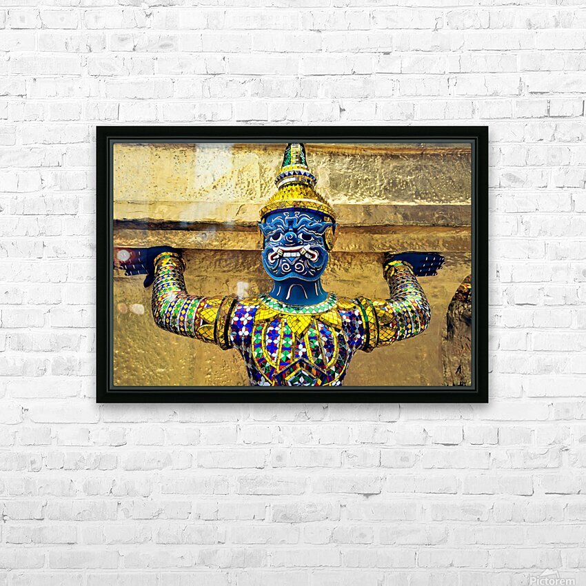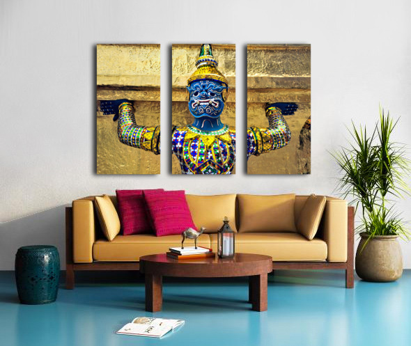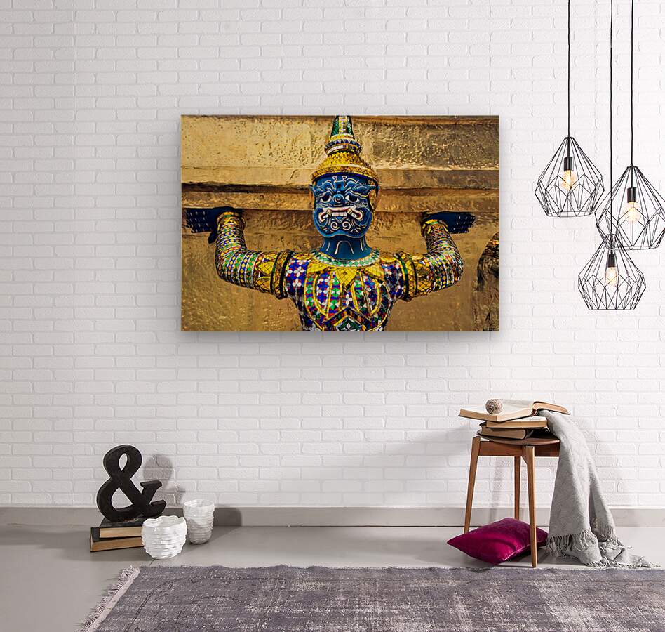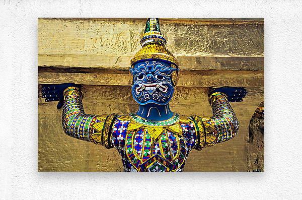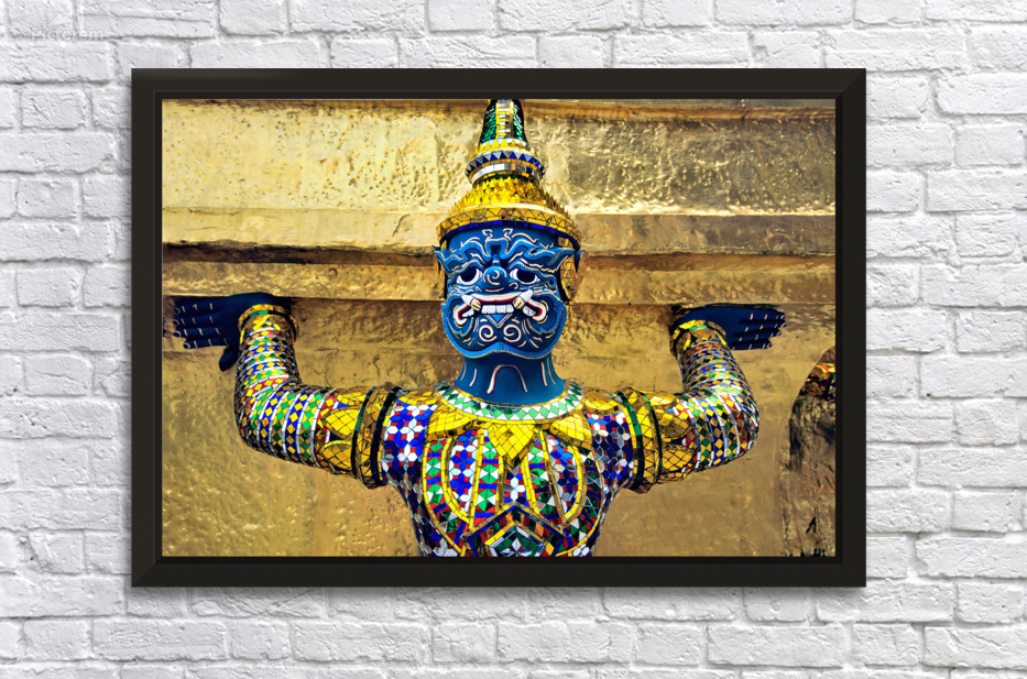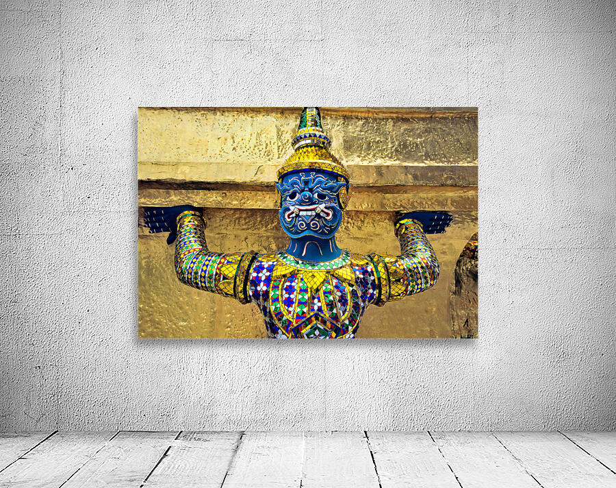 A colorful statue supports a part of the building at Wat Phra Kaew in Bangkok. Visitors admire this important site of Thai culture and religion.