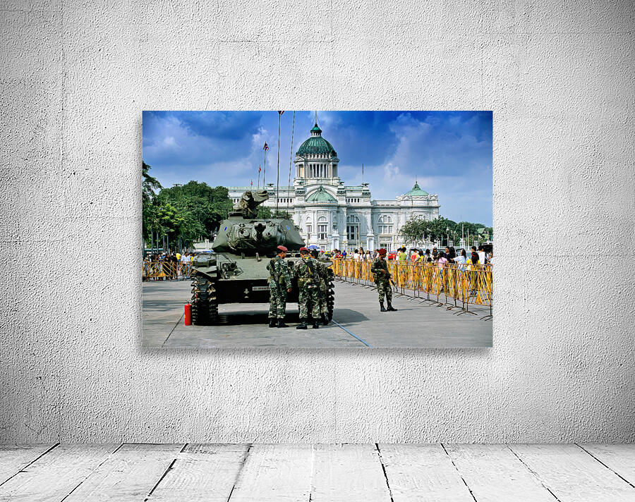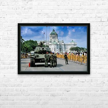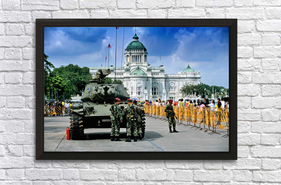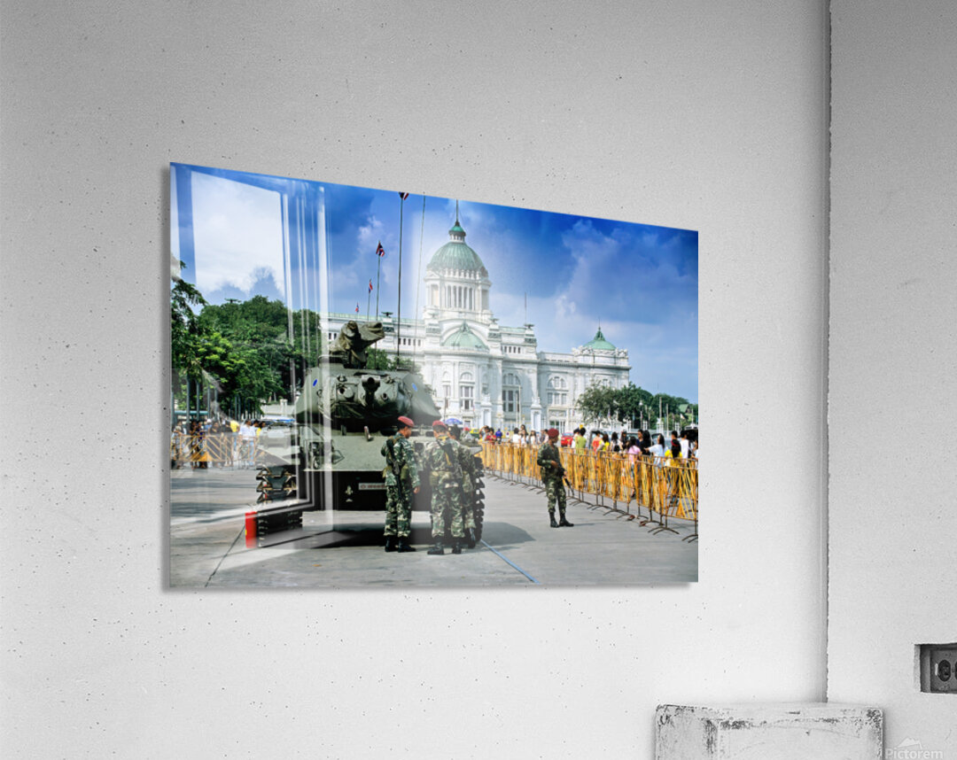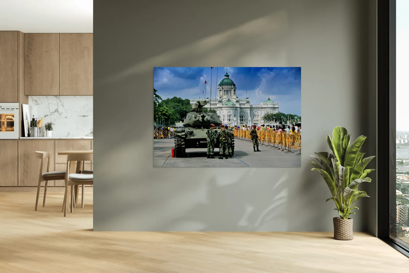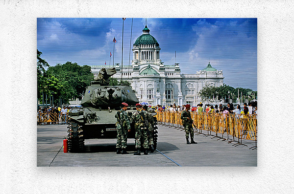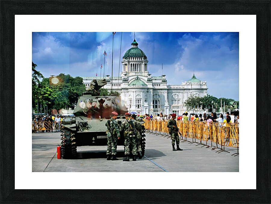 Military vehicles and soldiers stand in Bangkok during the 2006 coup with crowds gathering to show their support for the action.