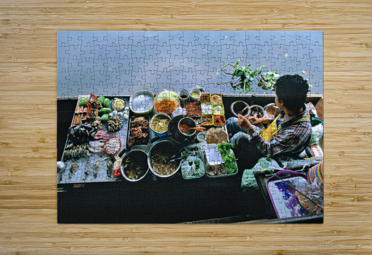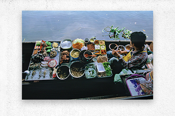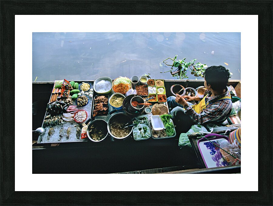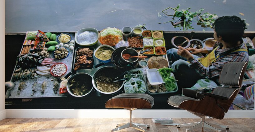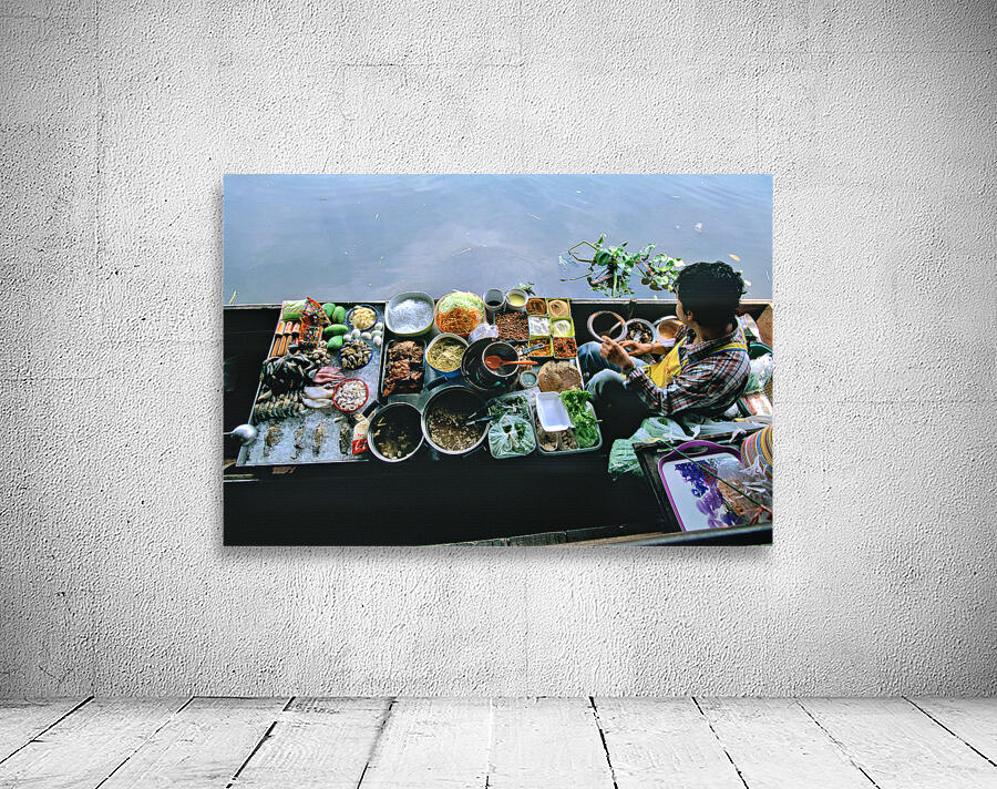 Vendors sell fresh vegetables seafood and dishes at the floating market in Bangkok. Customers visit to enjoy local food on the water.