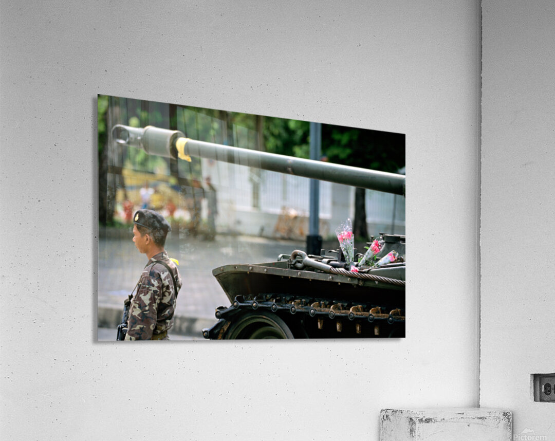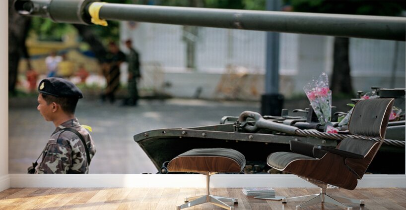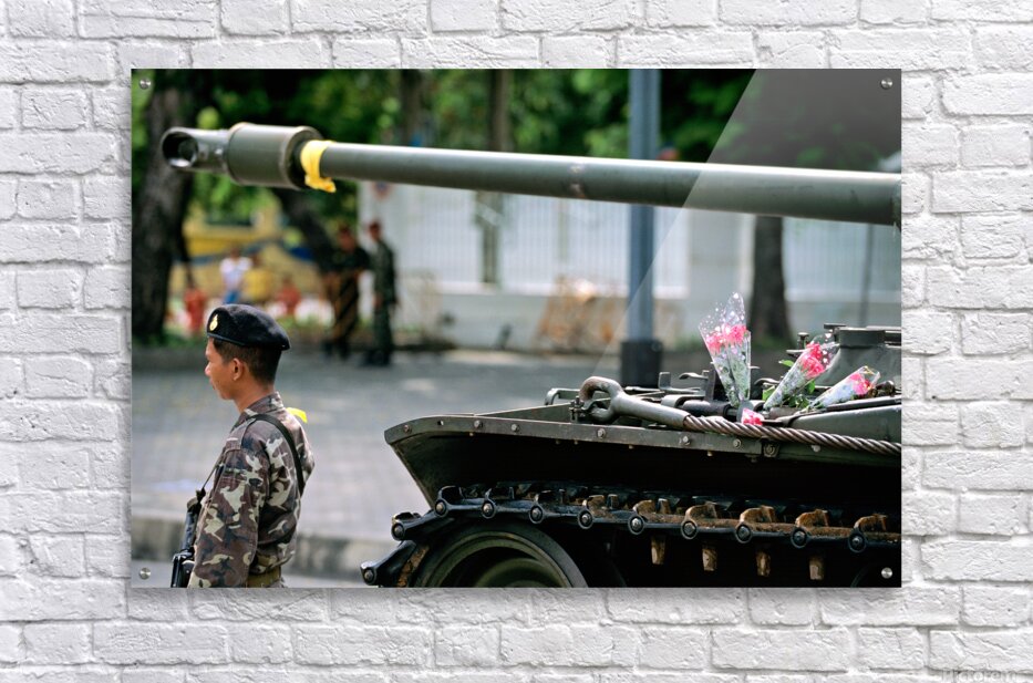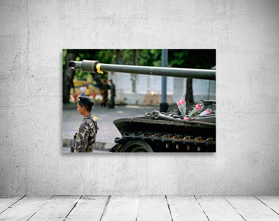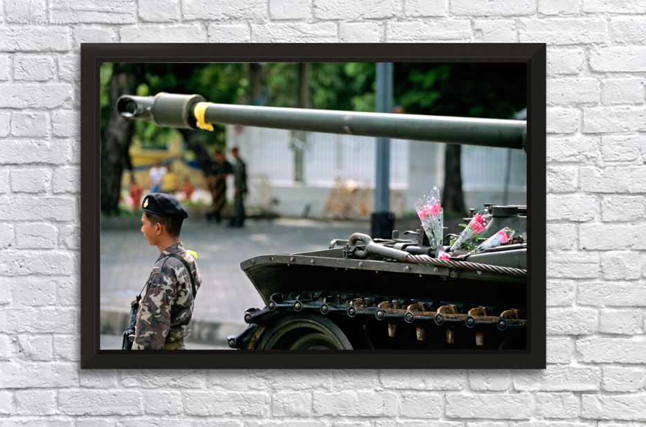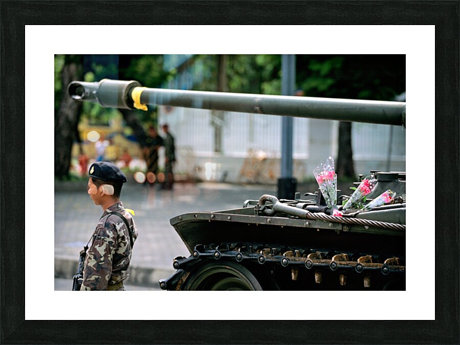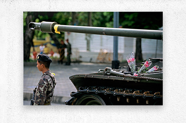 In Bangkok 2006 people show support for the coup detat by placing flowers on tanks while soldiers stand guard in the streets.