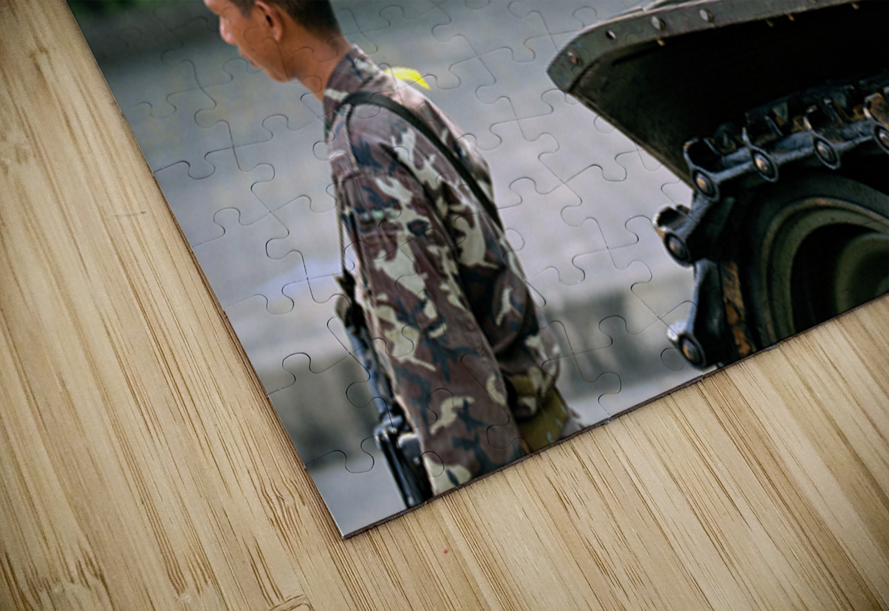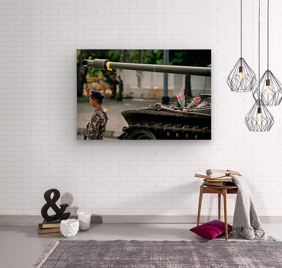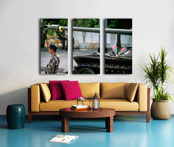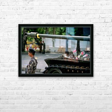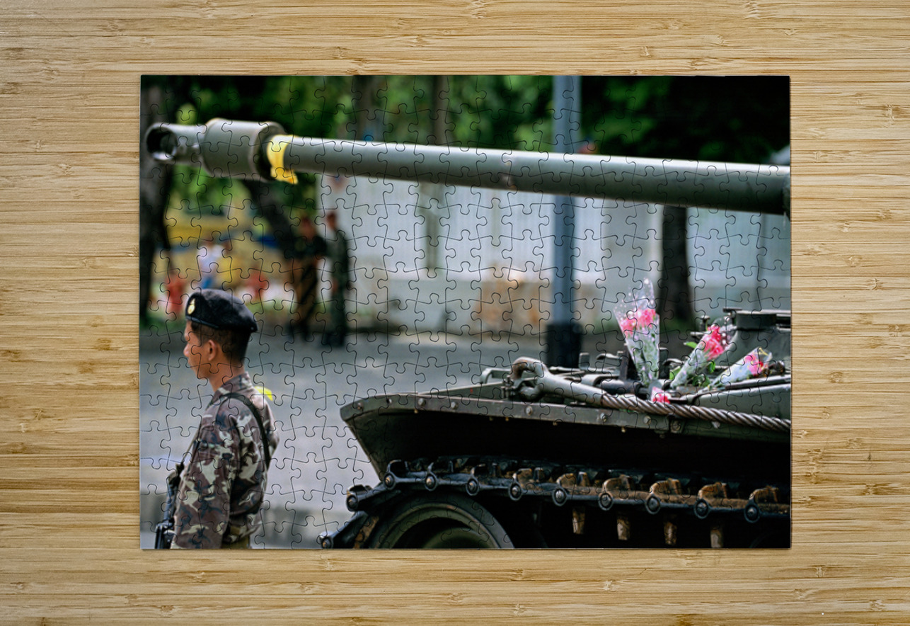 In Bangkok 2006 people show support for the coup detat by placing flowers on tanks while soldiers stand guard in the streets.