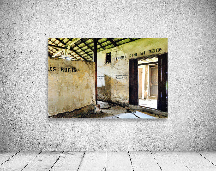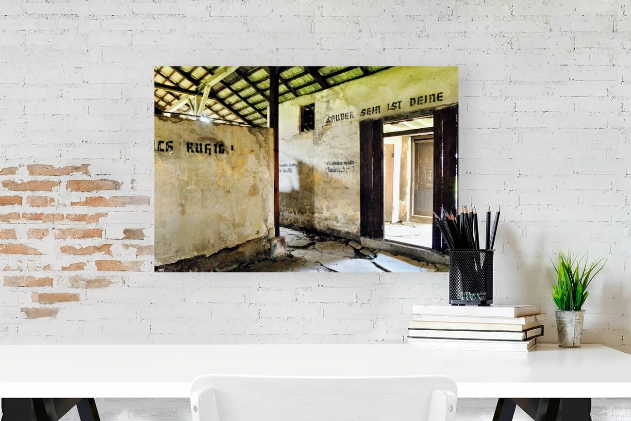 "Inside the barracks at Auschwitz concentration camp in Krakow" in a framed print.