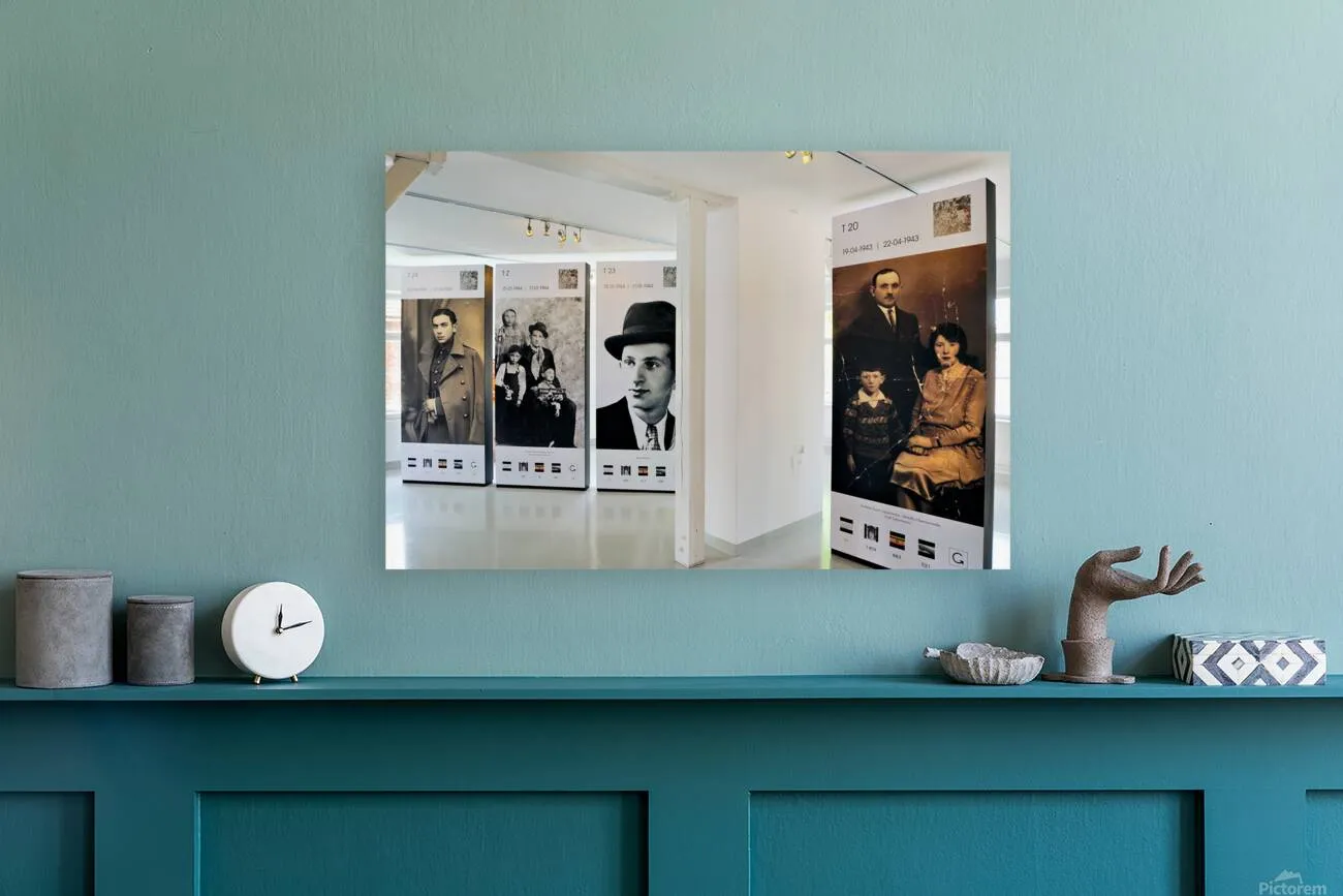 Visitors look at display panels featuring images of people affected by the Holocaust at Auschwitz concentration camp in Krakow.