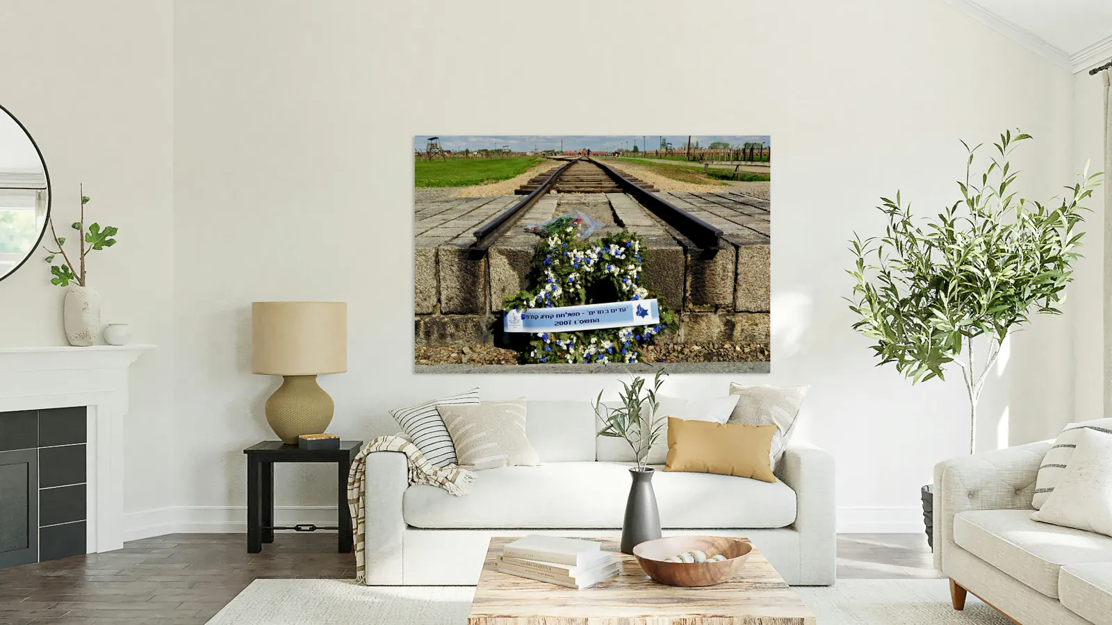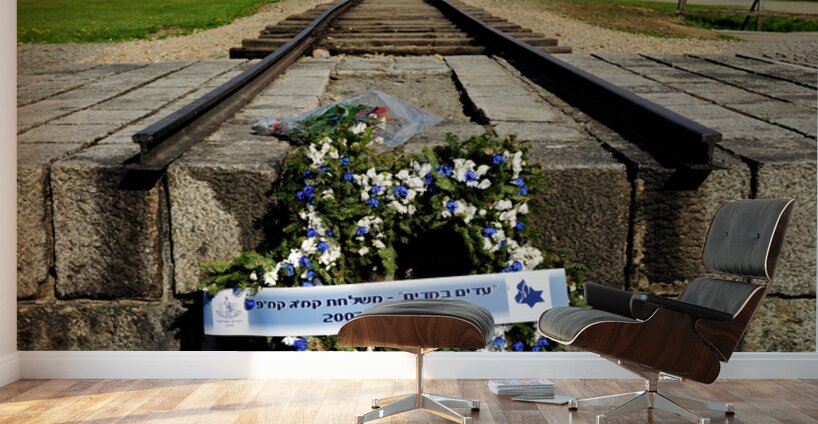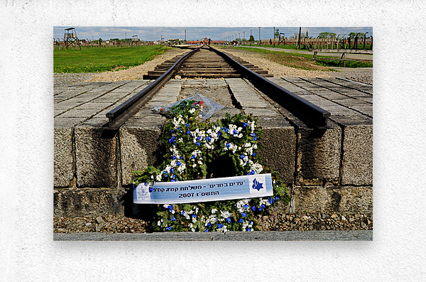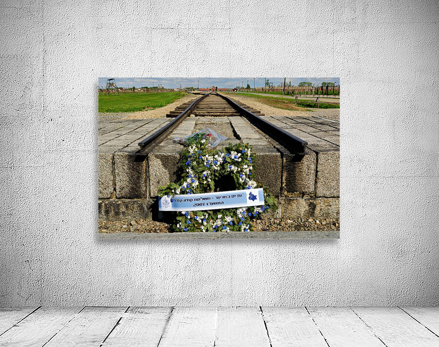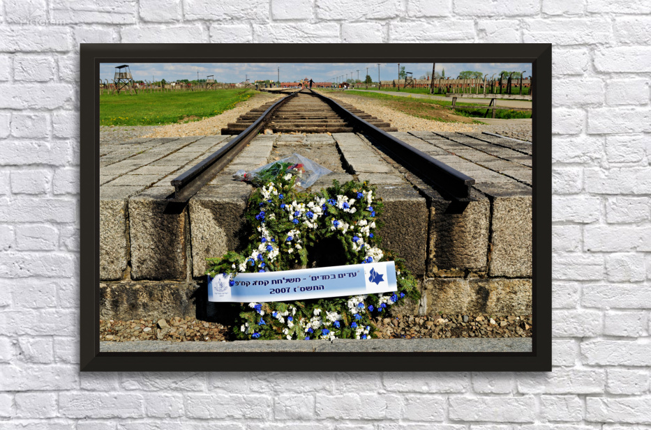 "Wreath placed at railroad tracks in Auschwitz concentration camp" in a framed print.