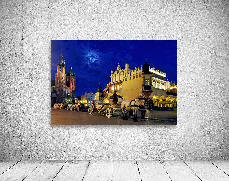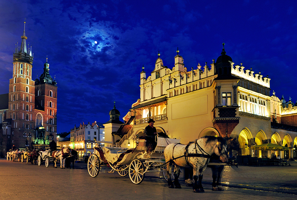 People enjoy the evening in Krakow as a horse-drawn carriage waits near the town square. The moon shines above the historic buildings.
