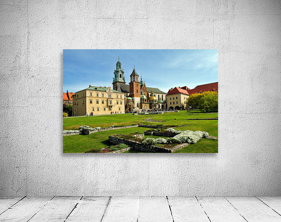 People walk around historic buildings in Krakow Poland. Green areas and flowers create an inviting scene during the day.