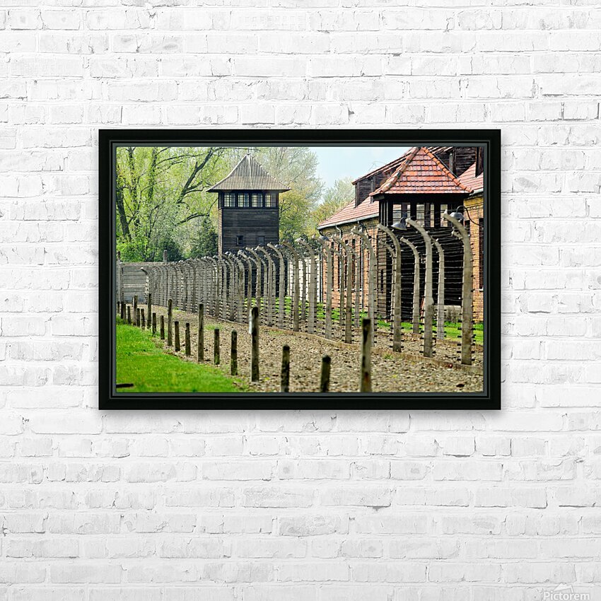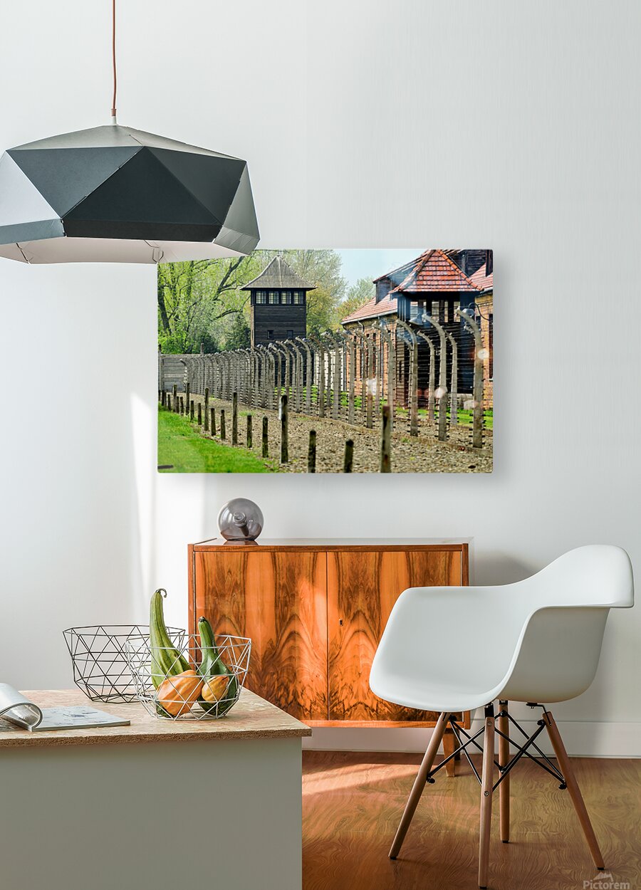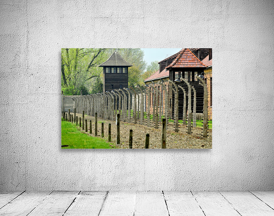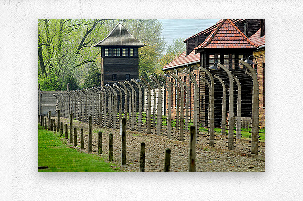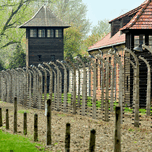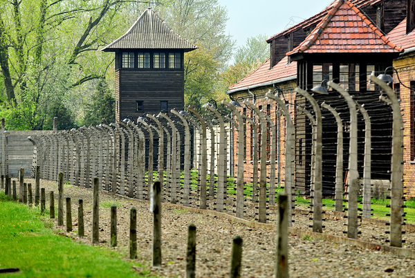 Visitors walk near the barbed wire and guard tower at Auschwitz concentration camp. The area shows buildings and a somber atmosphere.