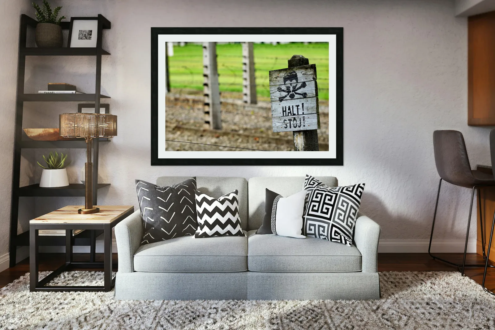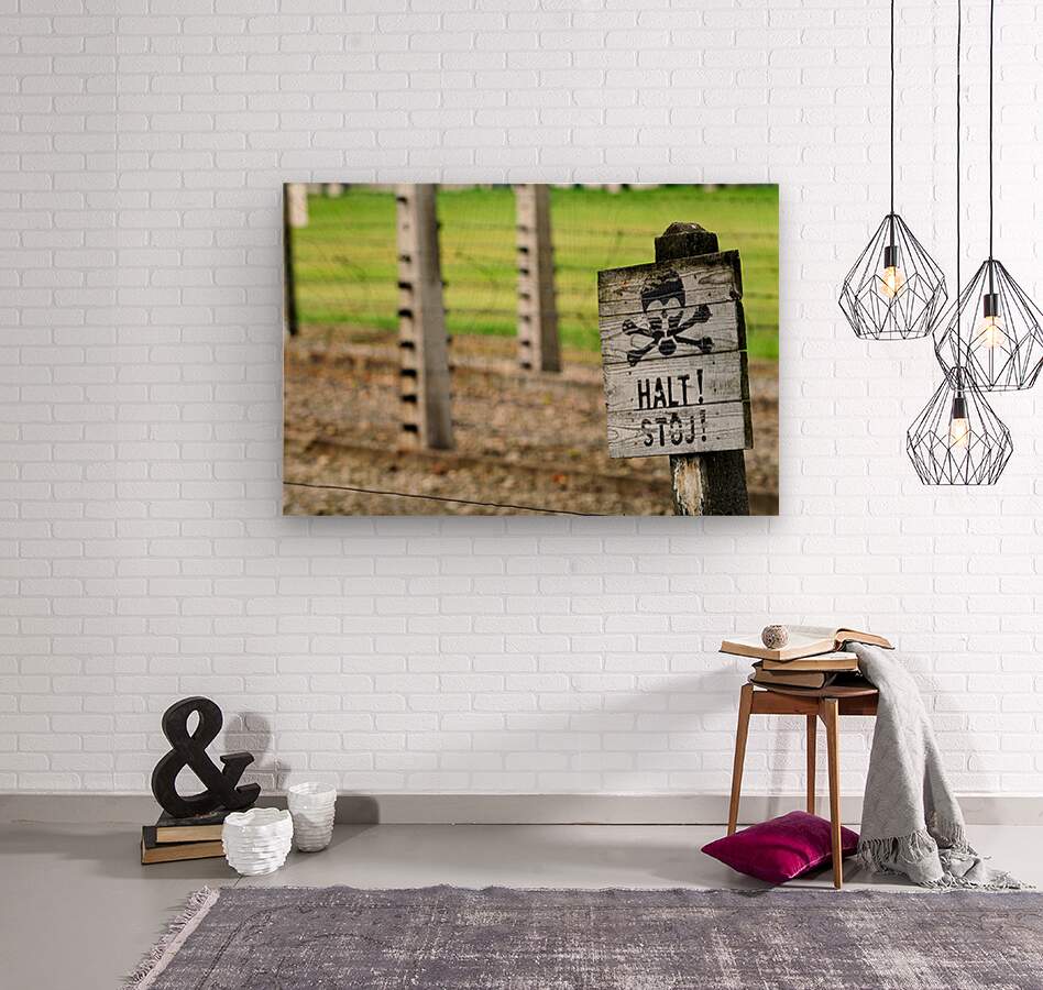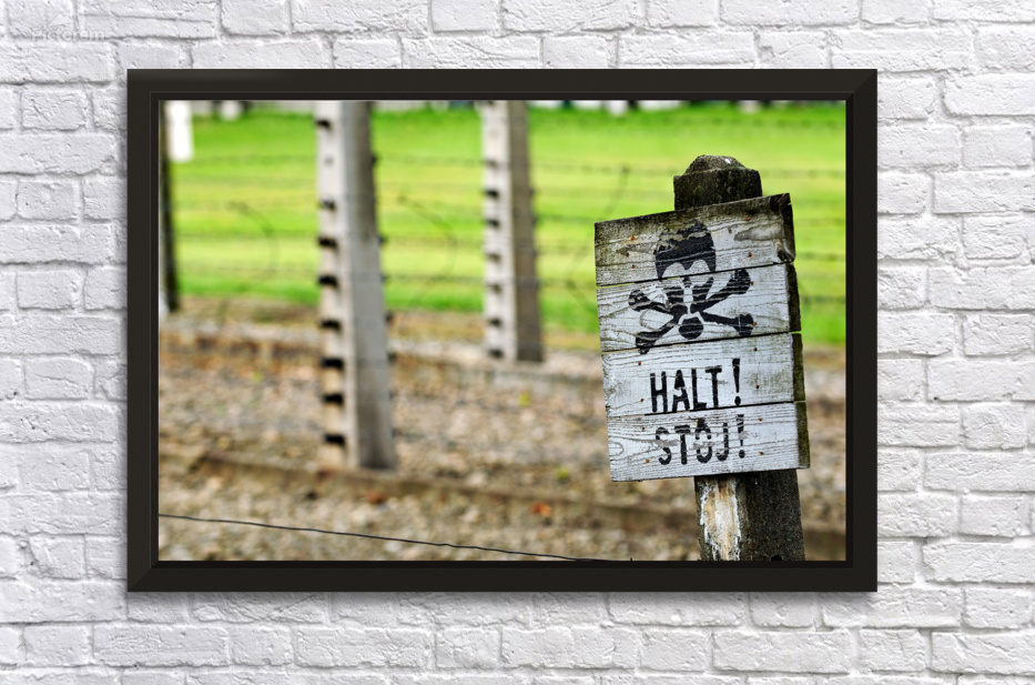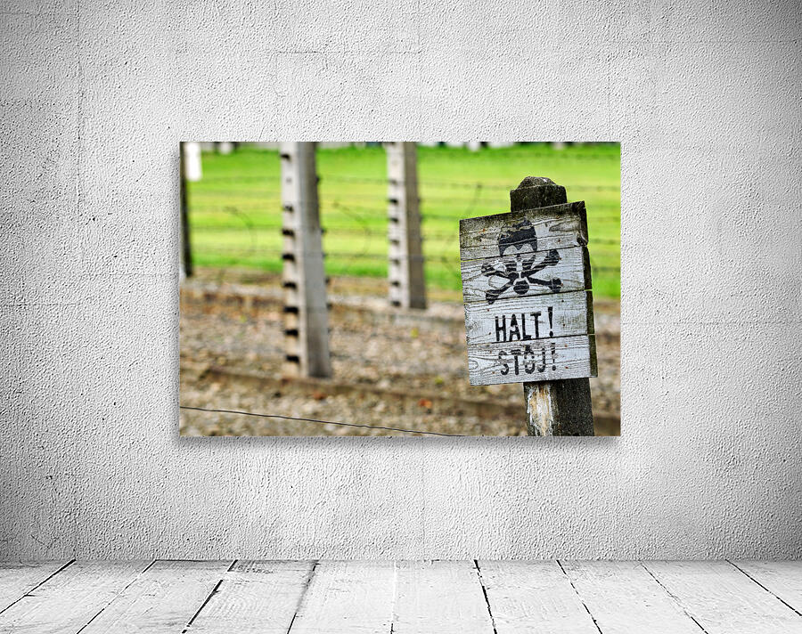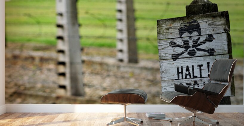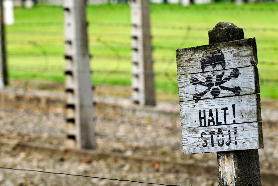 A warning sign stands near barbed wire at Auschwitz concentration camp in Krakow. The sign indicates danger to visitors in the area.
