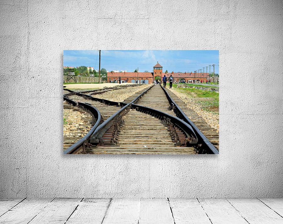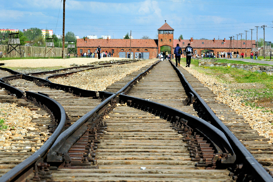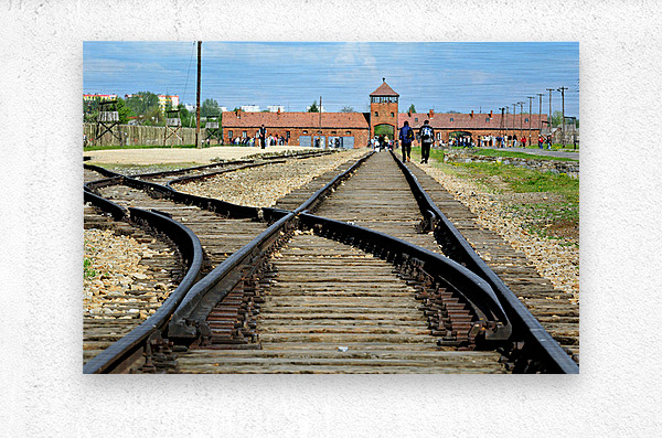 Visitors walk along the railway tracks leading to Auschwitz concentration camp in Krakow. The camp stands as a reminder of history.