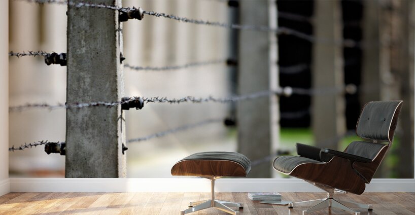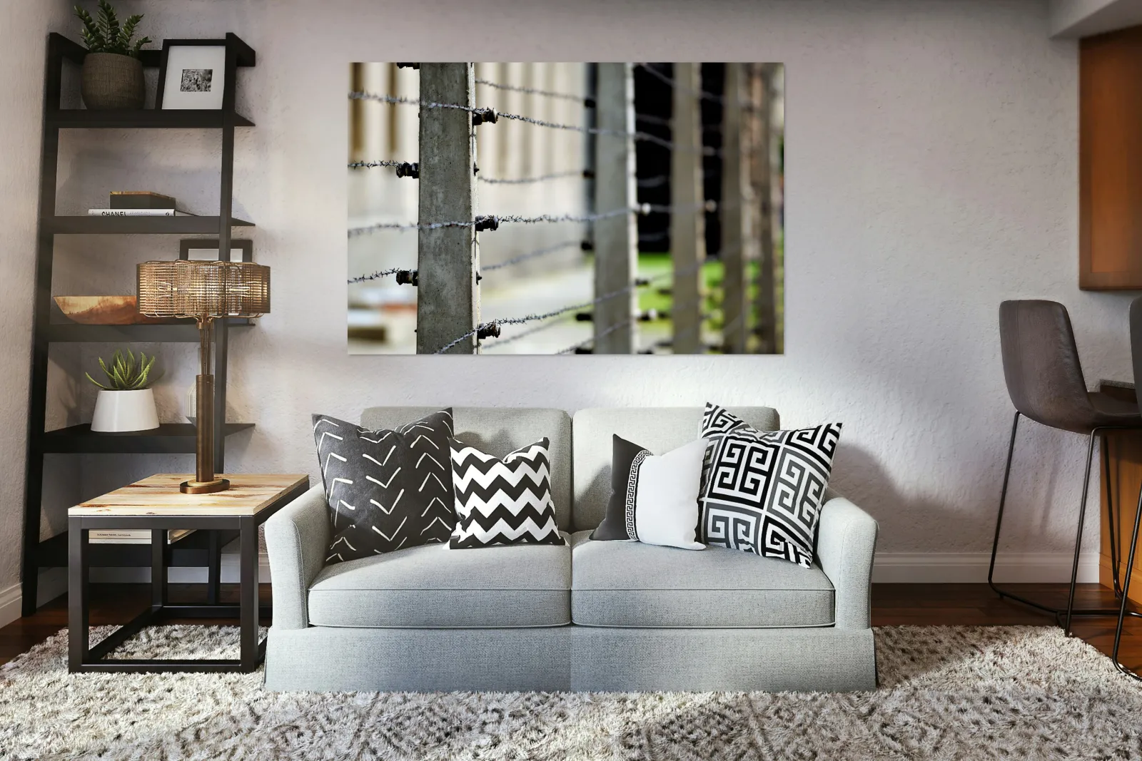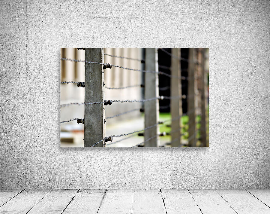 "Barbed wire fence at Auschwitz concentration camp in Krakow" in a framed print.