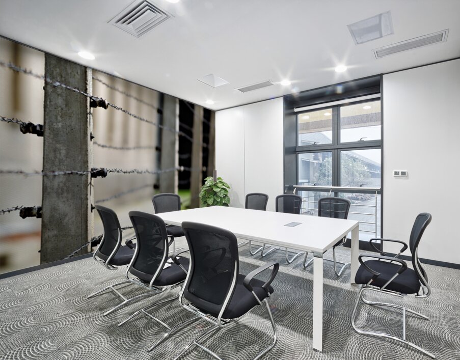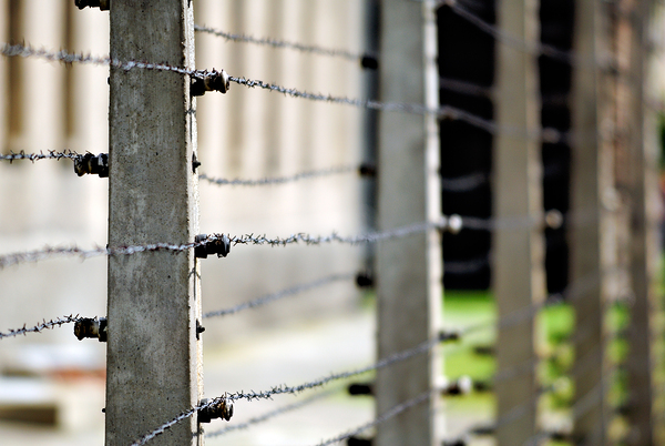The scene shows a barbed wire fence surrounding the grounds of Auschwitz concentration camp. This location is in Krakow Poland.