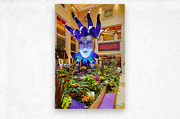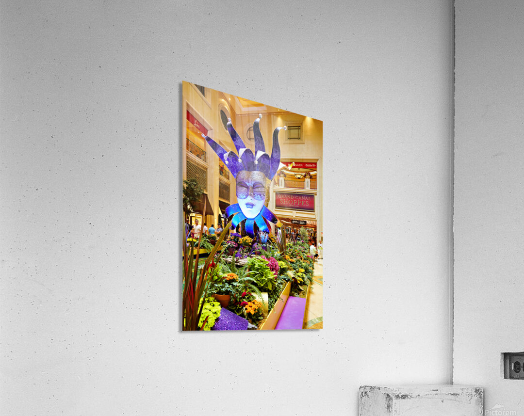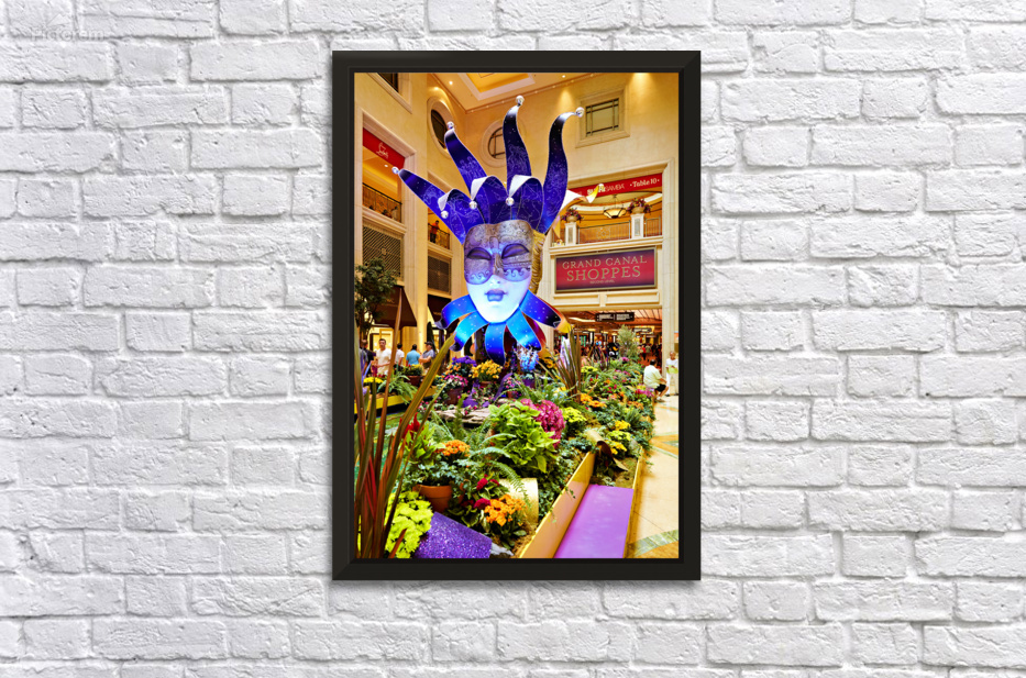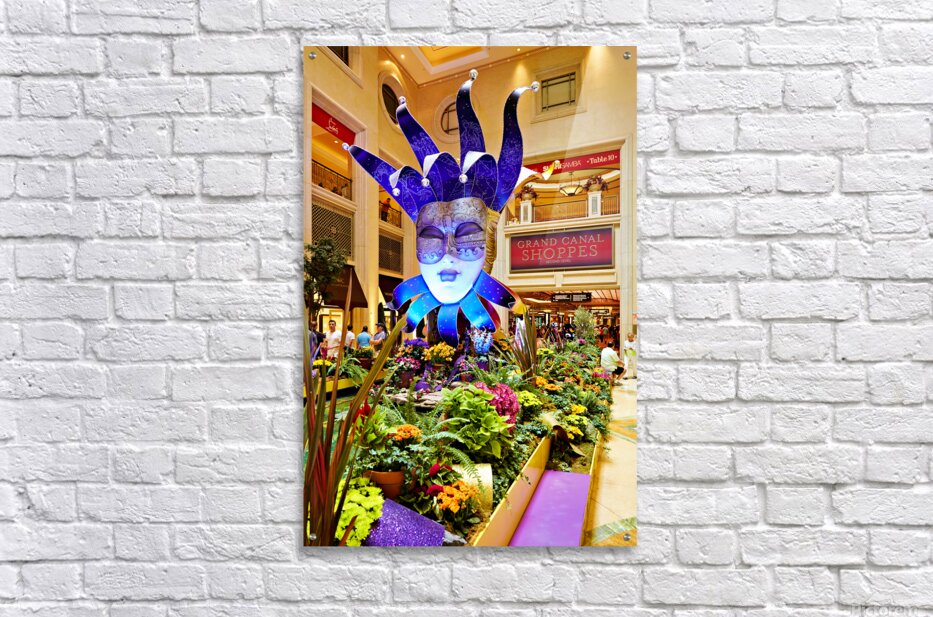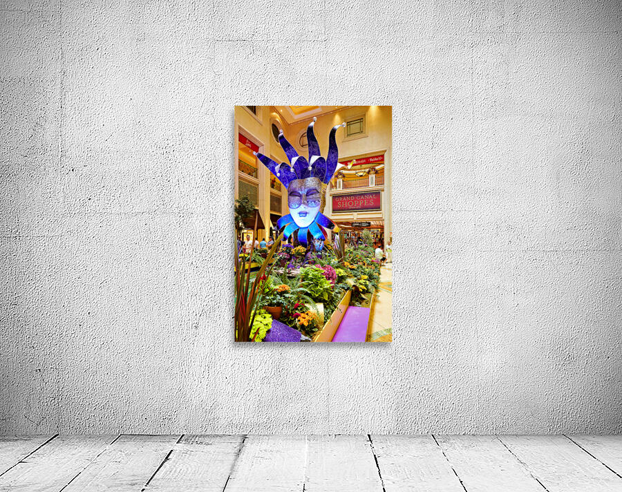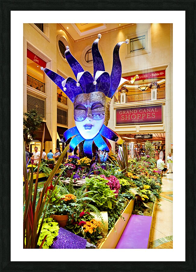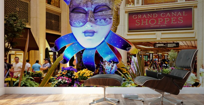 A large mask decoration stands among flowers in the Mall of Venetian Hotel. Visitors walk around admiring the festive scene during their shopping.