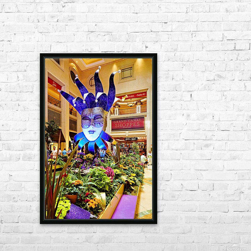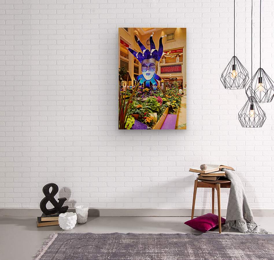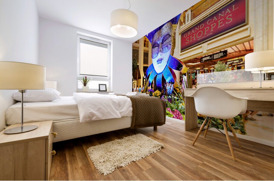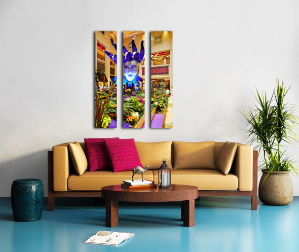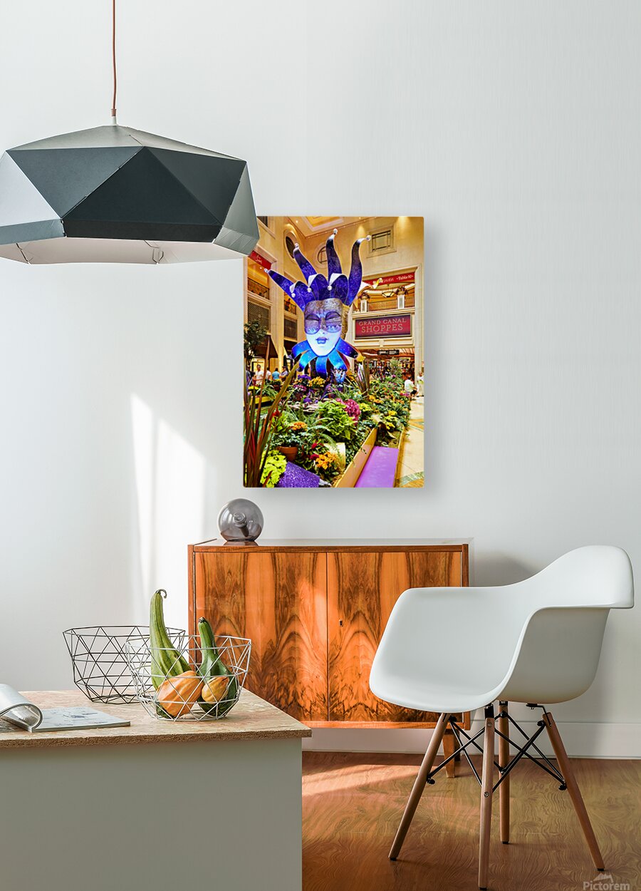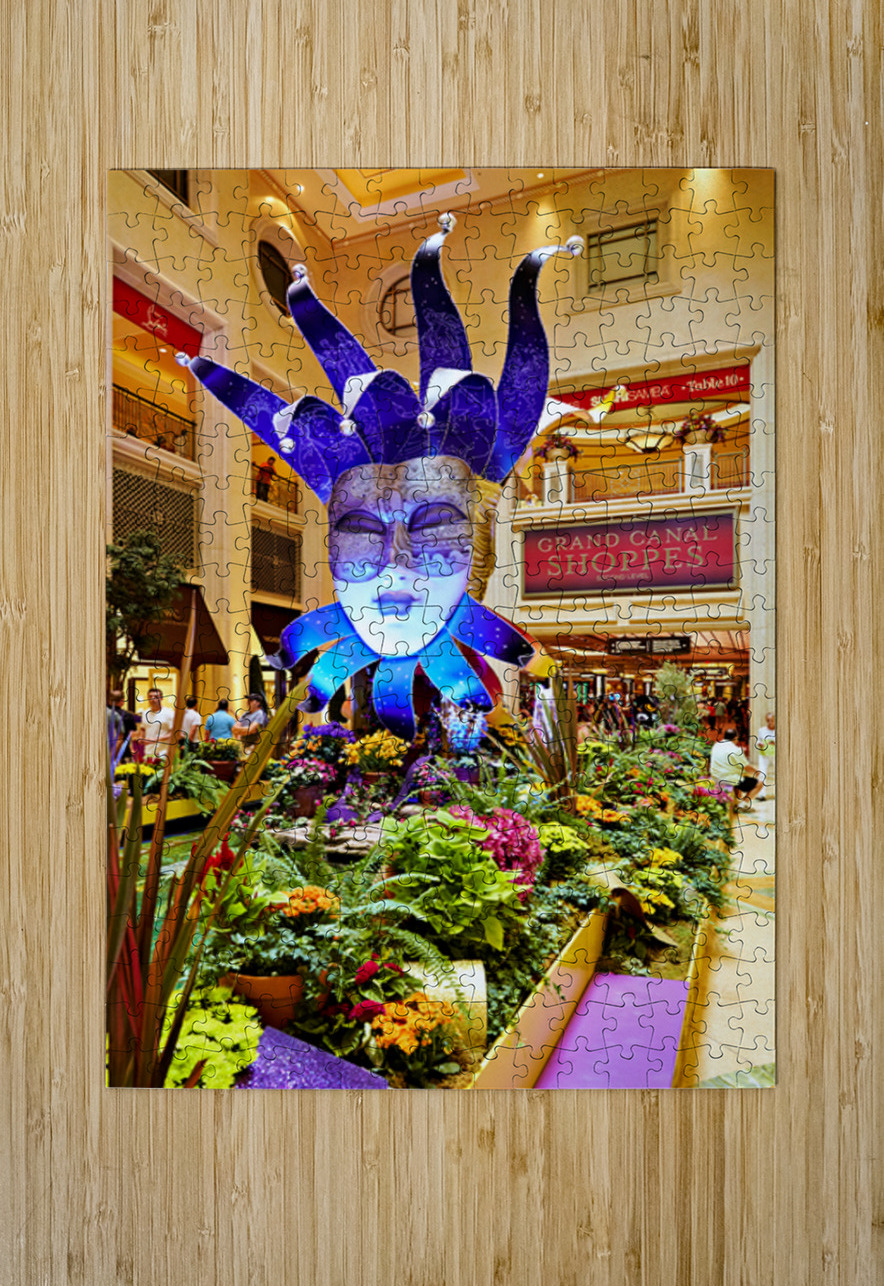 A large mask decoration stands among flowers in the Mall of Venetian Hotel. Visitors walk around admiring the festive scene during their shopping.