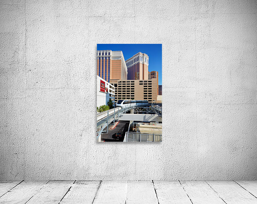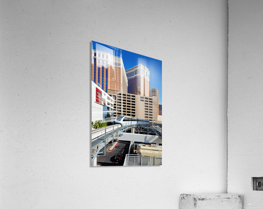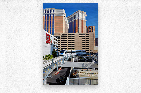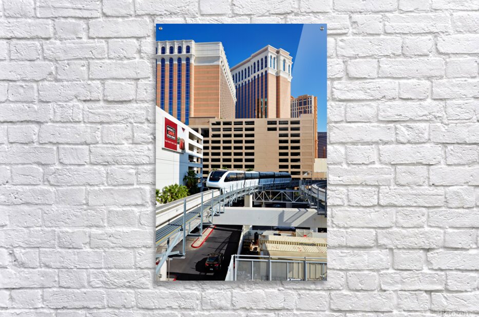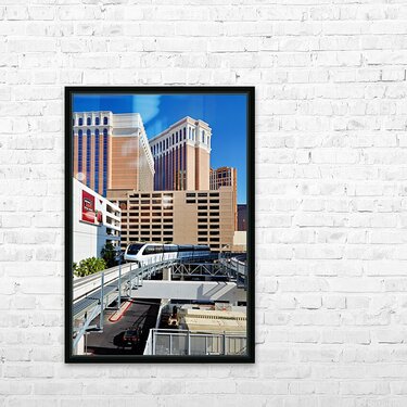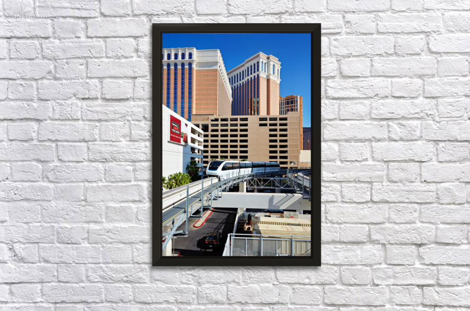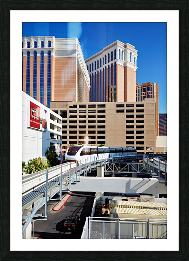 "Monorail in Las Vegas near hotels and parking structure" in a framed print.