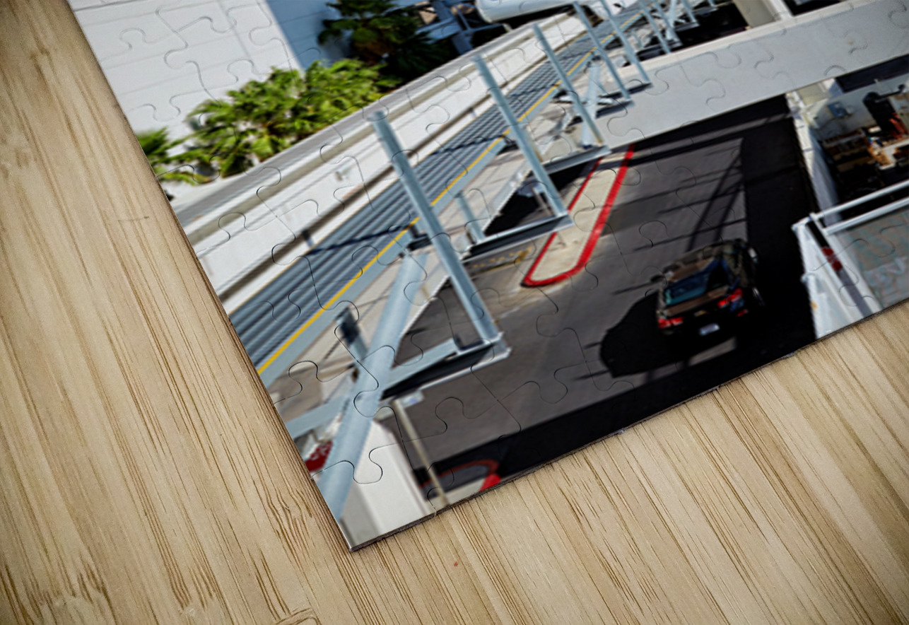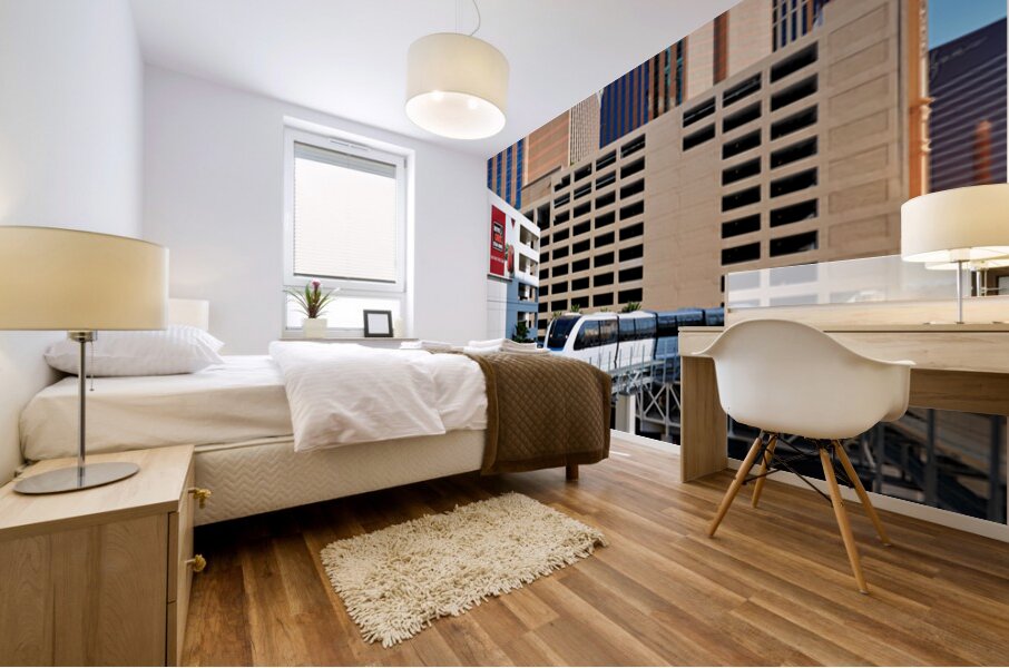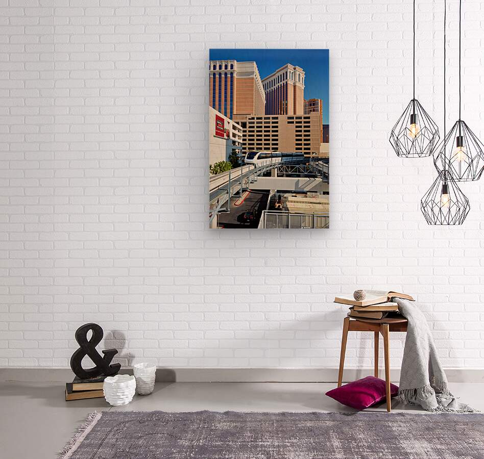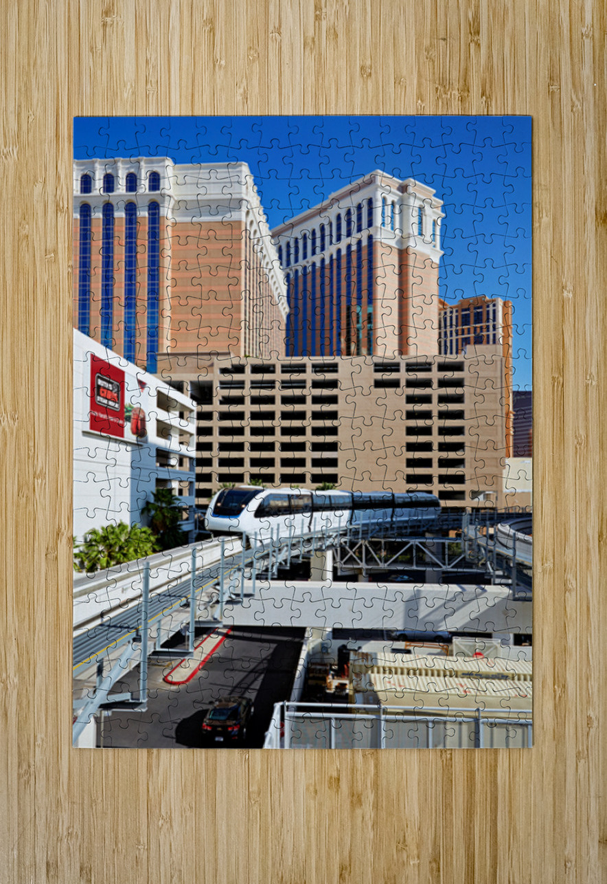 "Monorail in Las Vegas near hotels and parking structure" in a framed print.