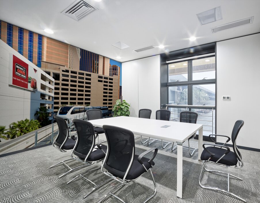 A monorail travels through Las Vegas. It passes near tall buildings and a parking structure during a clear day in Nevada.