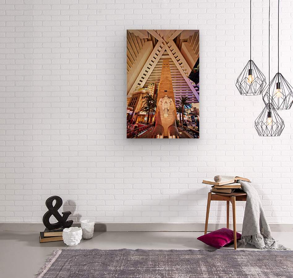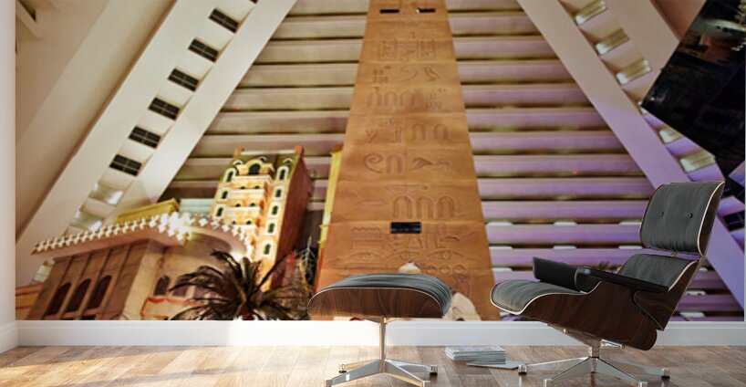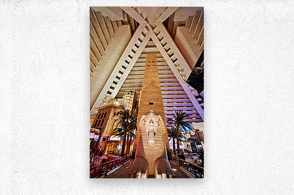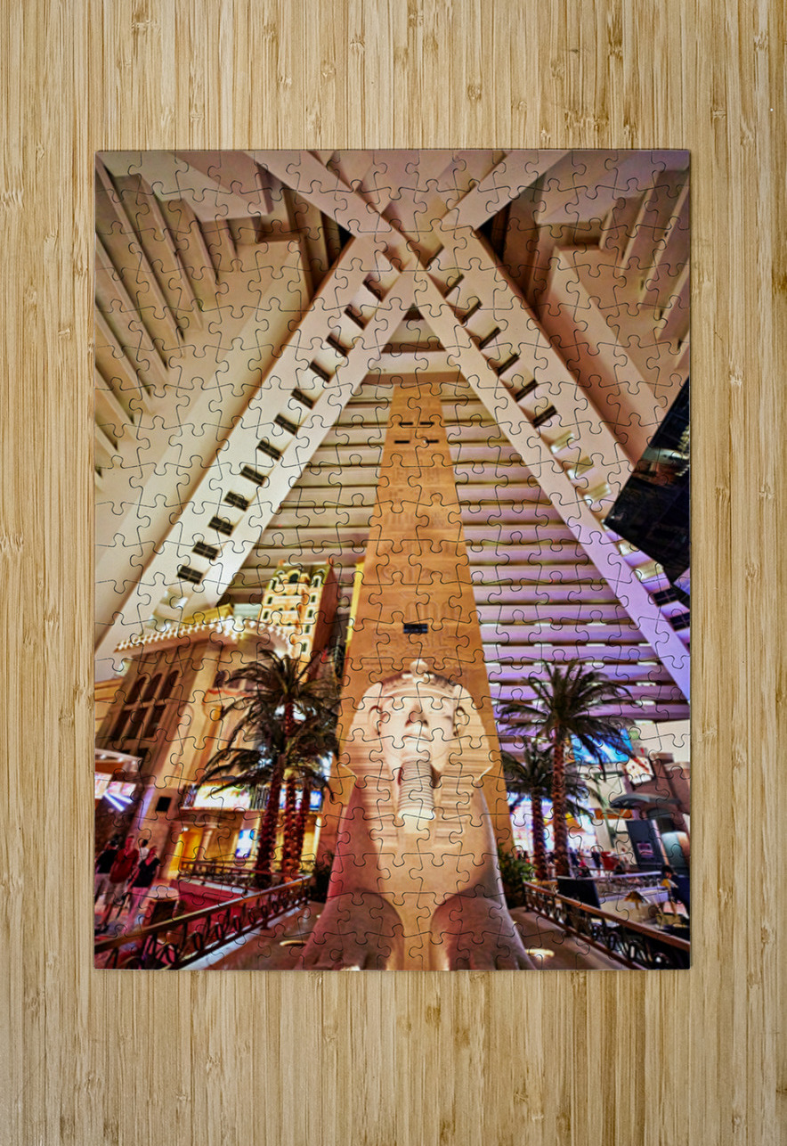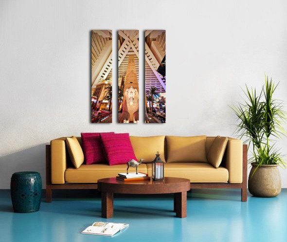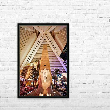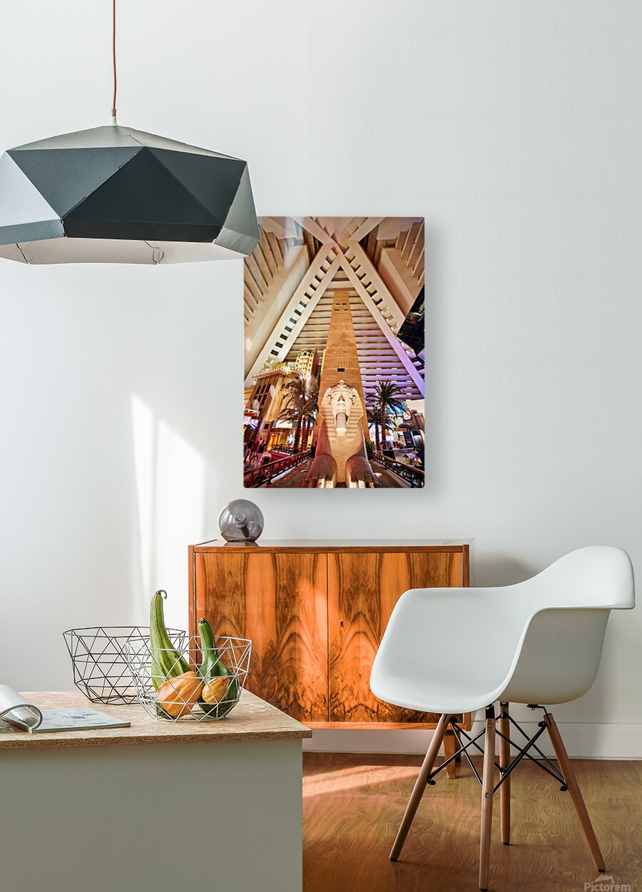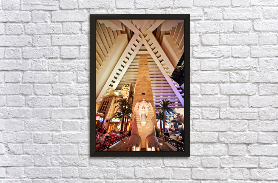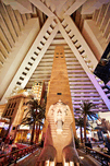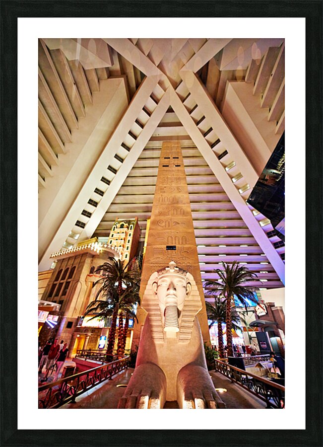 People walk inside Luxor Hotel and Casino in Las Vegas while the large sphinx statue stands tall in the center of the atrium area.