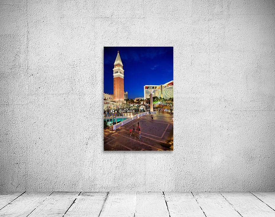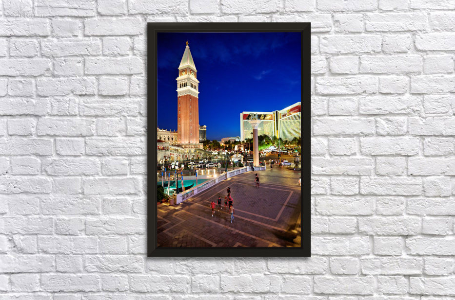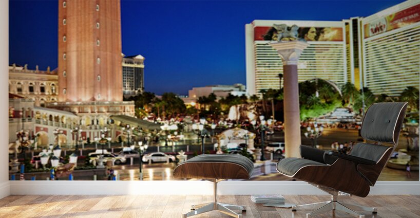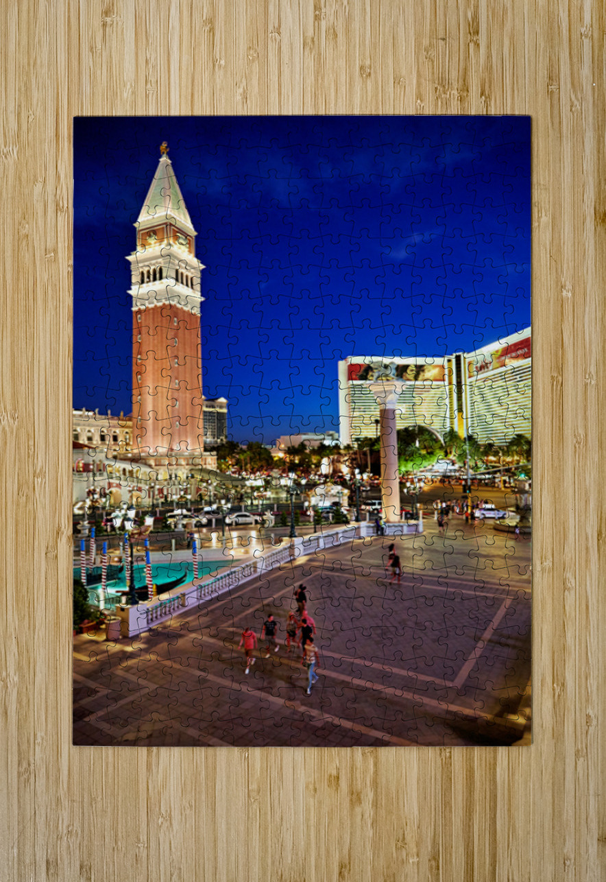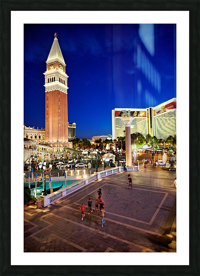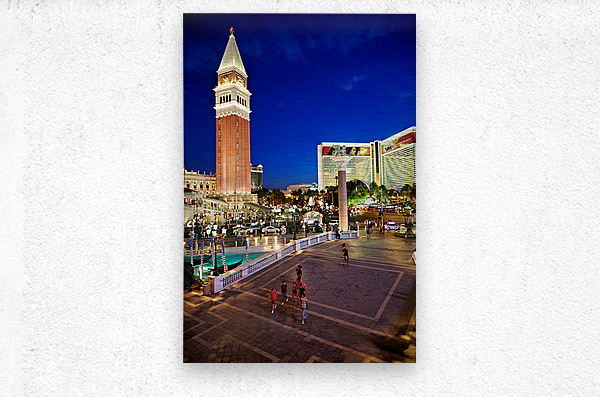People walk near the Venetian Hotel as dusk settles in Las Vegas. The lights begin to shine on the buildings.