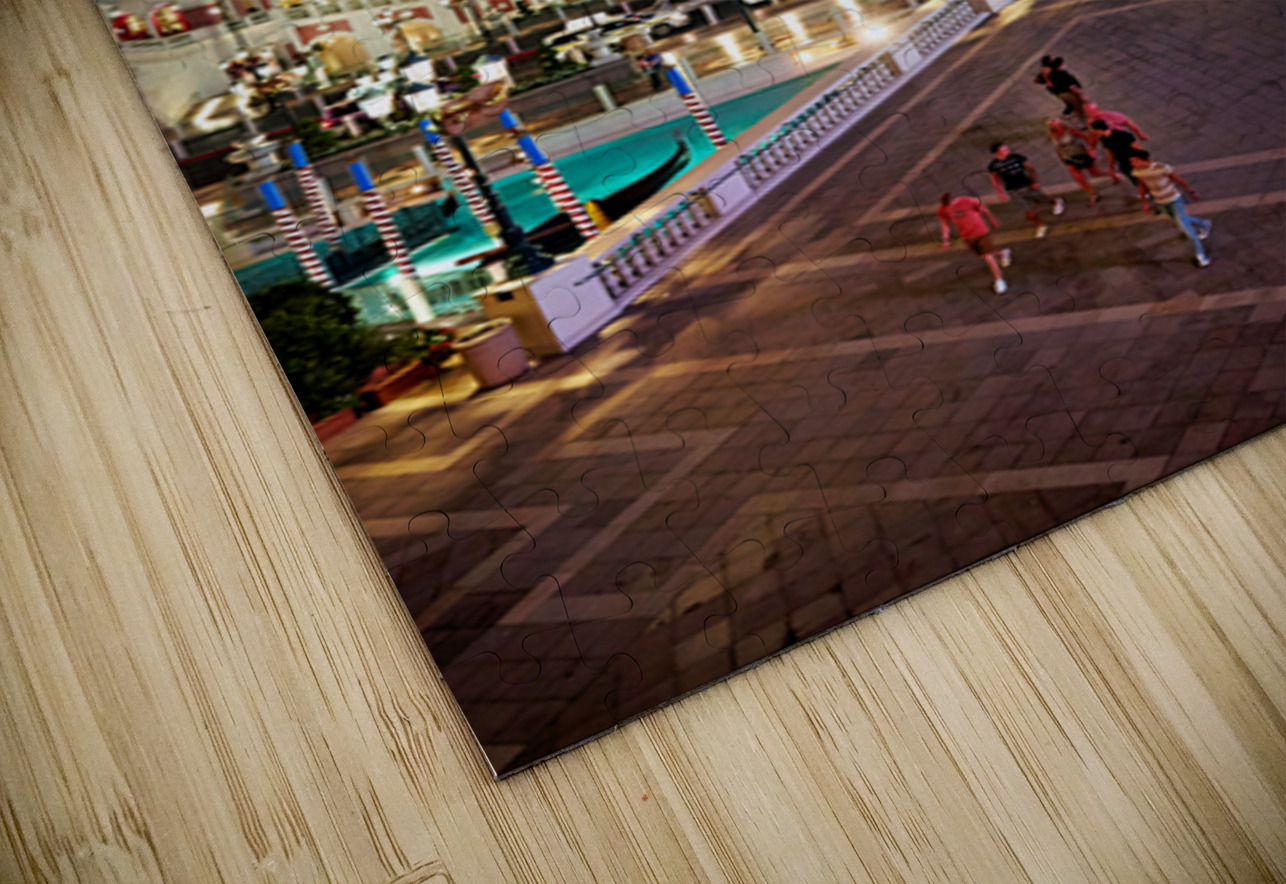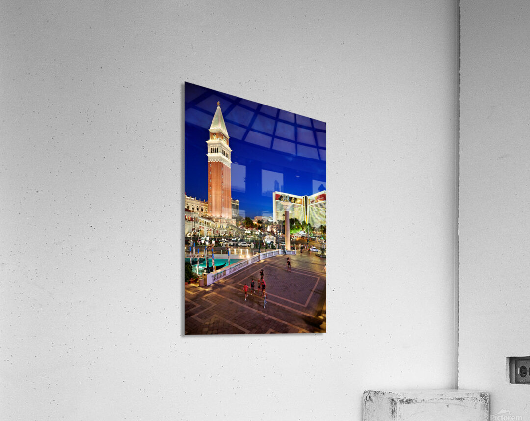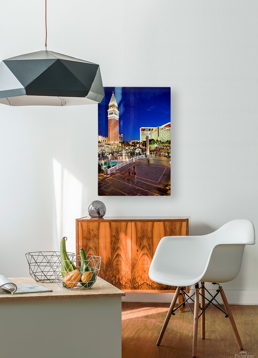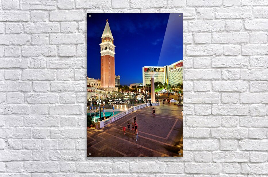 People walk near the Venetian Hotel as dusk settles in Las Vegas. The lights begin to shine on the buildings.