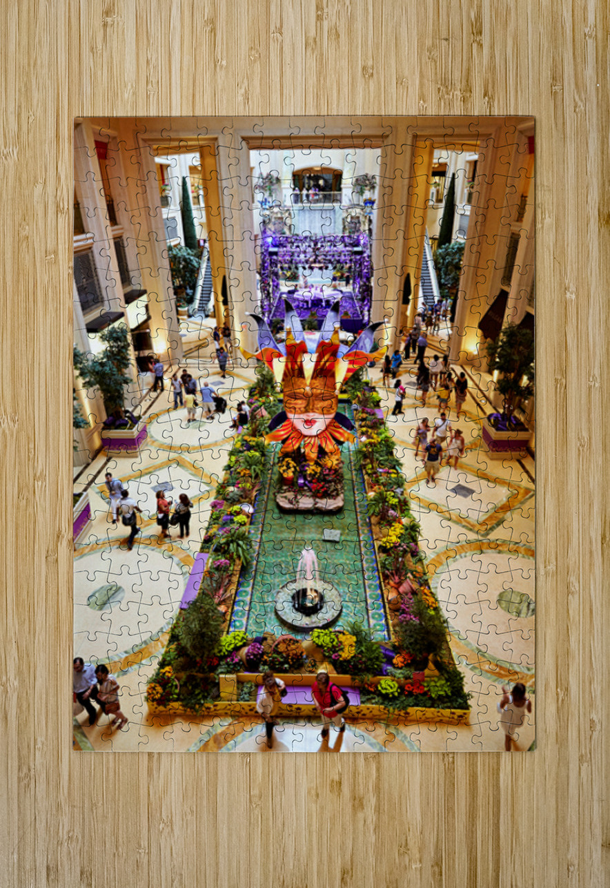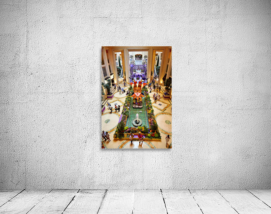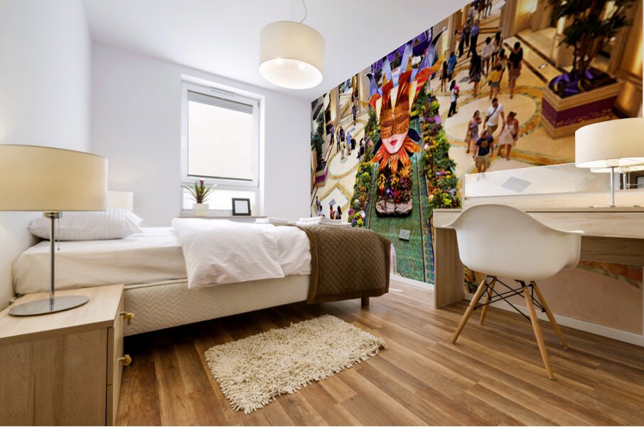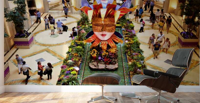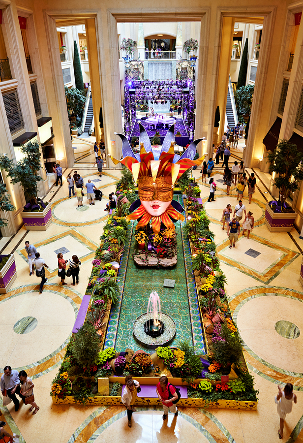 People walk around the shopping mall located in the Venetian Hotel in Las Vegas. Bright decorations and flowers fill the space.