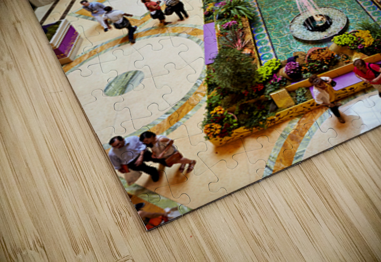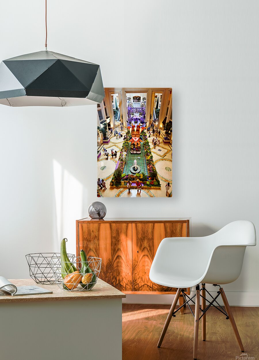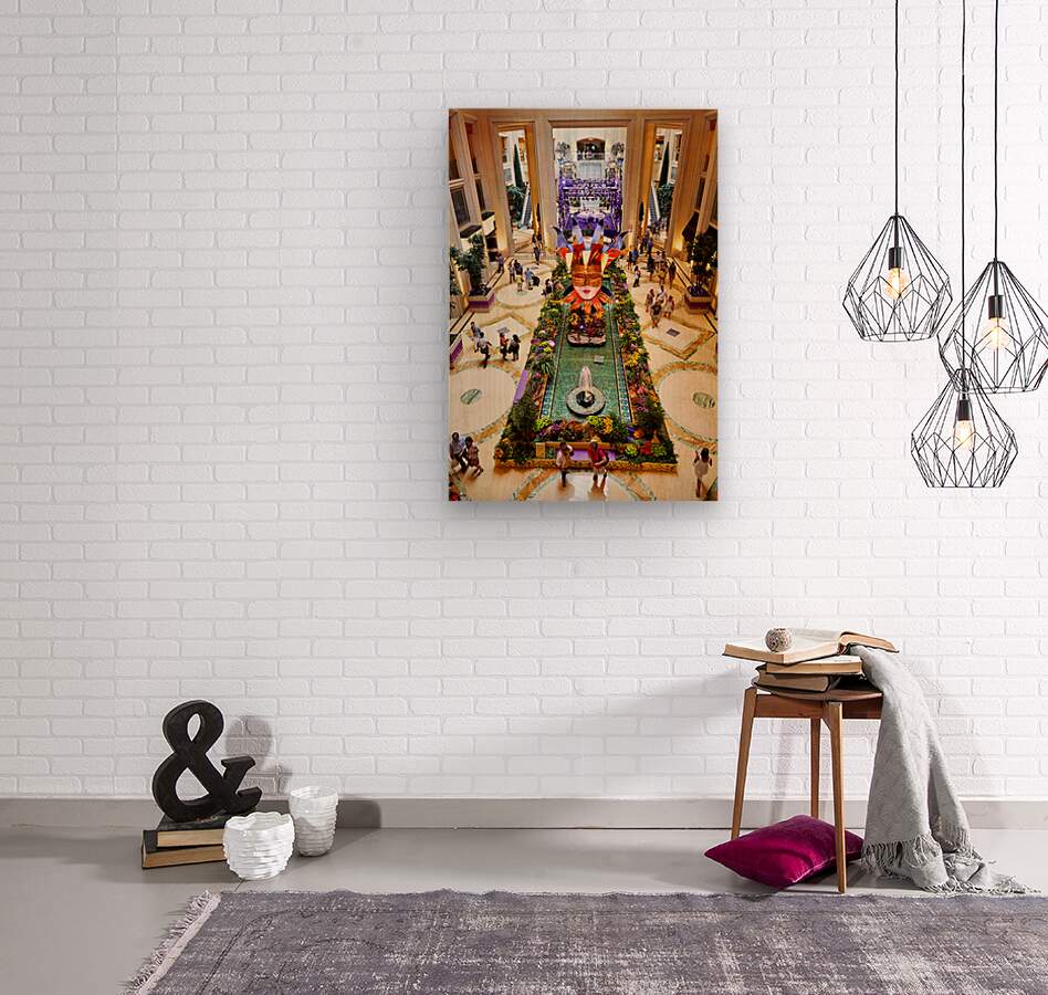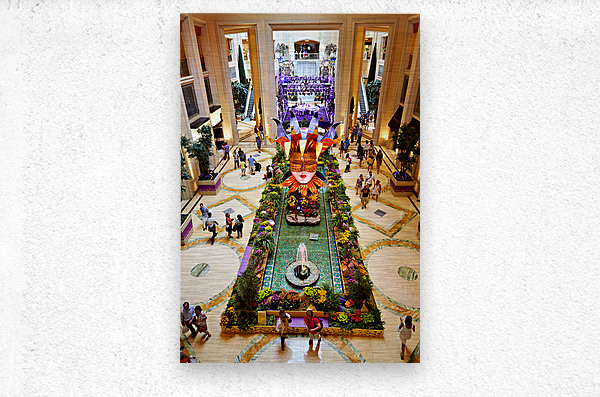People walk around the shopping mall located in the Venetian Hotel in Las Vegas. Bright decorations and flowers fill the space.