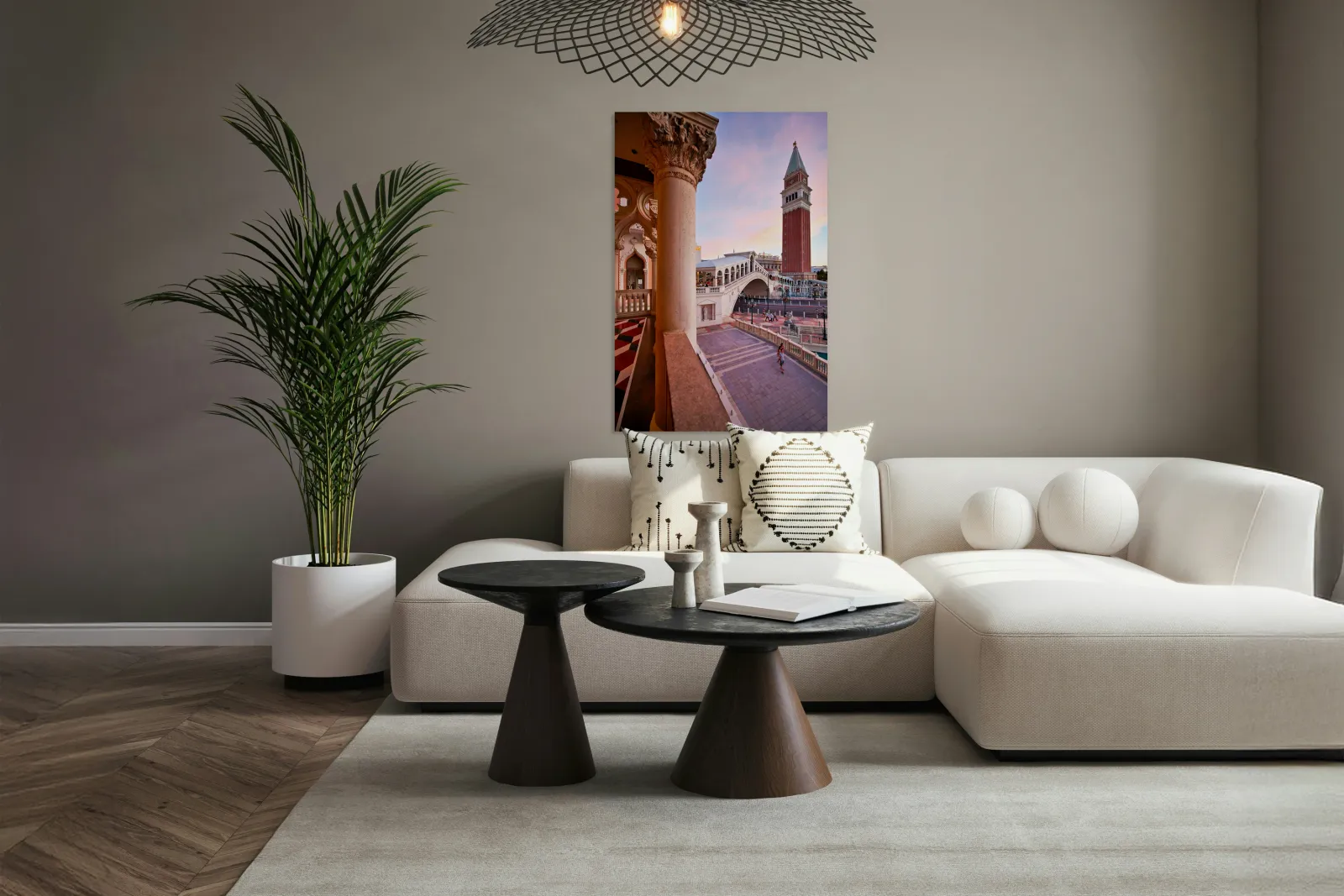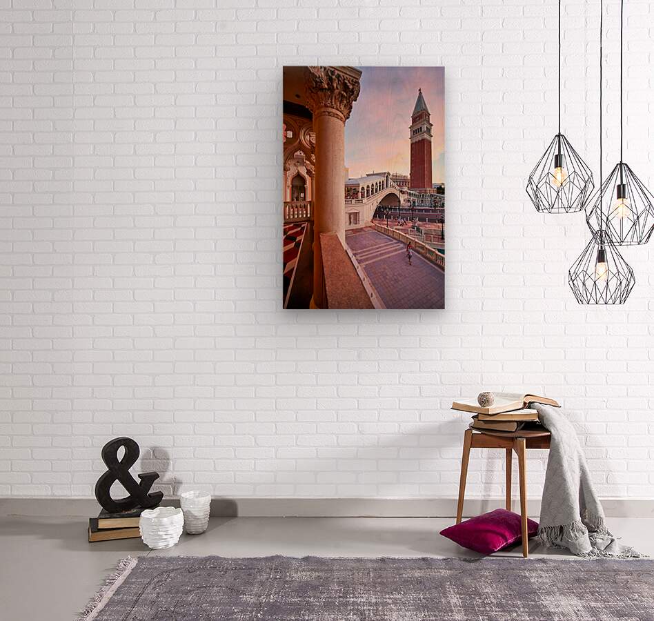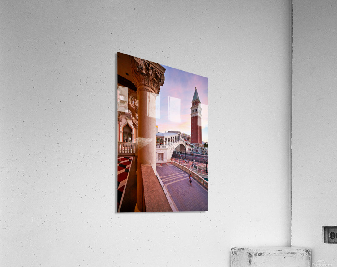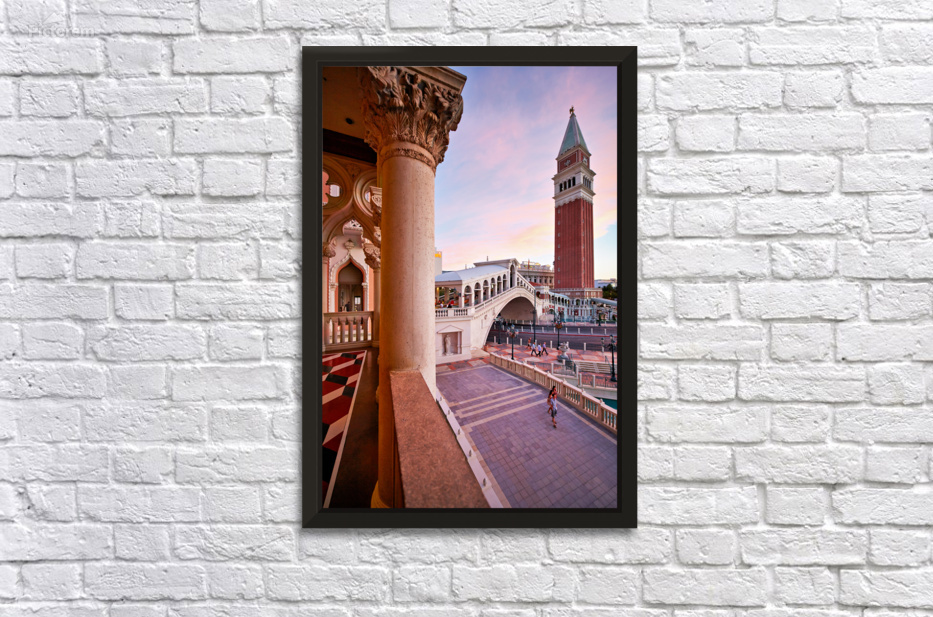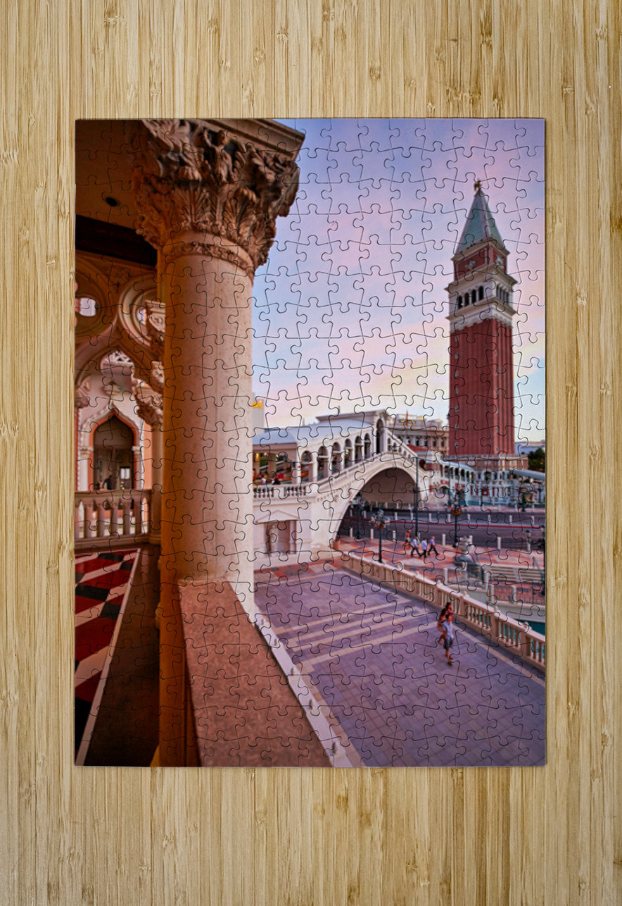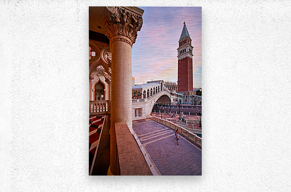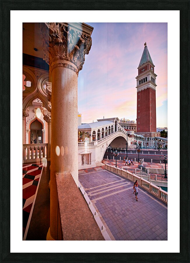 The Venetian Hotel in Las Vegas shows sunset colors over the building and bridge. People walk in the quiet area enjoying the view.