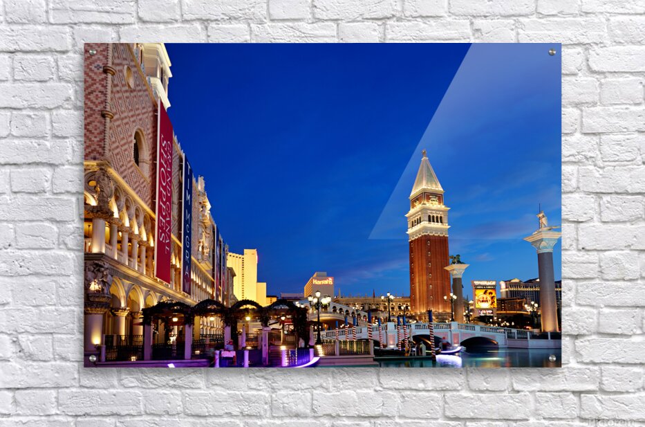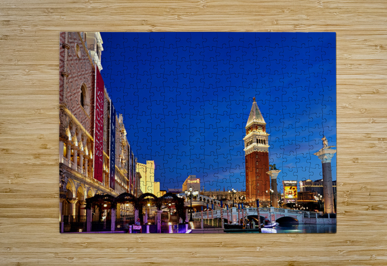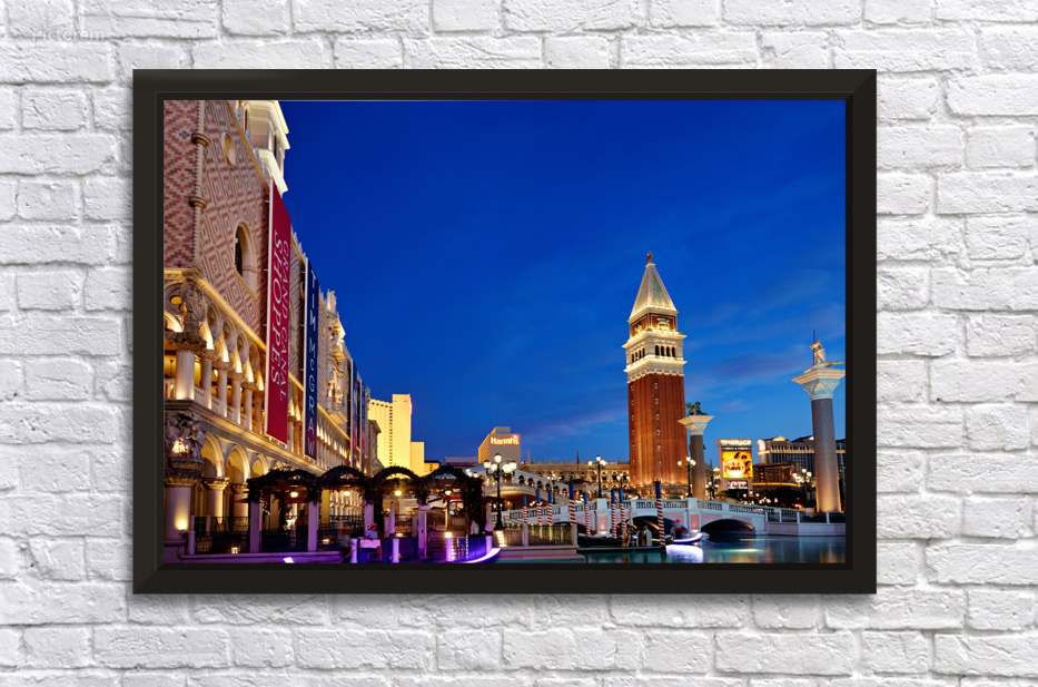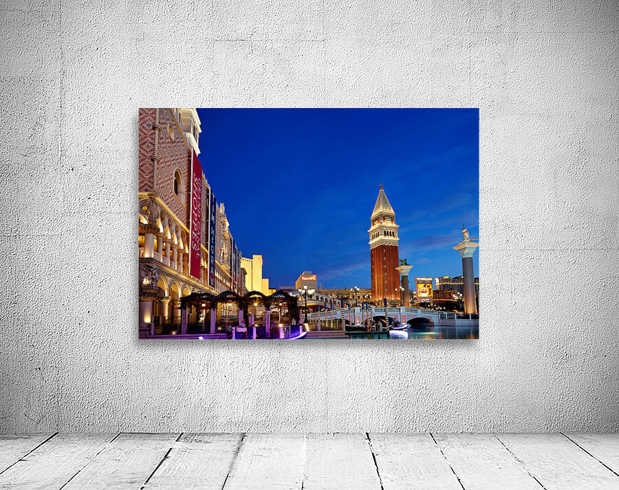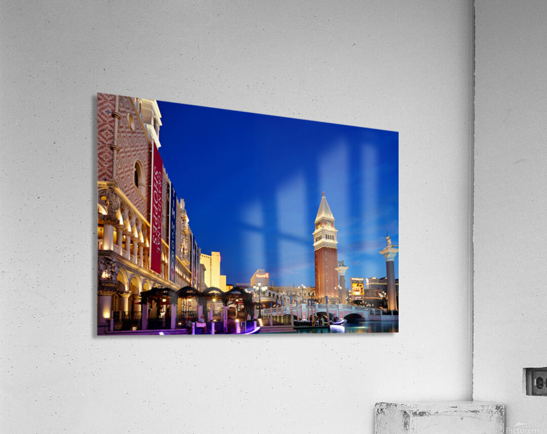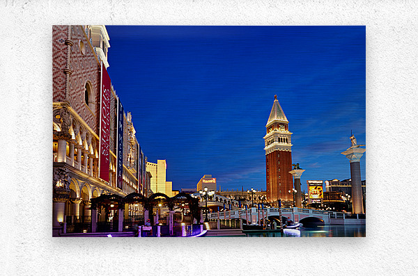 Venetian Hotel shines under the sunset sky in Las Vegas. The buildings reflect vibrant colors on the water creating a lively scene.