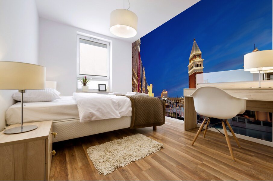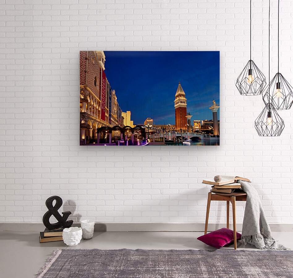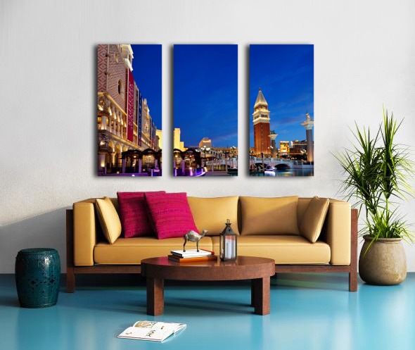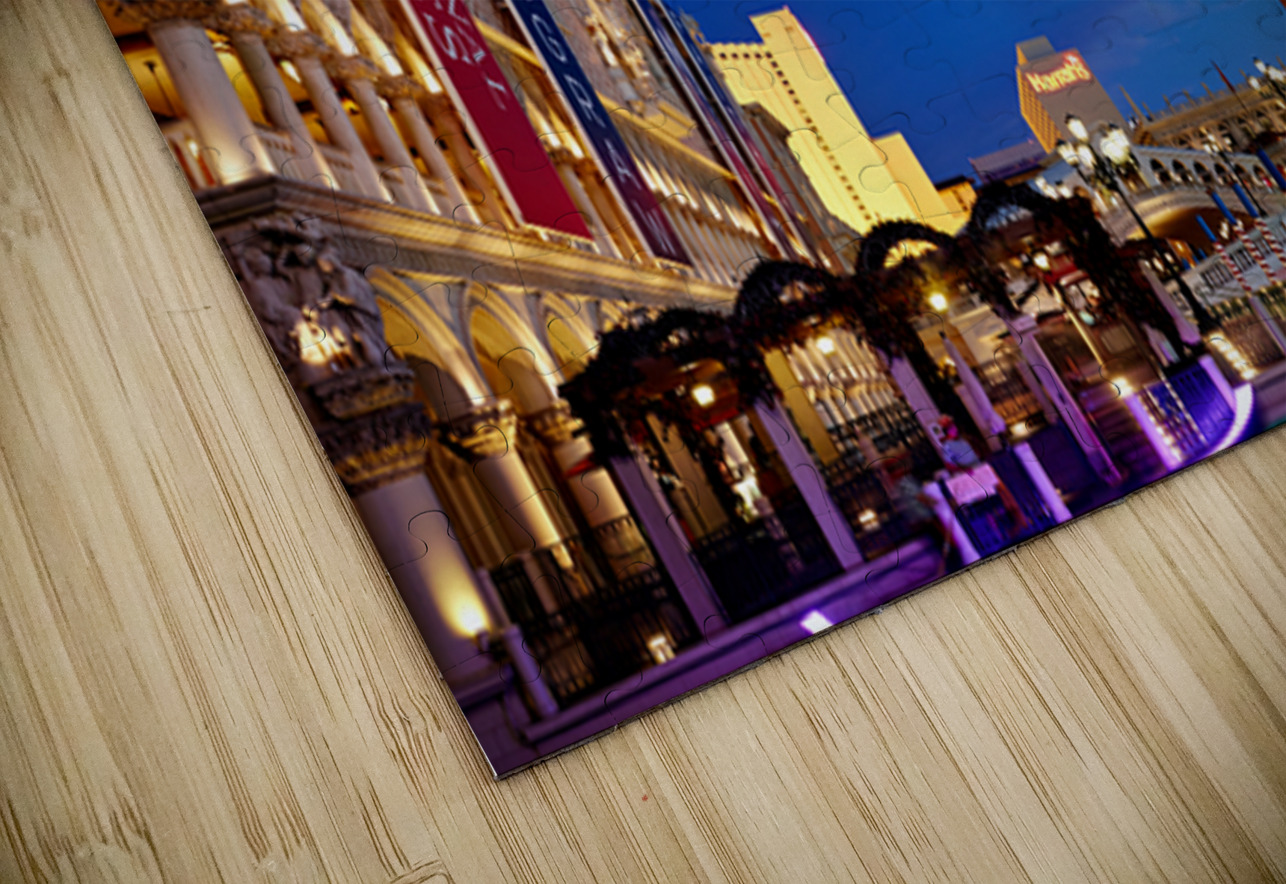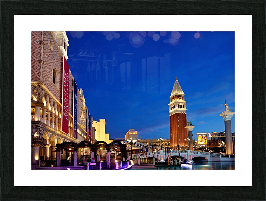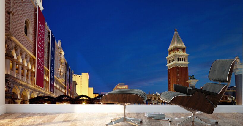 Venetian Hotel shines under the sunset sky in Las Vegas. The buildings reflect vibrant colors on the water creating a lively scene.
