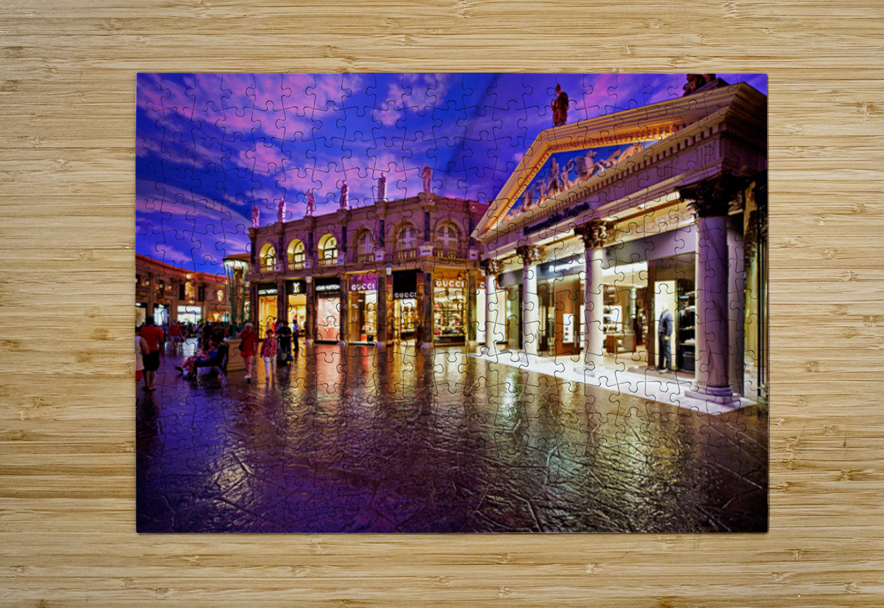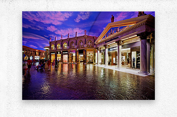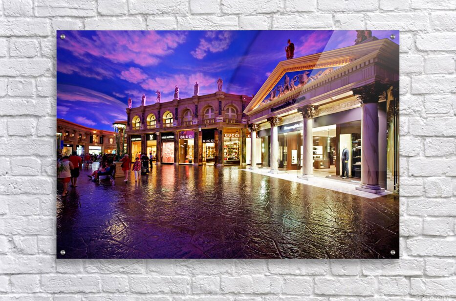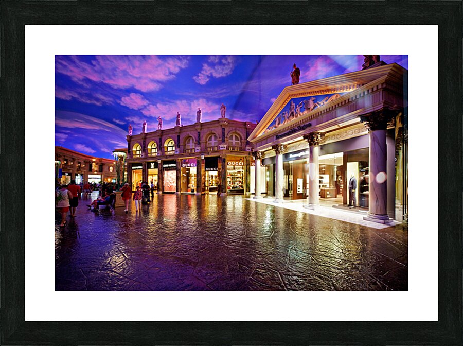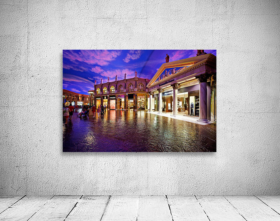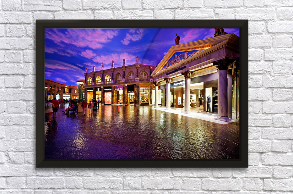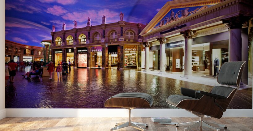 Visitors explore the popular shopping area at Caesars Palace Hotel. Luxury stores and unique architecture create a vibrant atmosphere for shoppers.