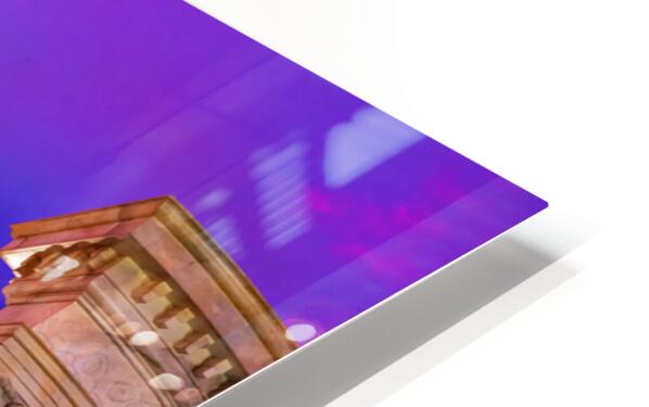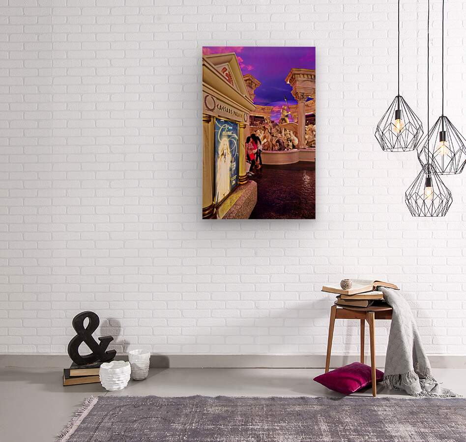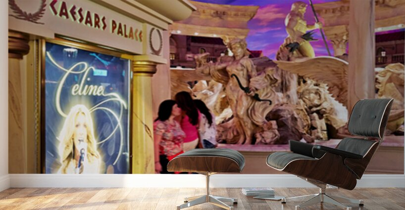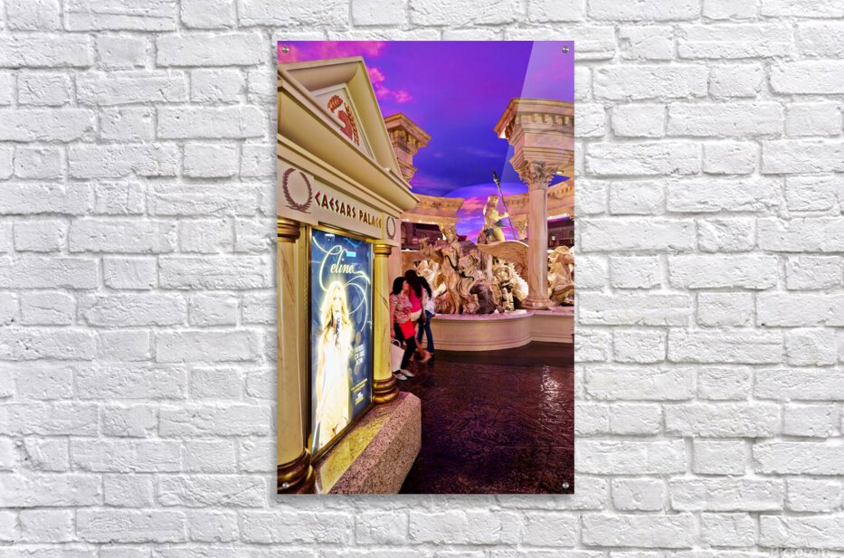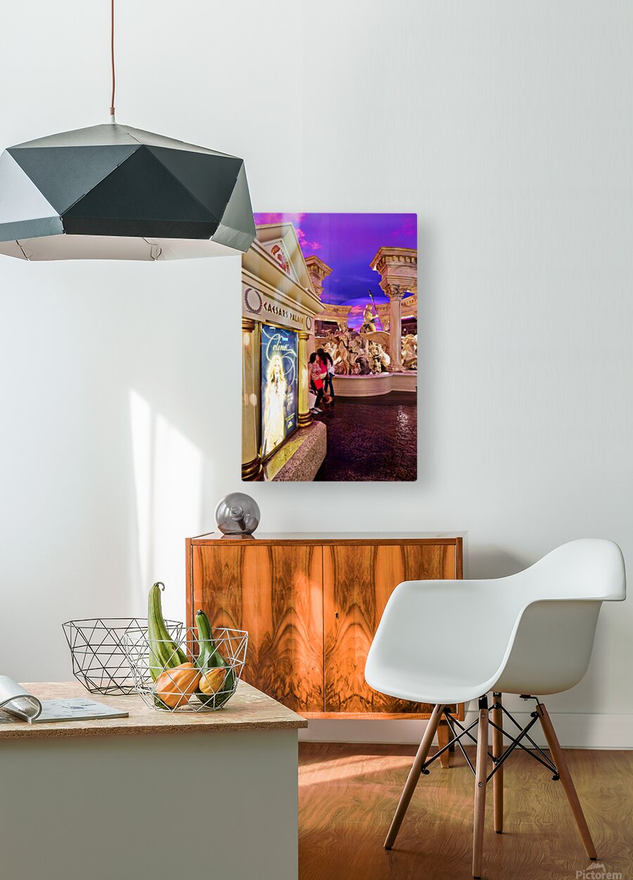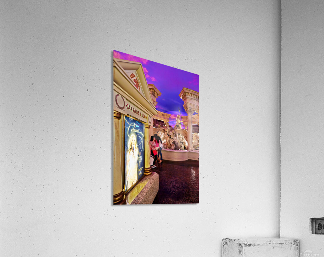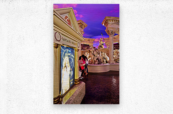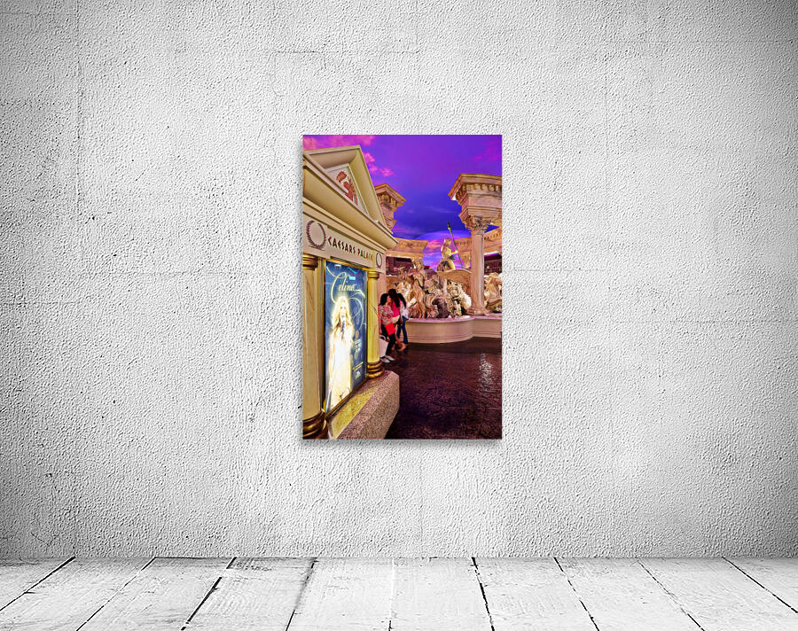 People walk by a Celine Dion display in the shopping mall at Caesars Palace Hotel. The sky is colorful with shades of purple.