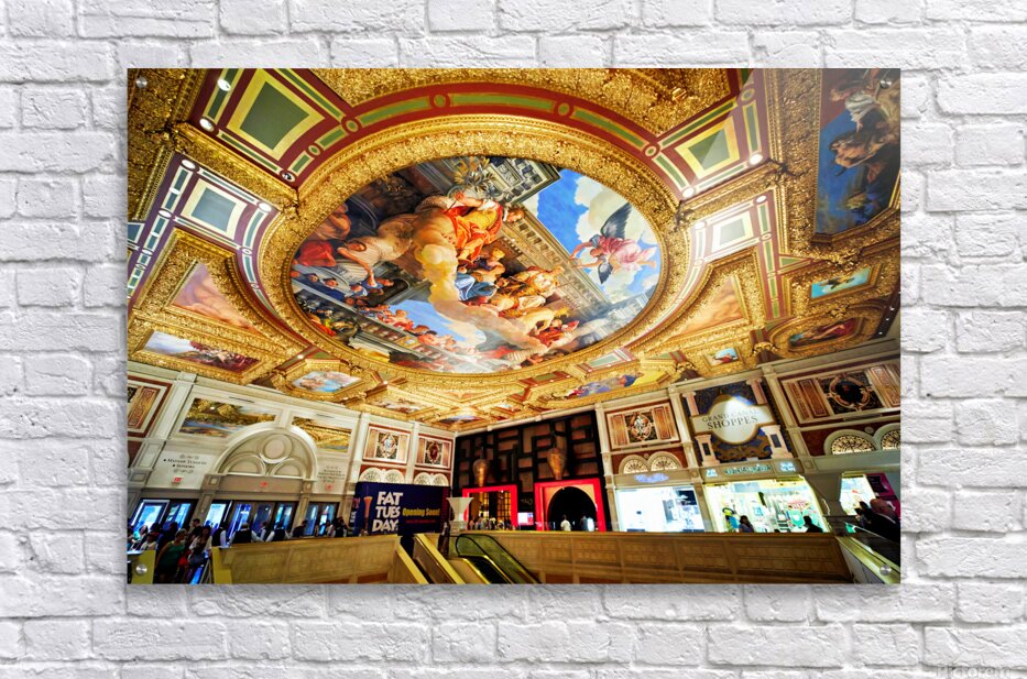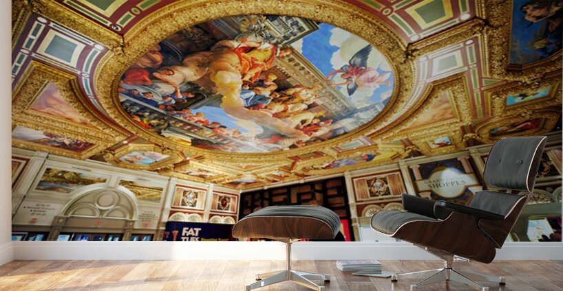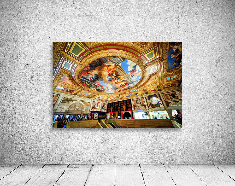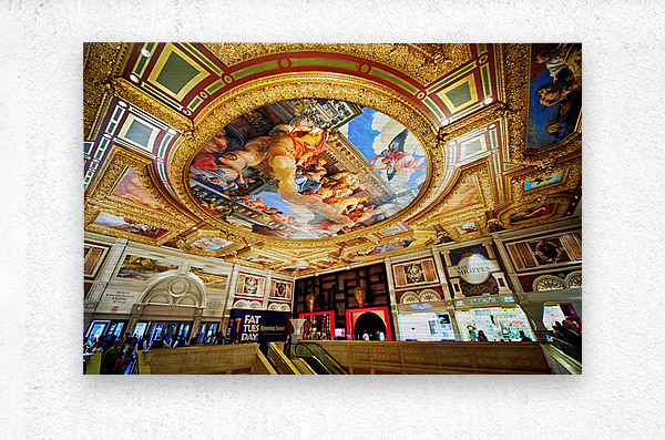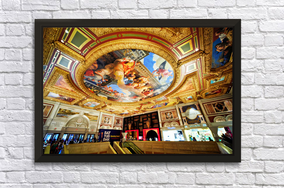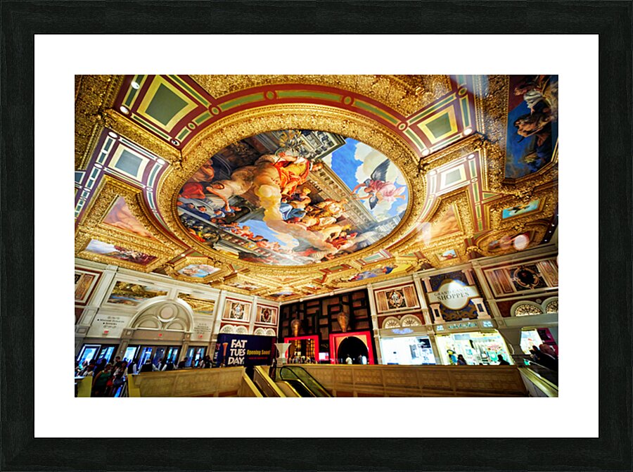 Guests explore the shopping mall at the Venetian Hotel in Las Vegas. The ceiling features detailed artwork adding to the experience.