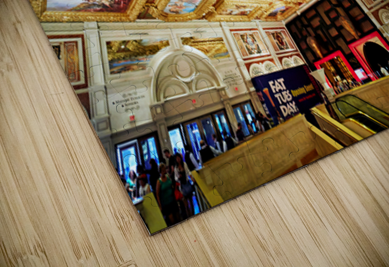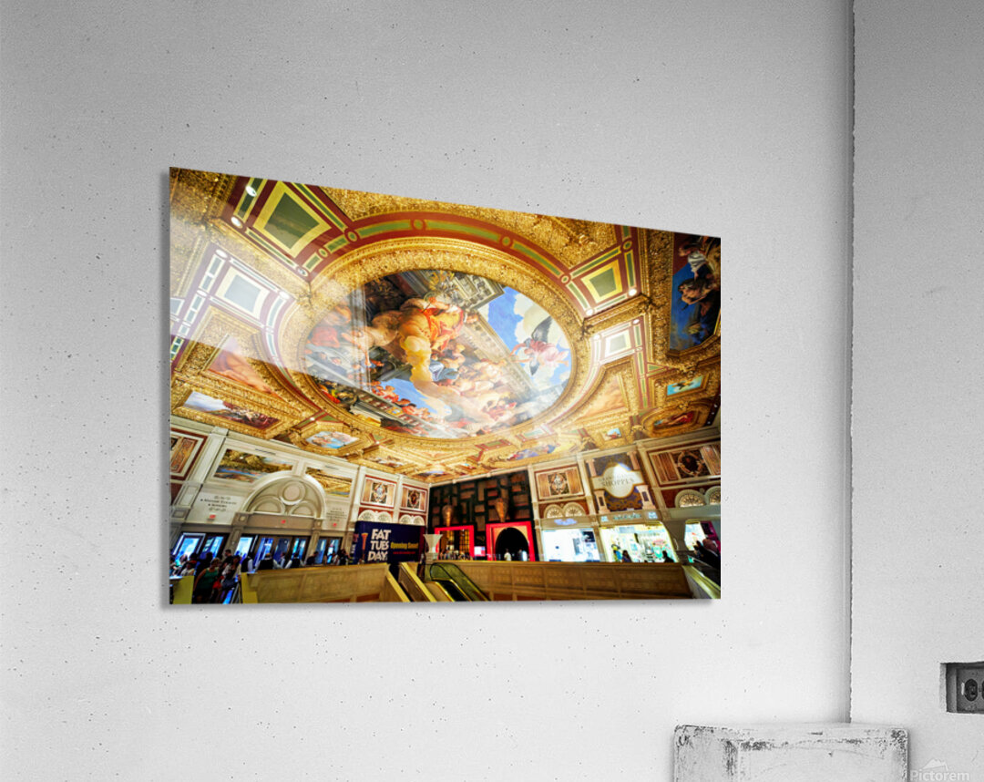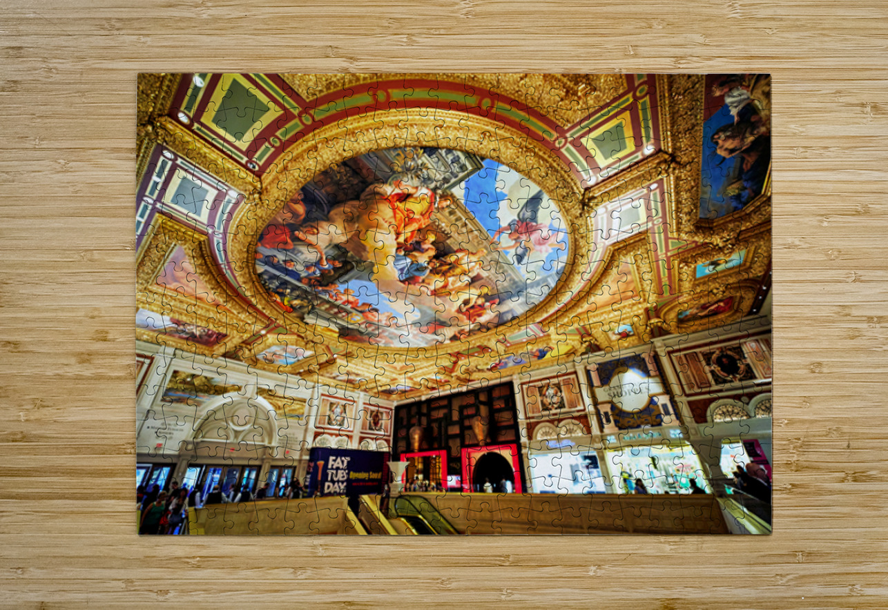 Guests explore the shopping mall at the Venetian Hotel in Las Vegas. The ceiling features detailed artwork adding to the experience.