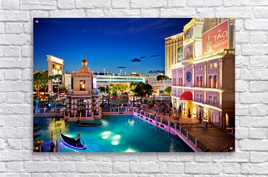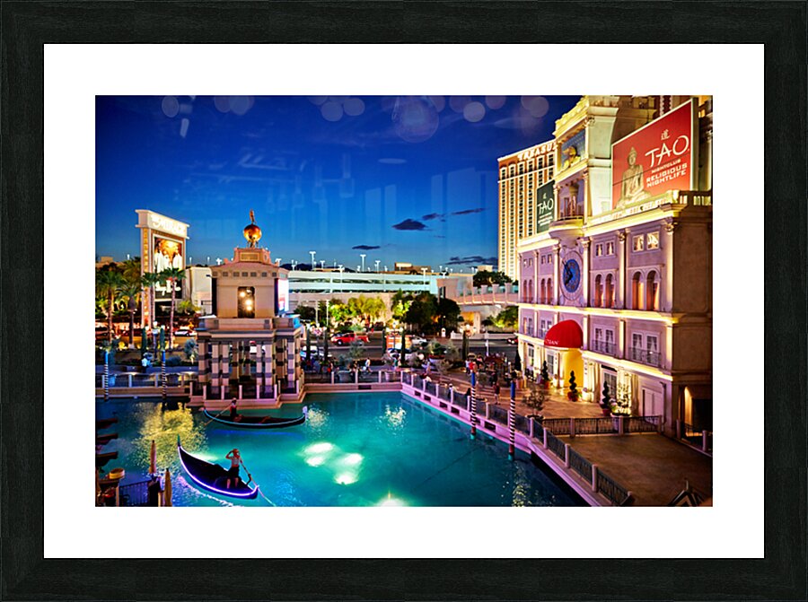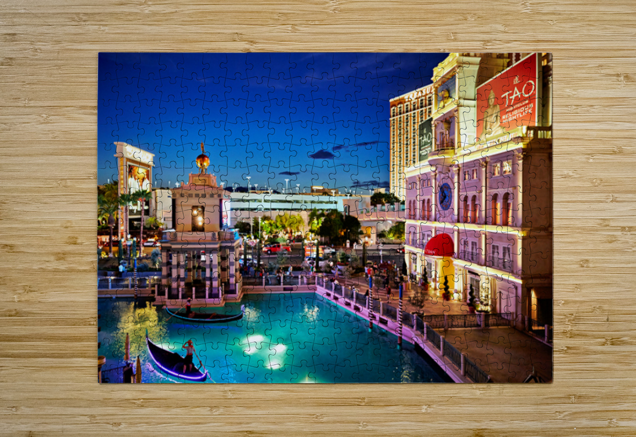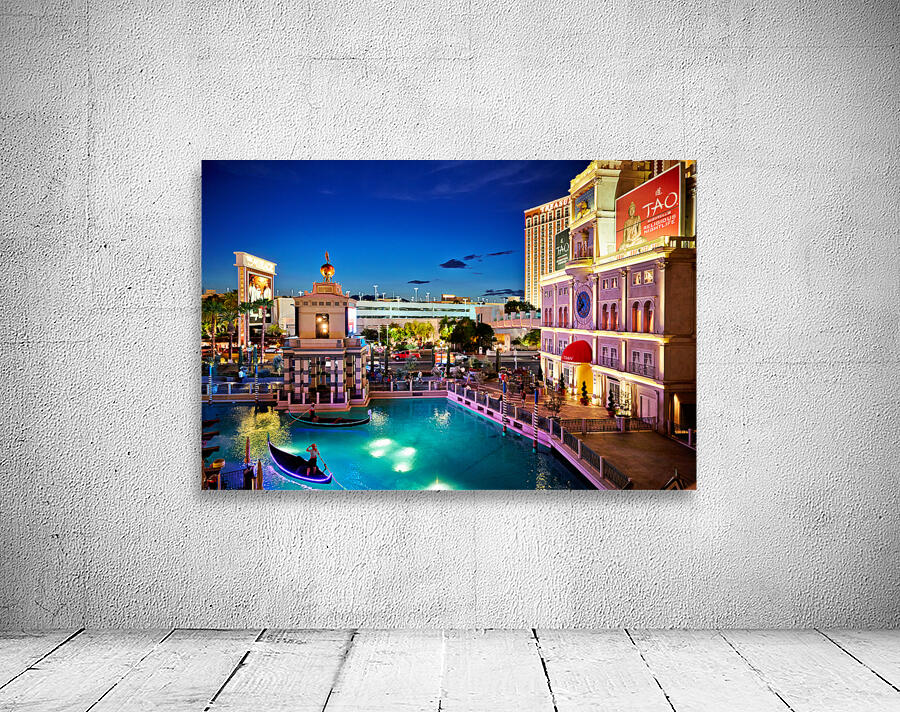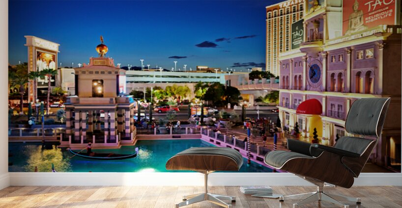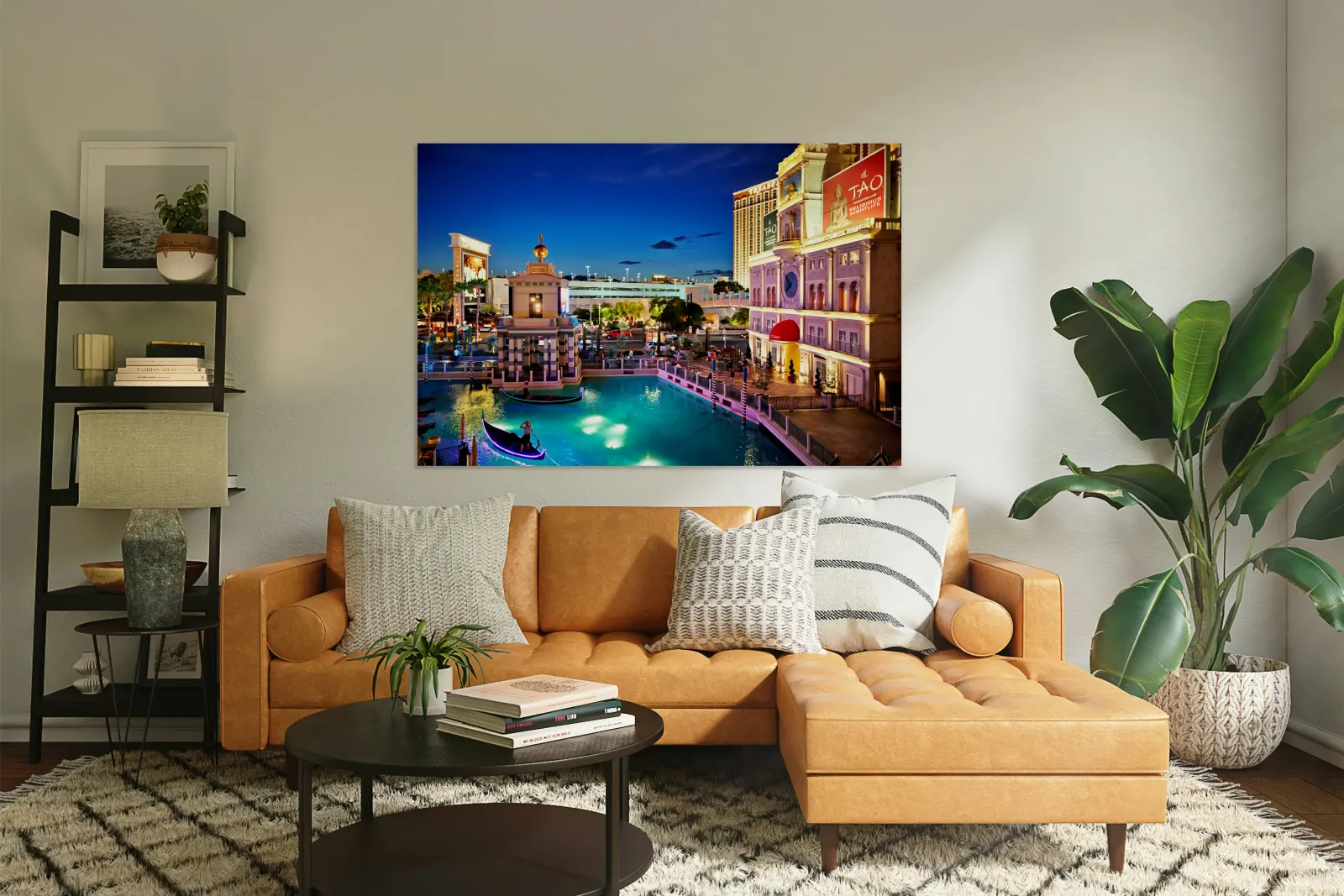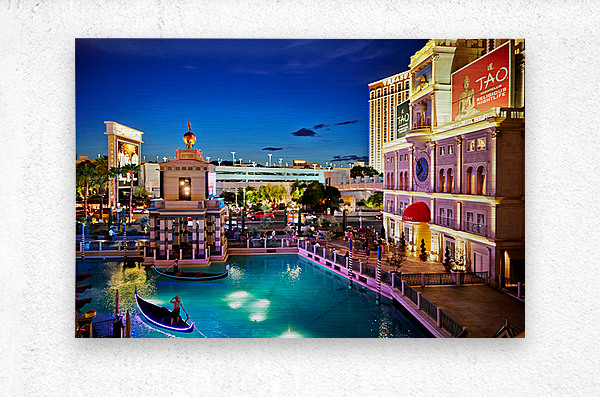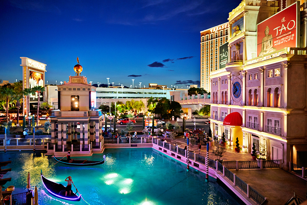 The sun sets over the Venetian Hotel in Las Vegas casting a colorful light on the canal and creating a lively atmosphere in the area.