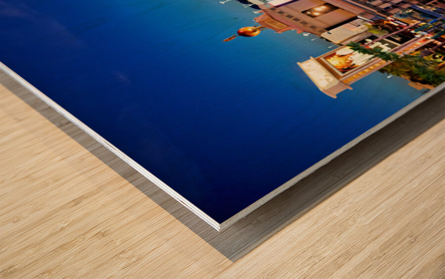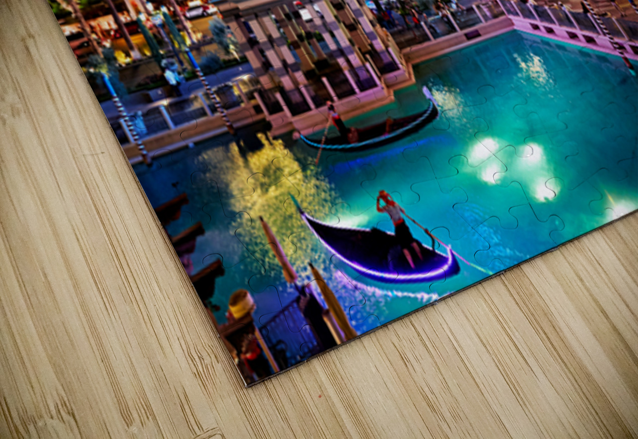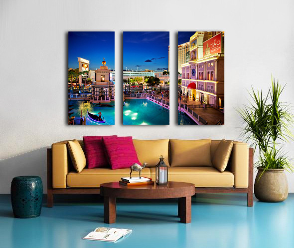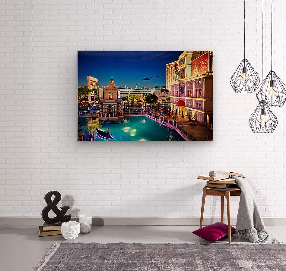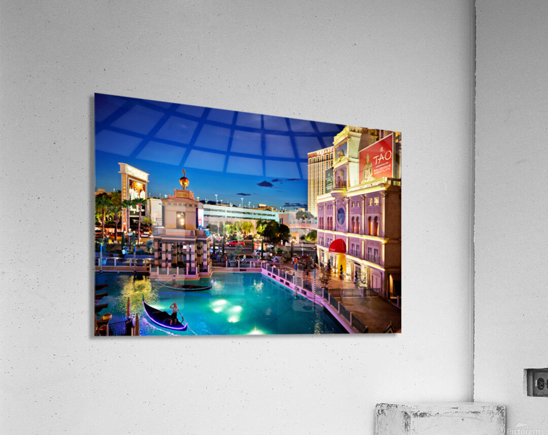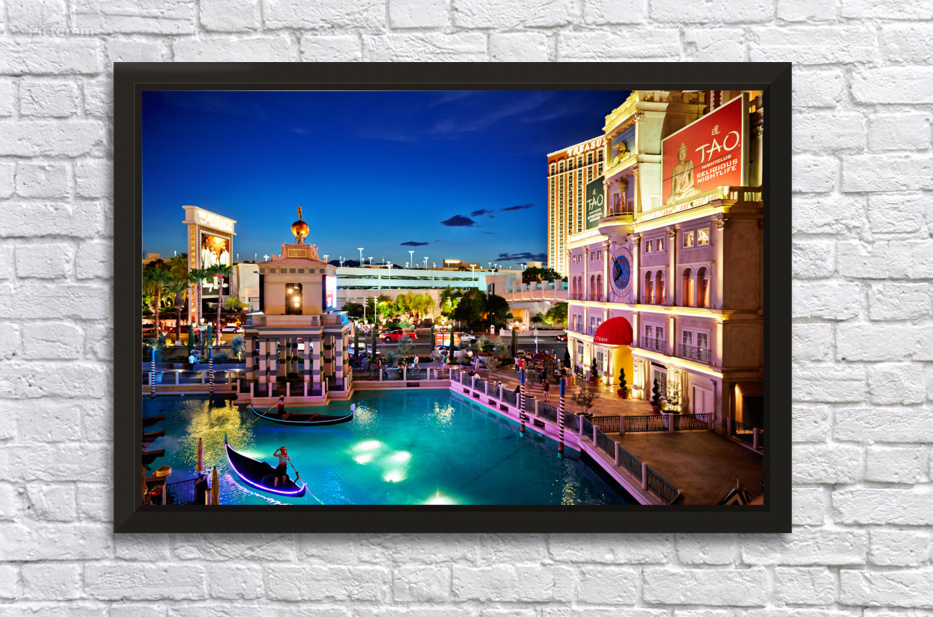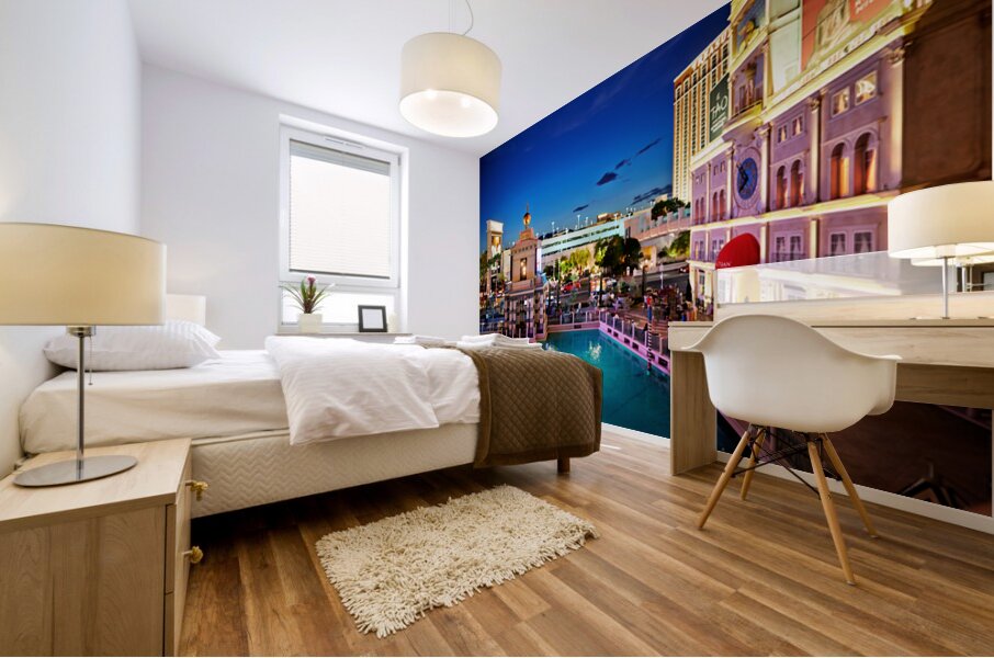 The sun sets over the Venetian Hotel in Las Vegas casting a colorful light on the canal and creating a lively atmosphere in the area.