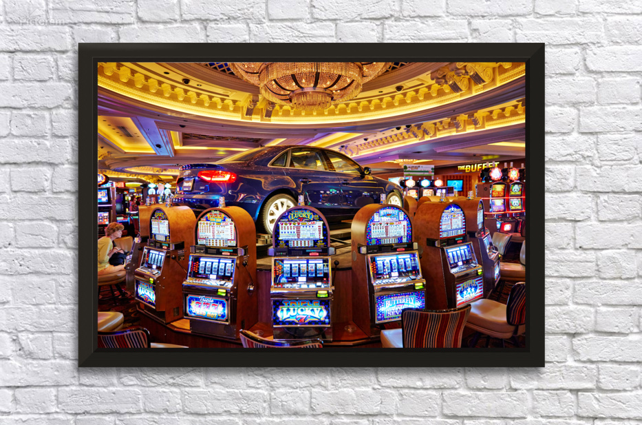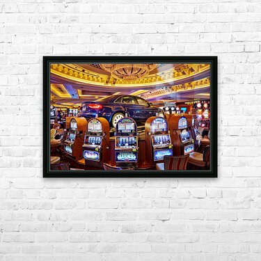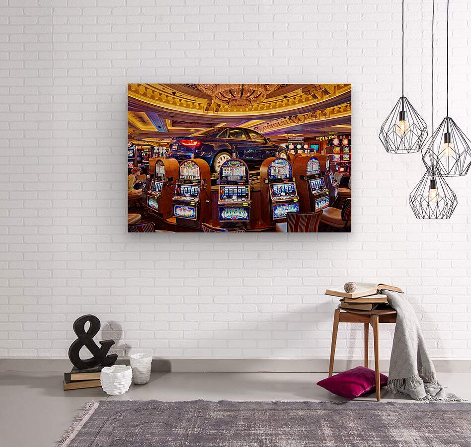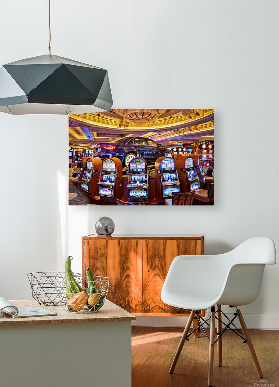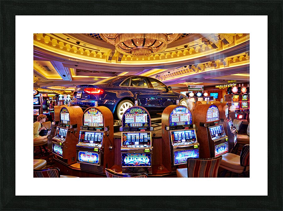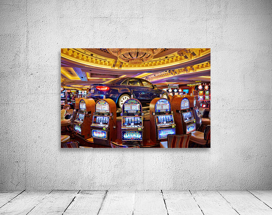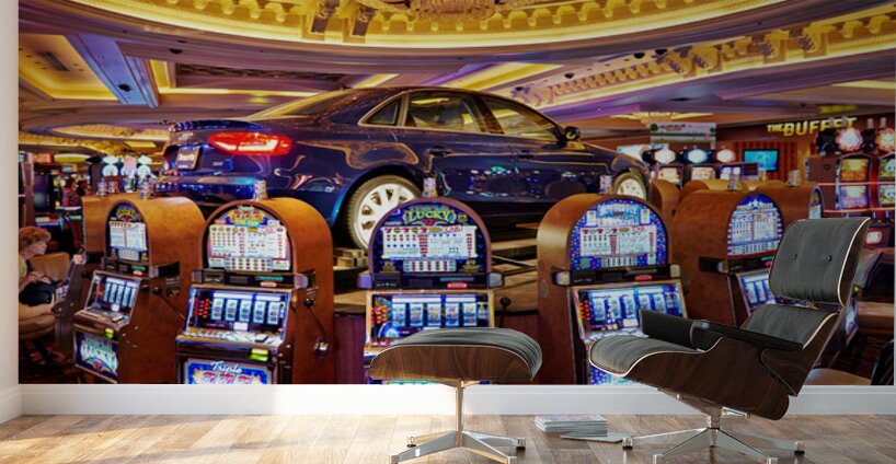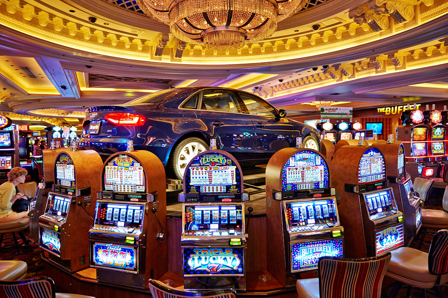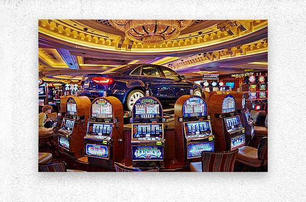A blue car sits atop slot machines in a casino. People are enjoying games and trying their luck in Las Vegas.