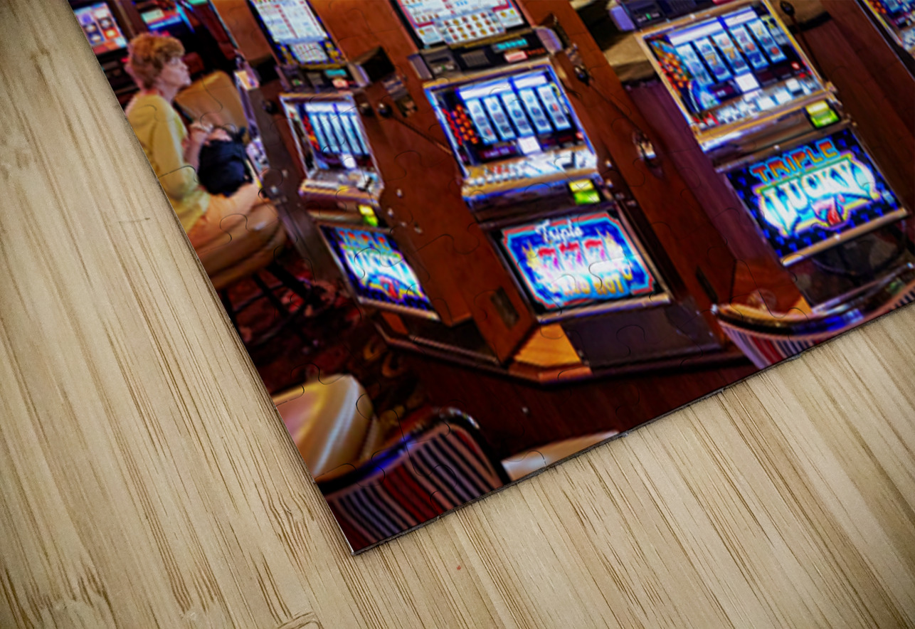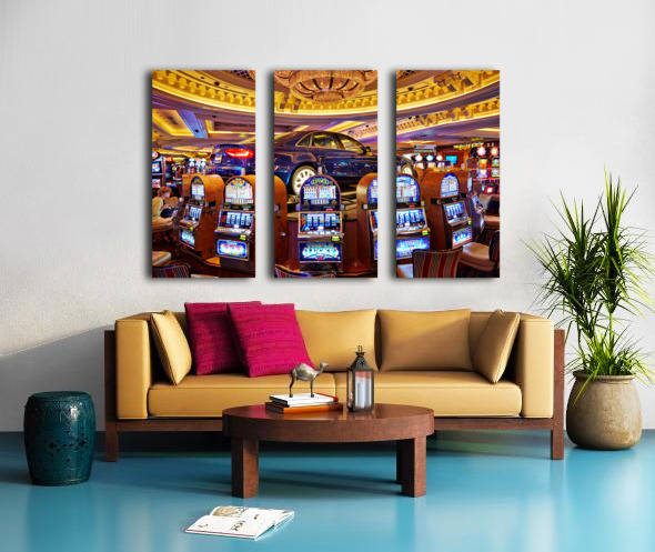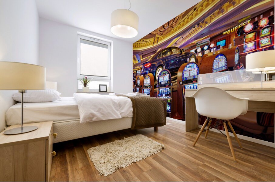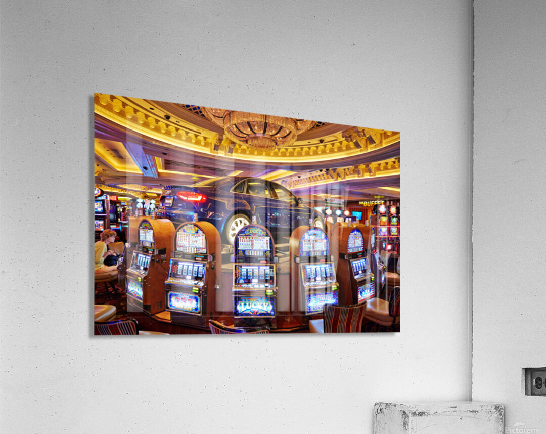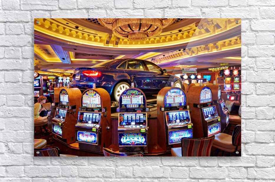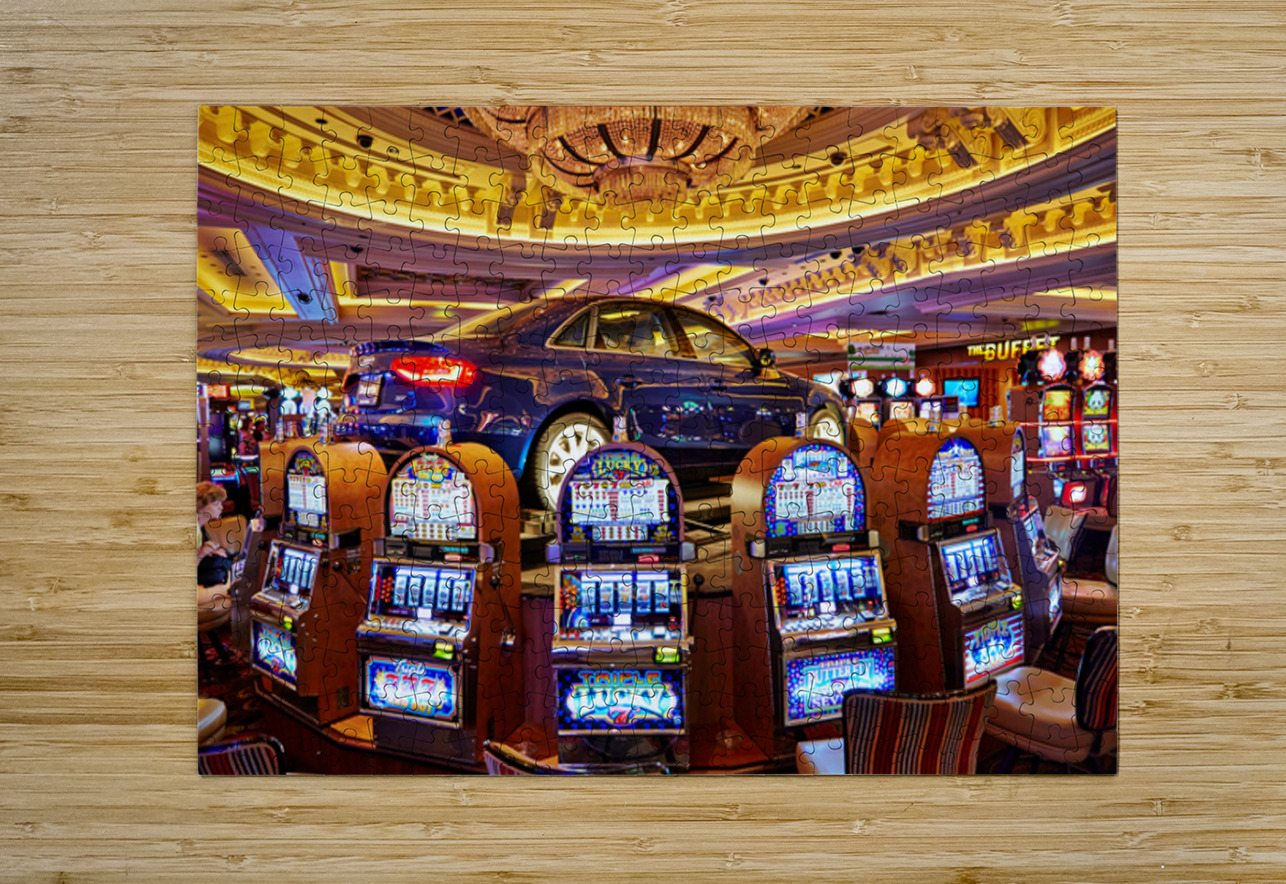 A blue car sits atop slot machines in a casino. People are enjoying games and trying their luck in Las Vegas.