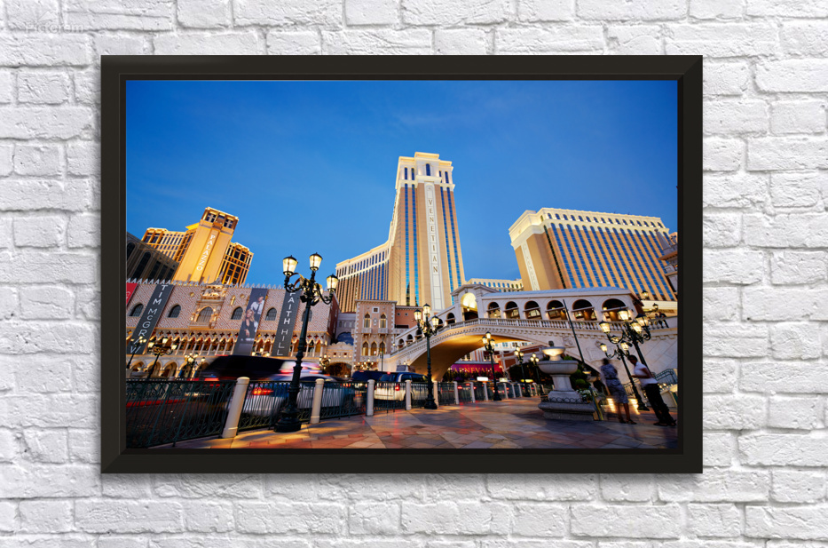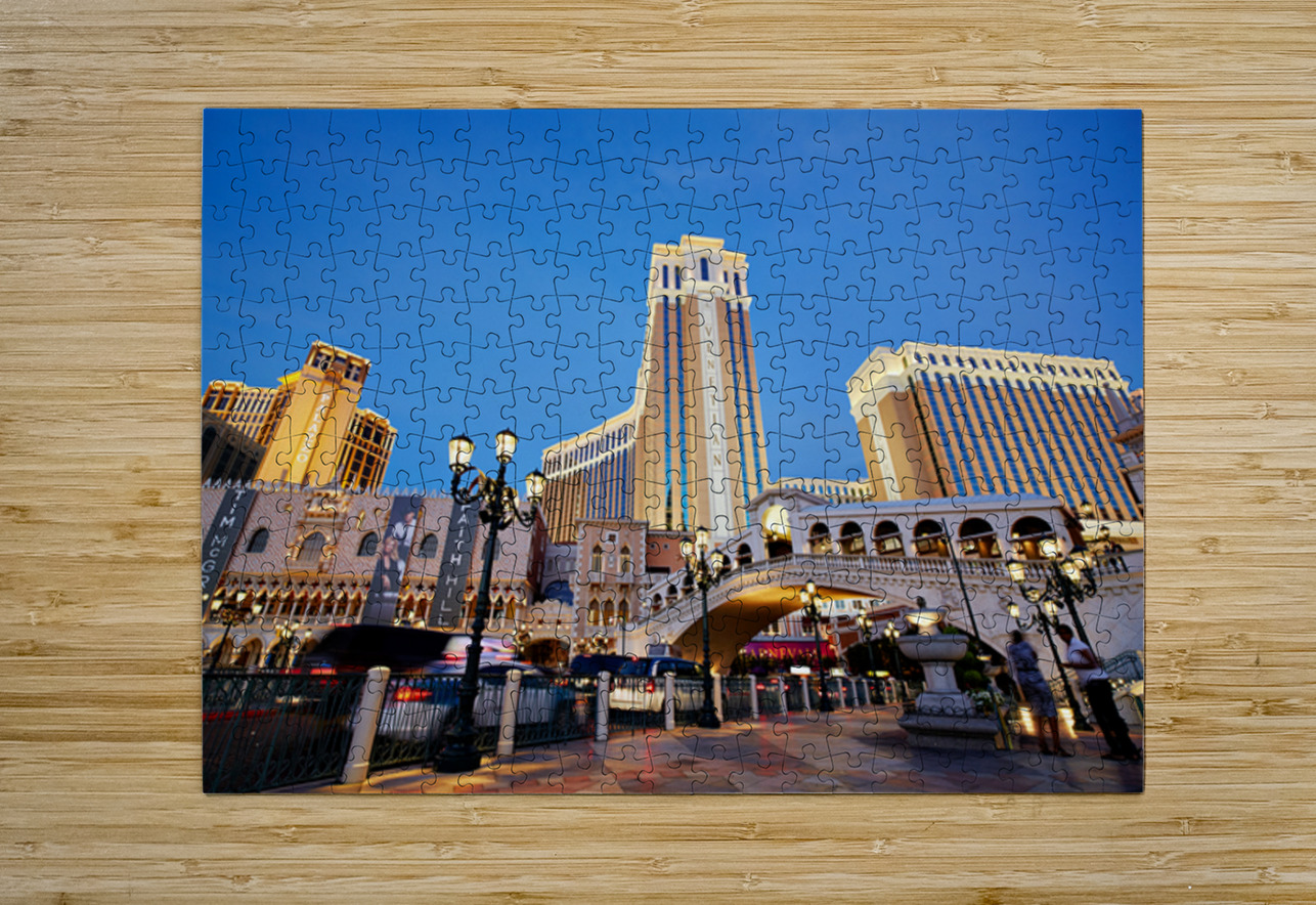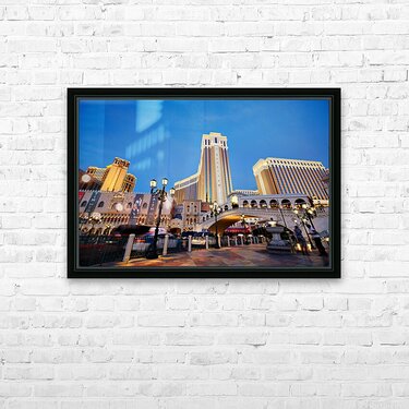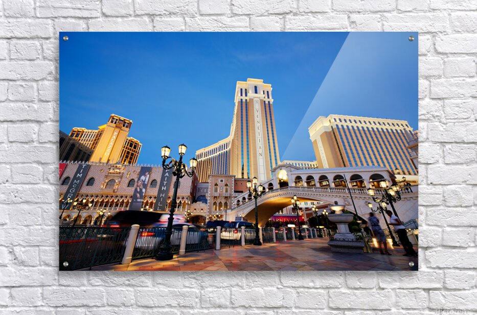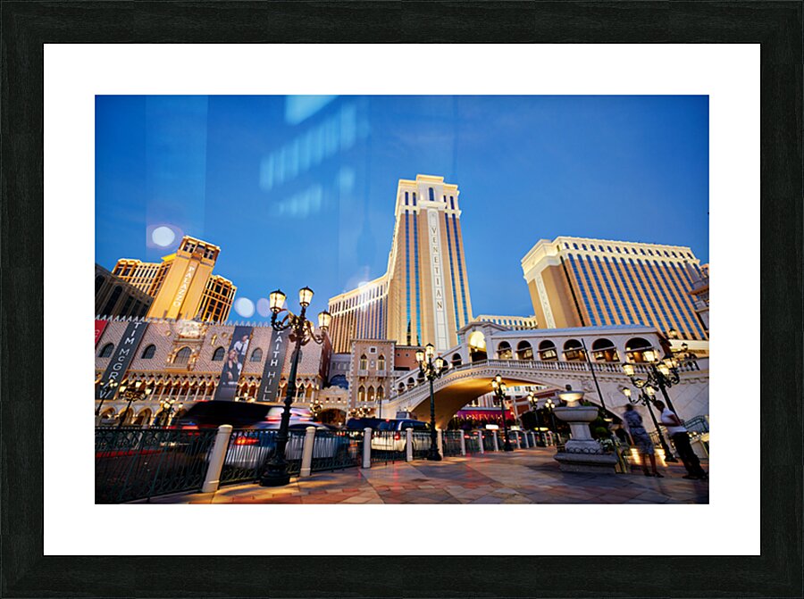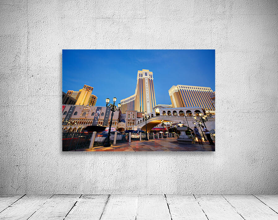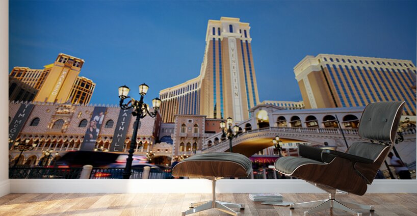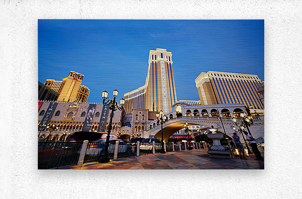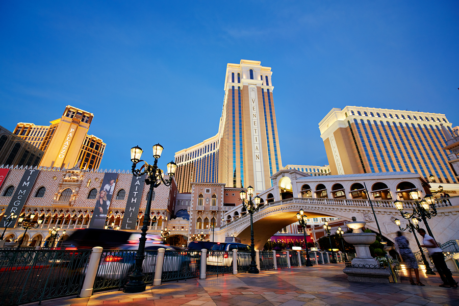 The Venetian Hotel in Las Vegas stands tall at sunset. Lights brighten the buildings. People walk by as evening falls.