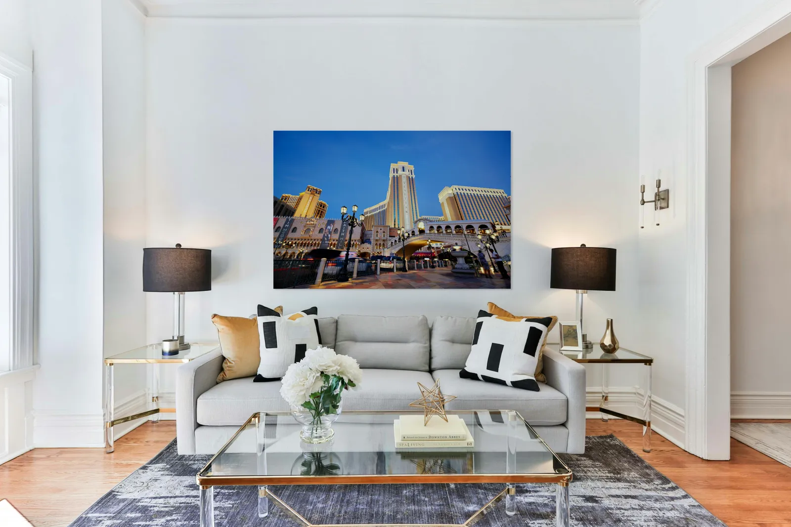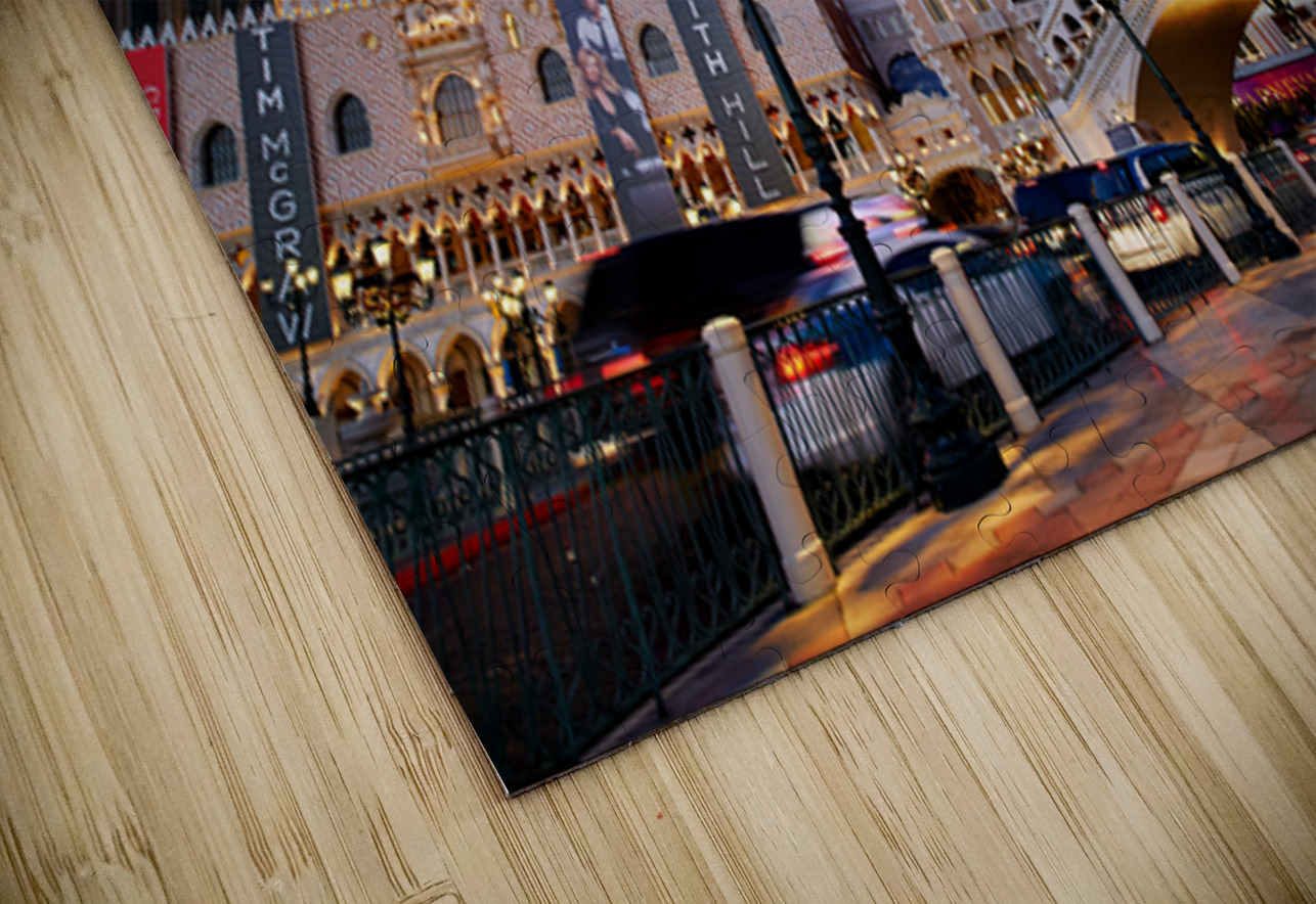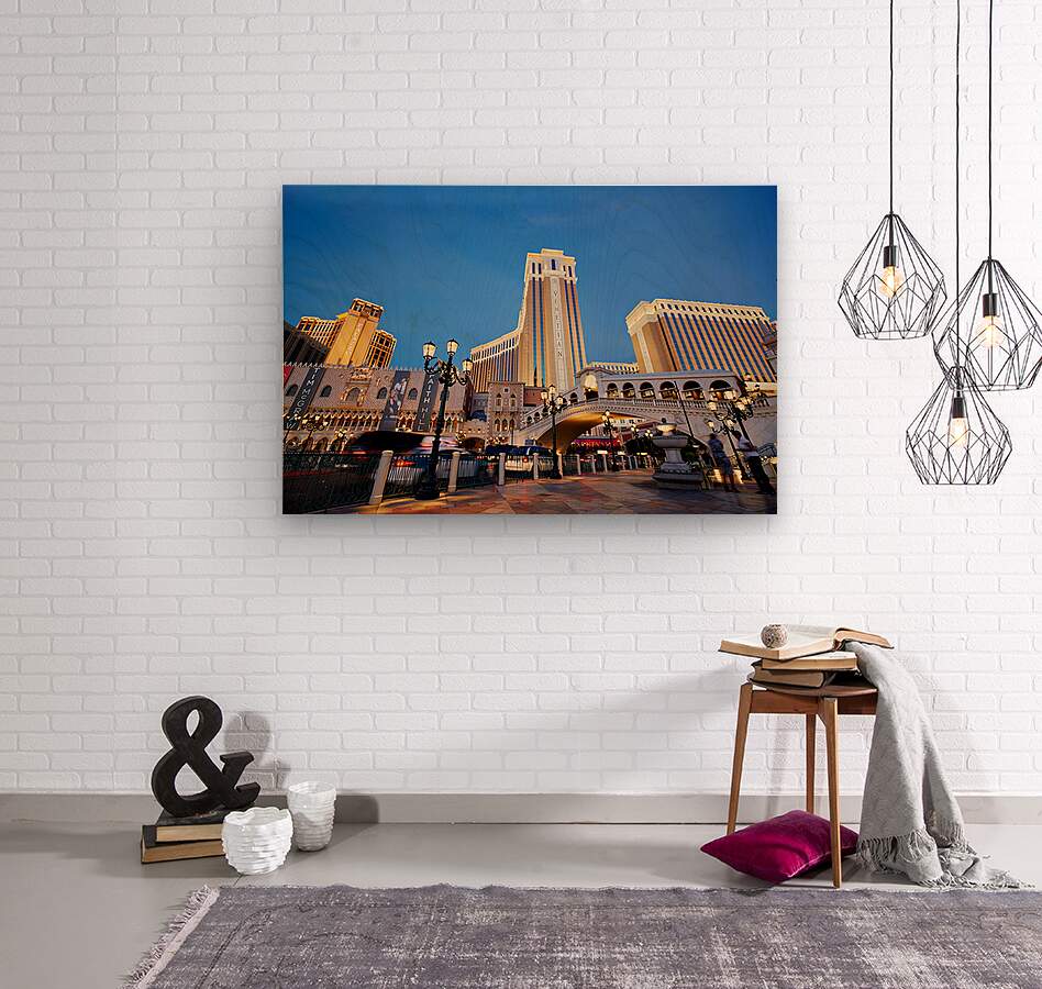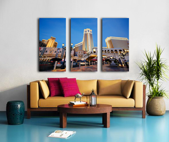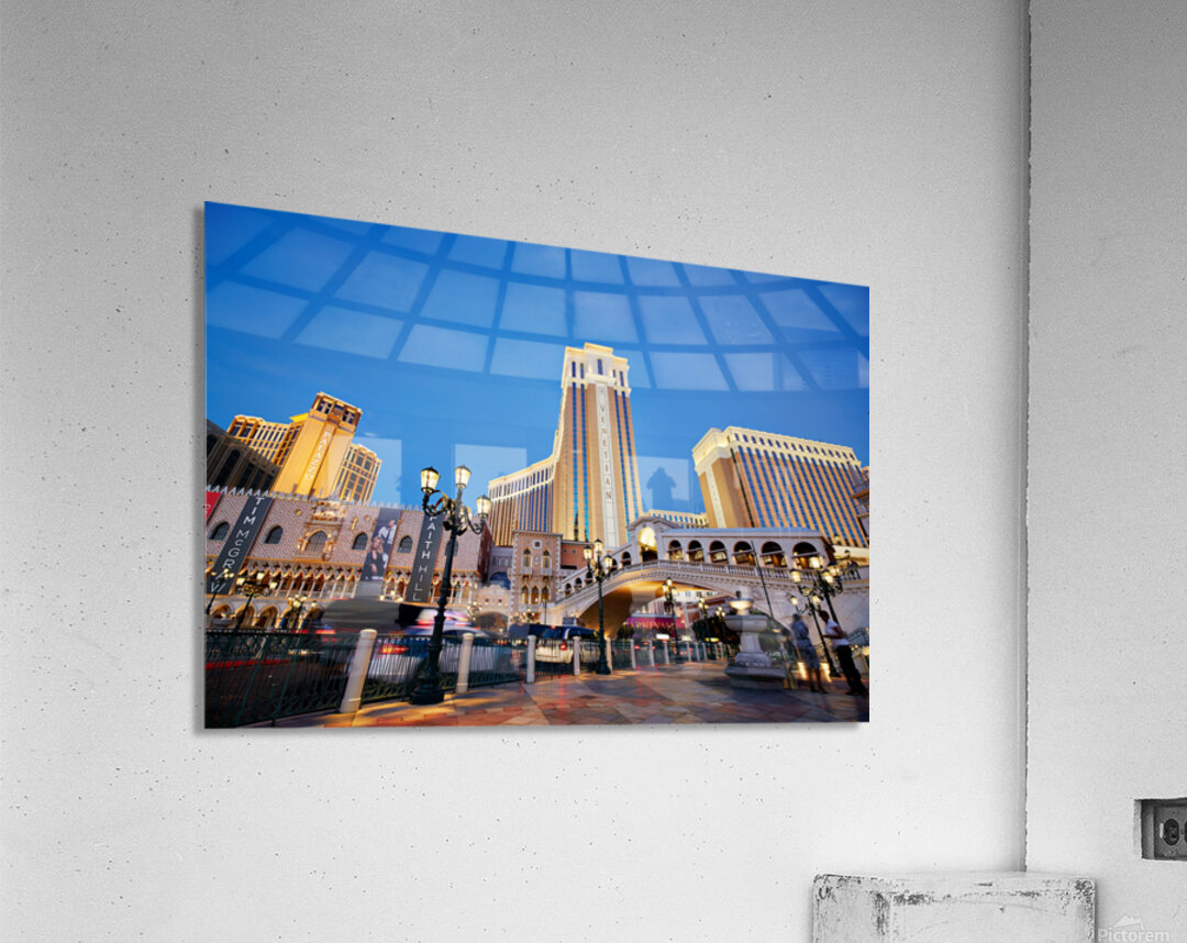 The Venetian Hotel in Las Vegas stands tall at sunset. Lights brighten the buildings. People walk by as evening falls.