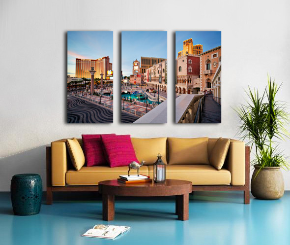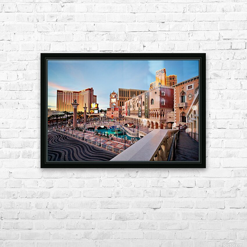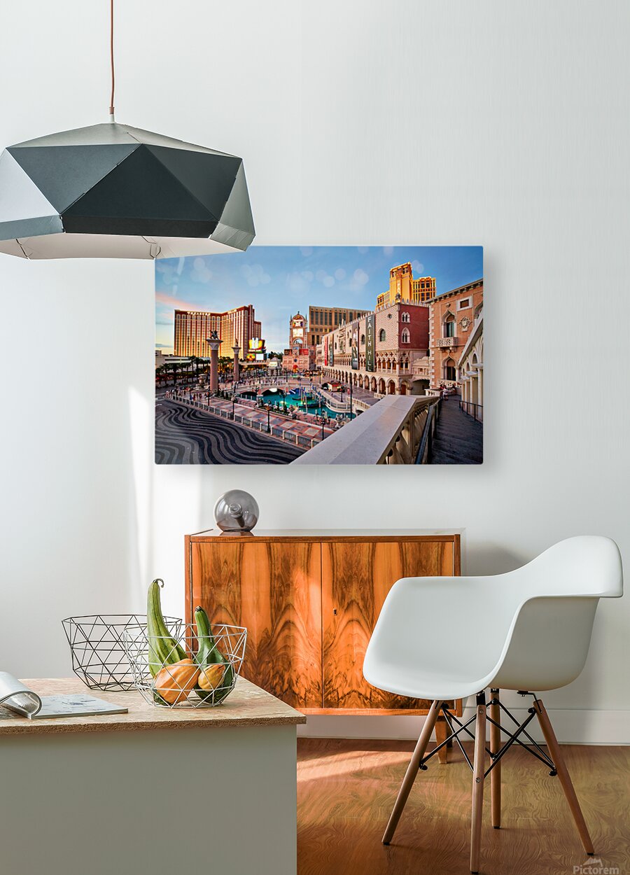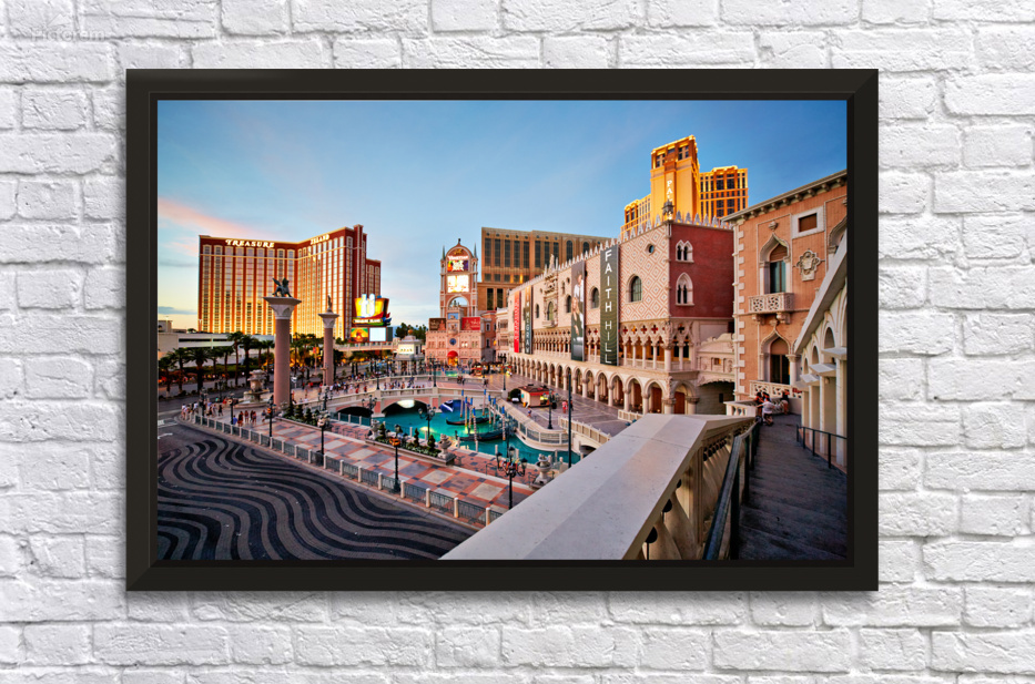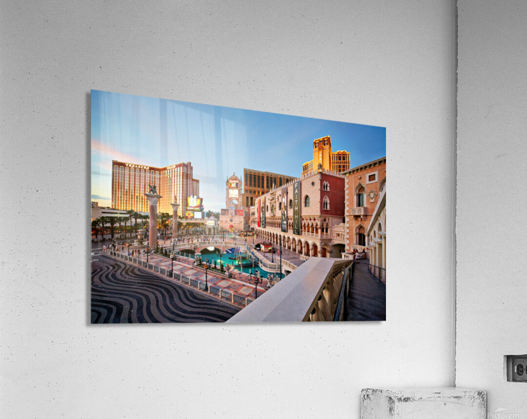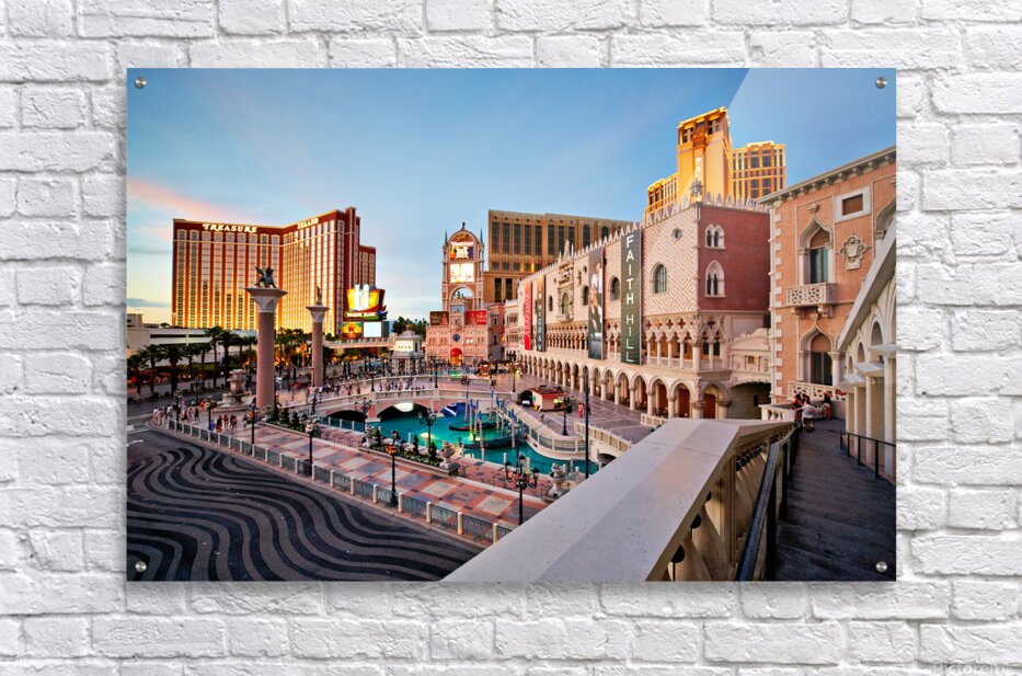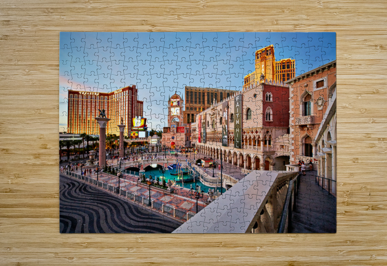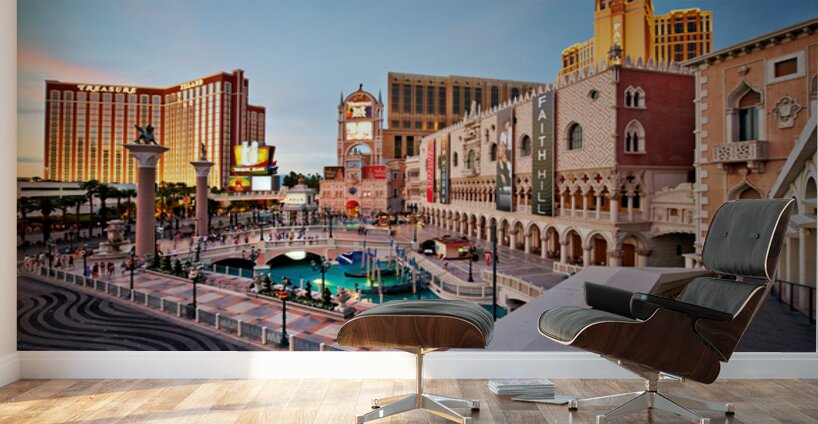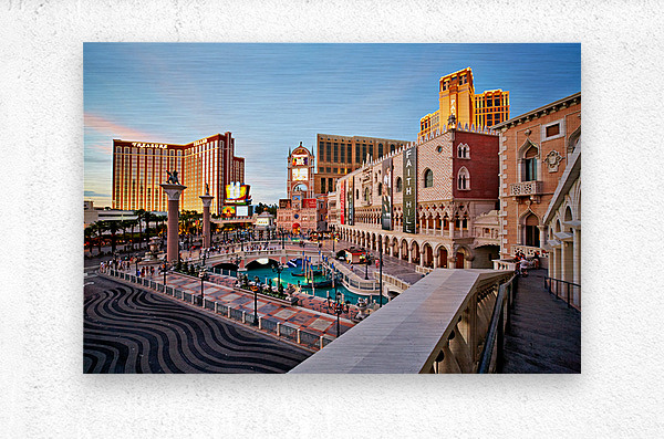 The scene shows the Venetian Hotel in Las Vegas during sunset. People walk and enjoy the atmosphere in front of the hotel.