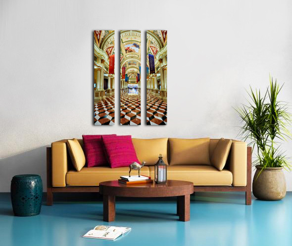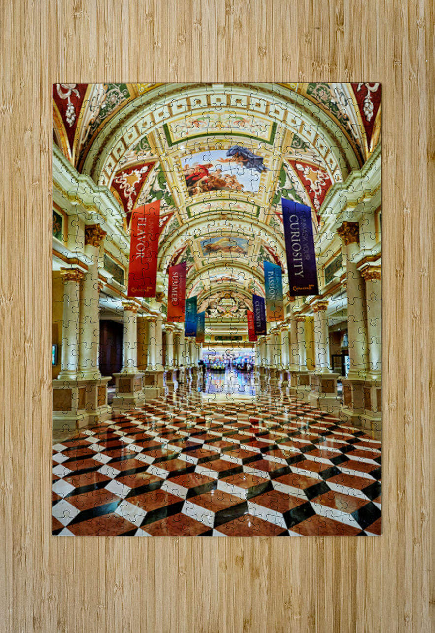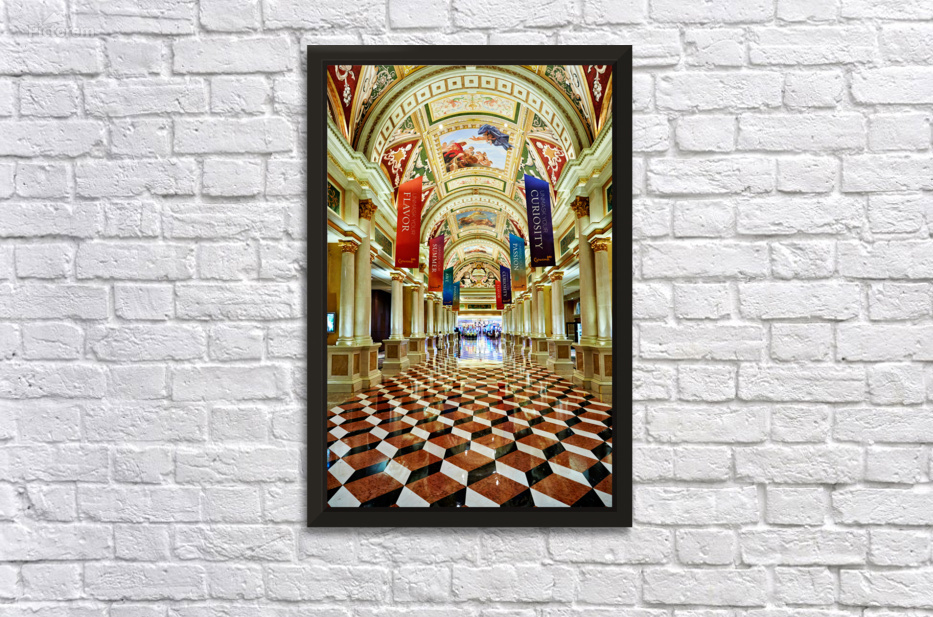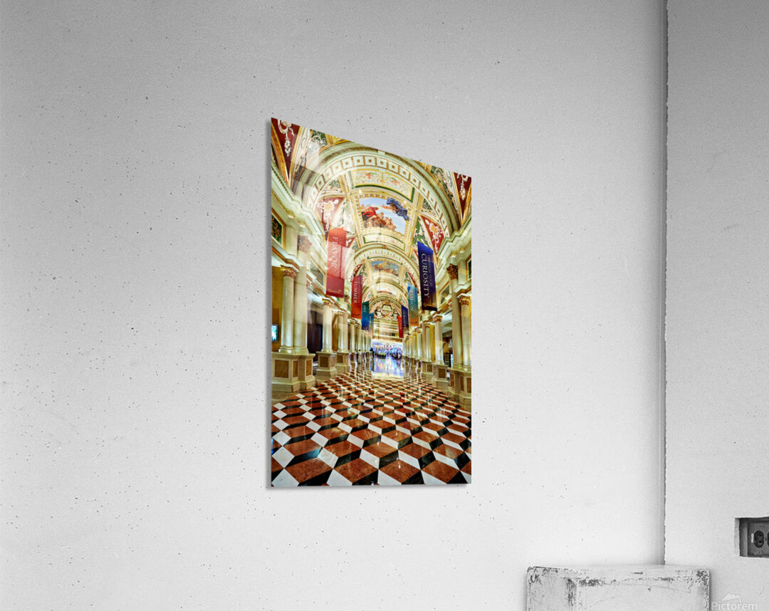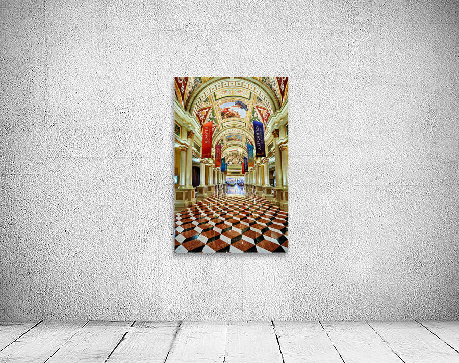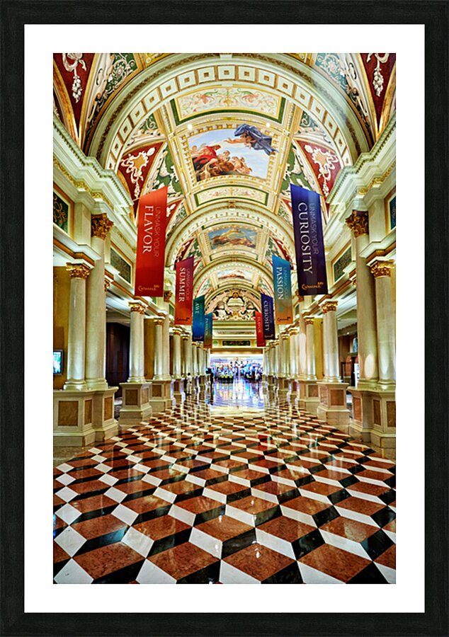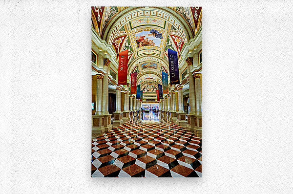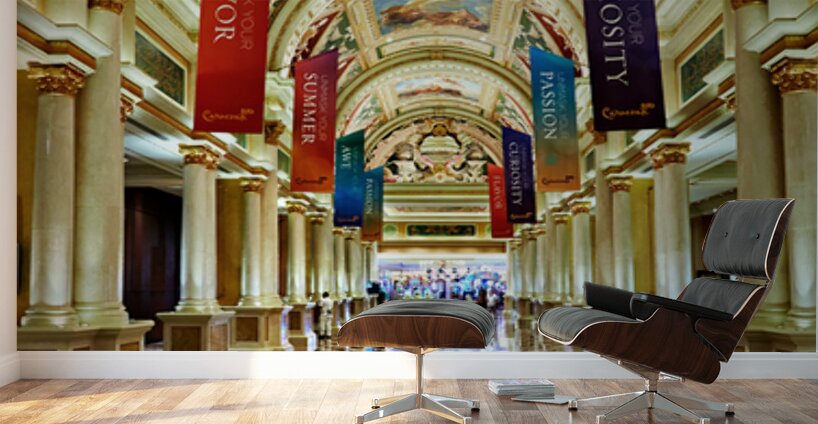 Visitors walk through the lobby of the Venetian Hotel in Las Vegas. The ceiling features art and banners hang from the columns.