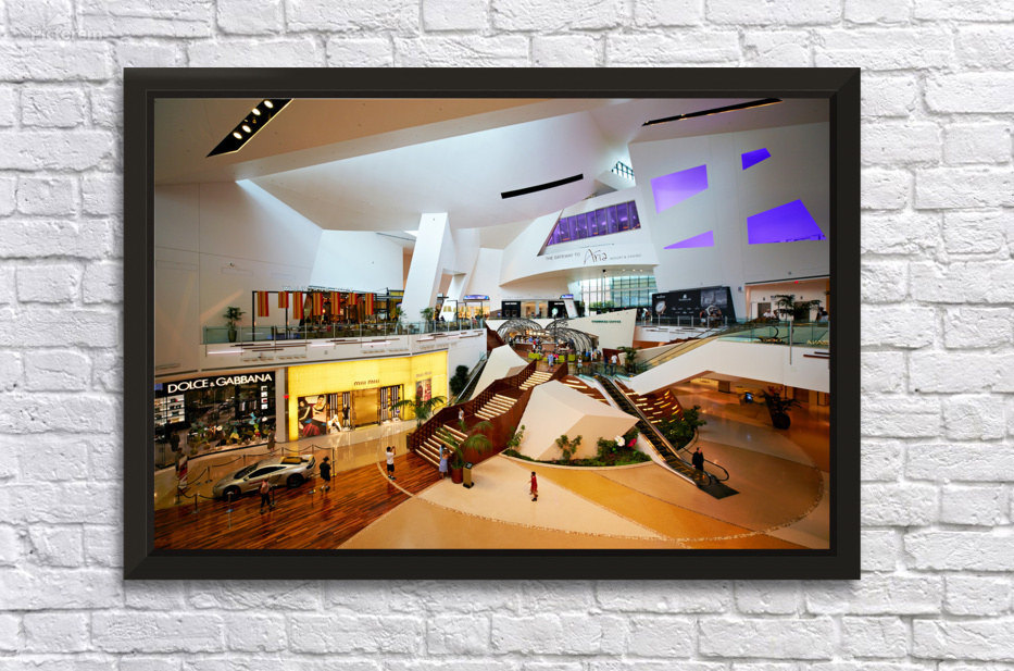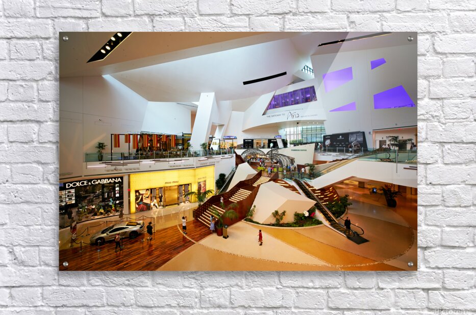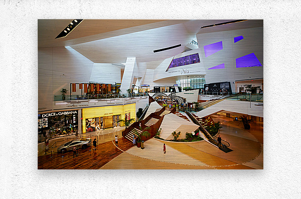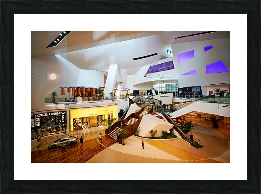 Visitors walk through Crystals Mall in City Center Las Vegas. Various shops and eateries are visible in the modern architecture.