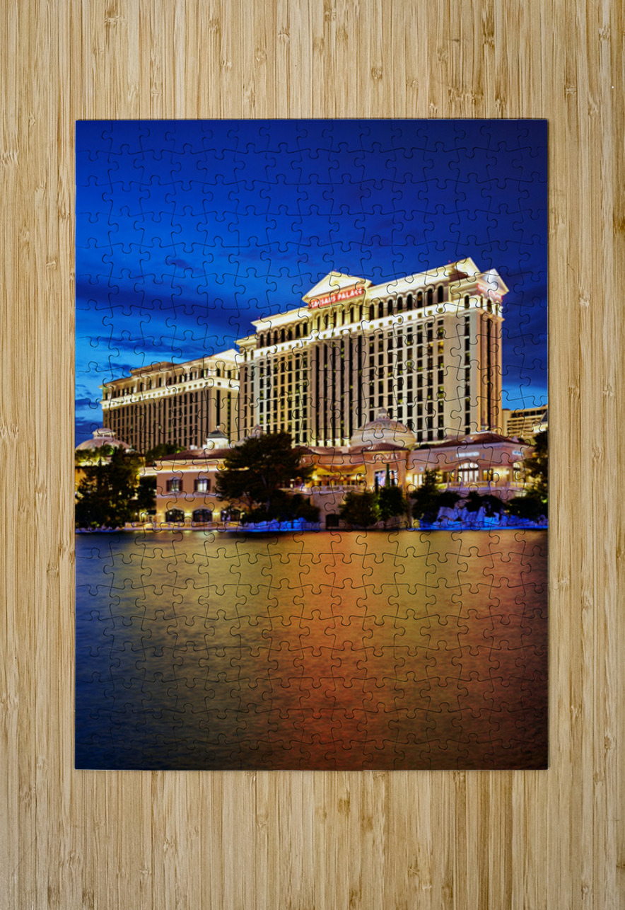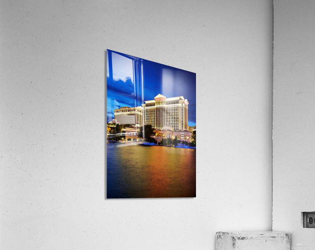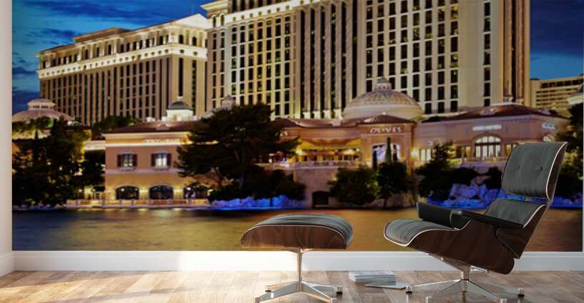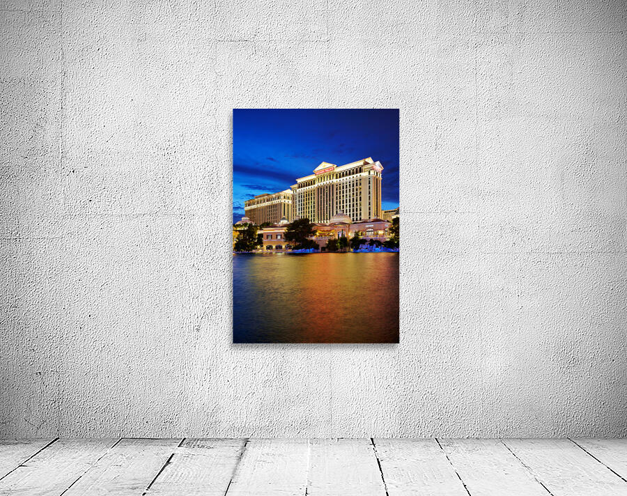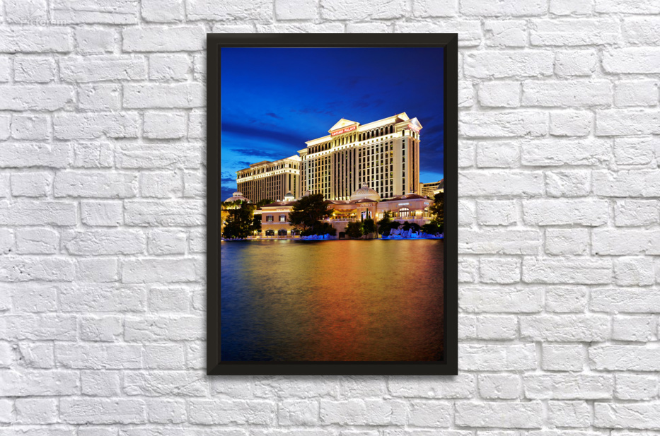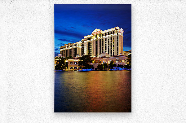 The Bellagio Hotel and Casino stands illuminated at night with reflections on the water in Las Vegas Nevada. Visitors enjoy the scene.
