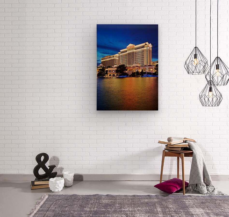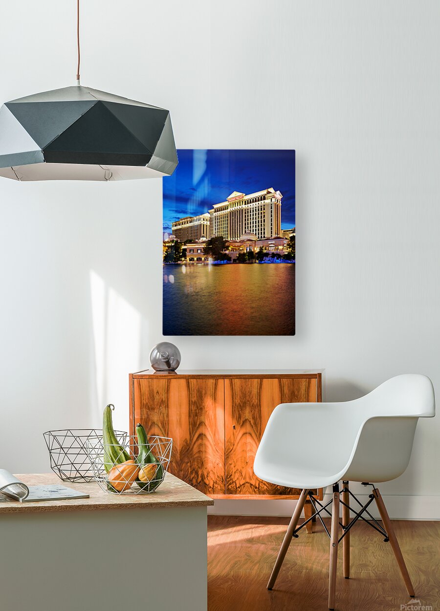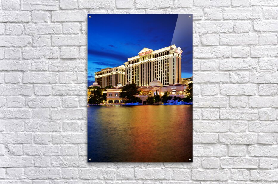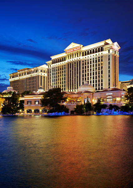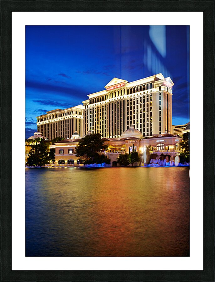The Bellagio Hotel and Casino stands illuminated at night with reflections on the water in Las Vegas Nevada. Visitors enjoy the scene.