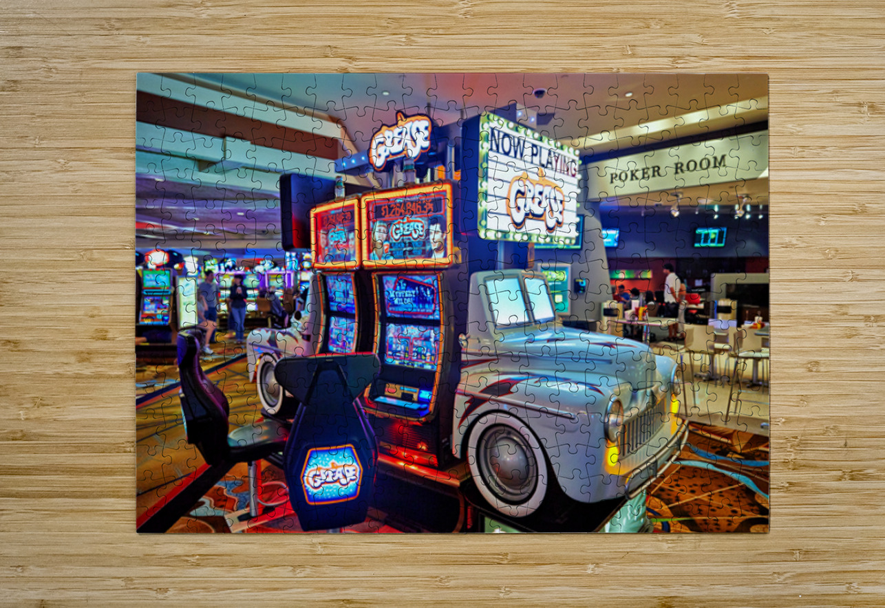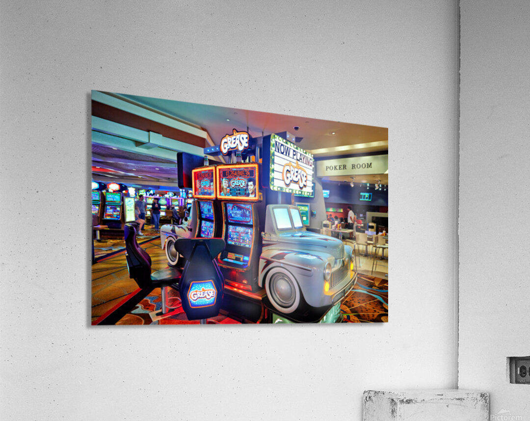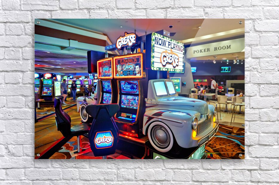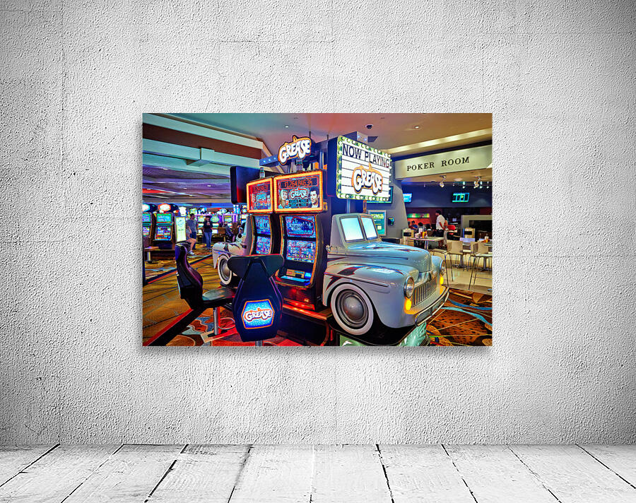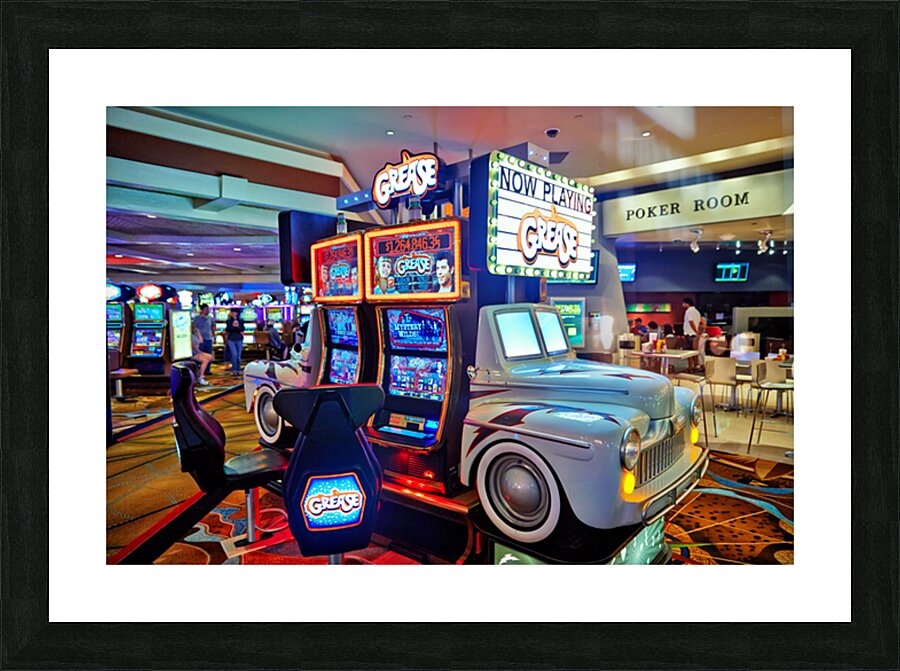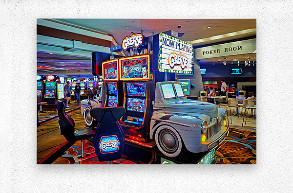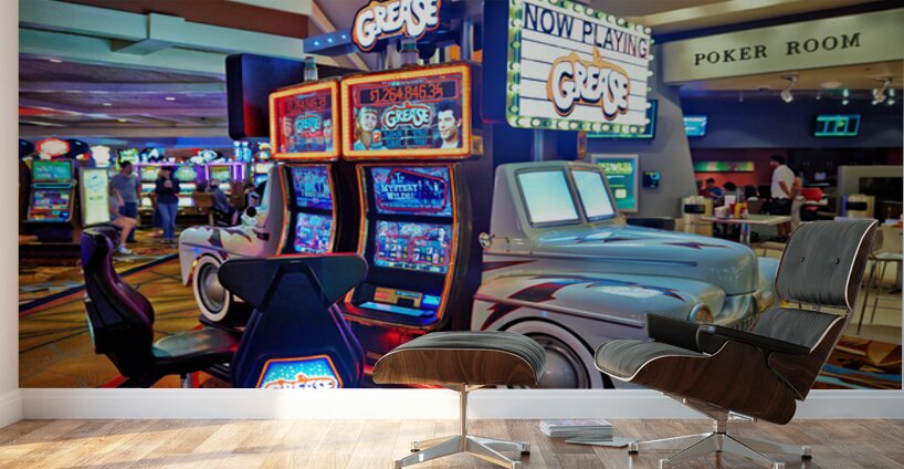 Visitors are playing the Grease slot machine at Treasure Island Casino in Las Vegas. The casino is lively with various games around.